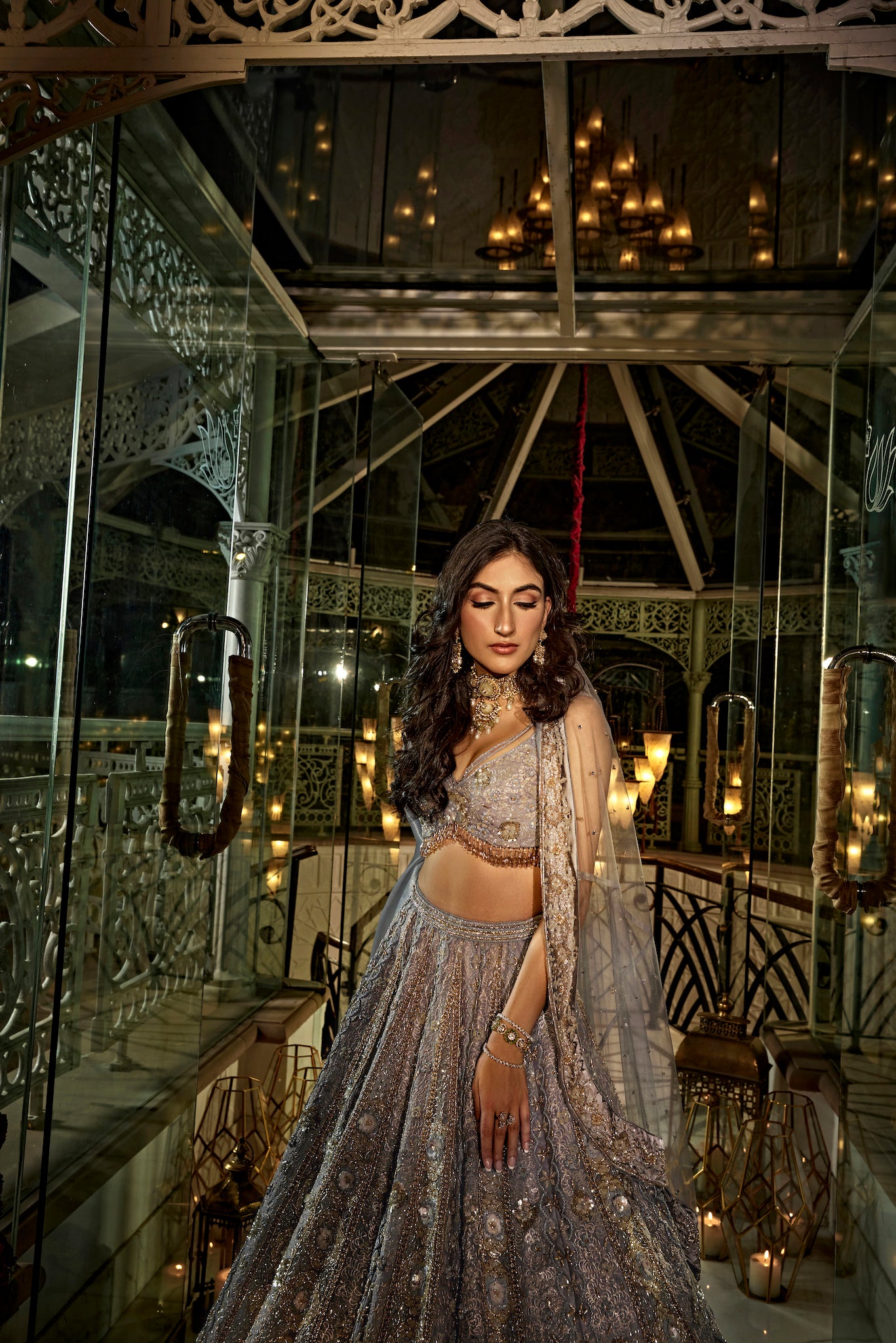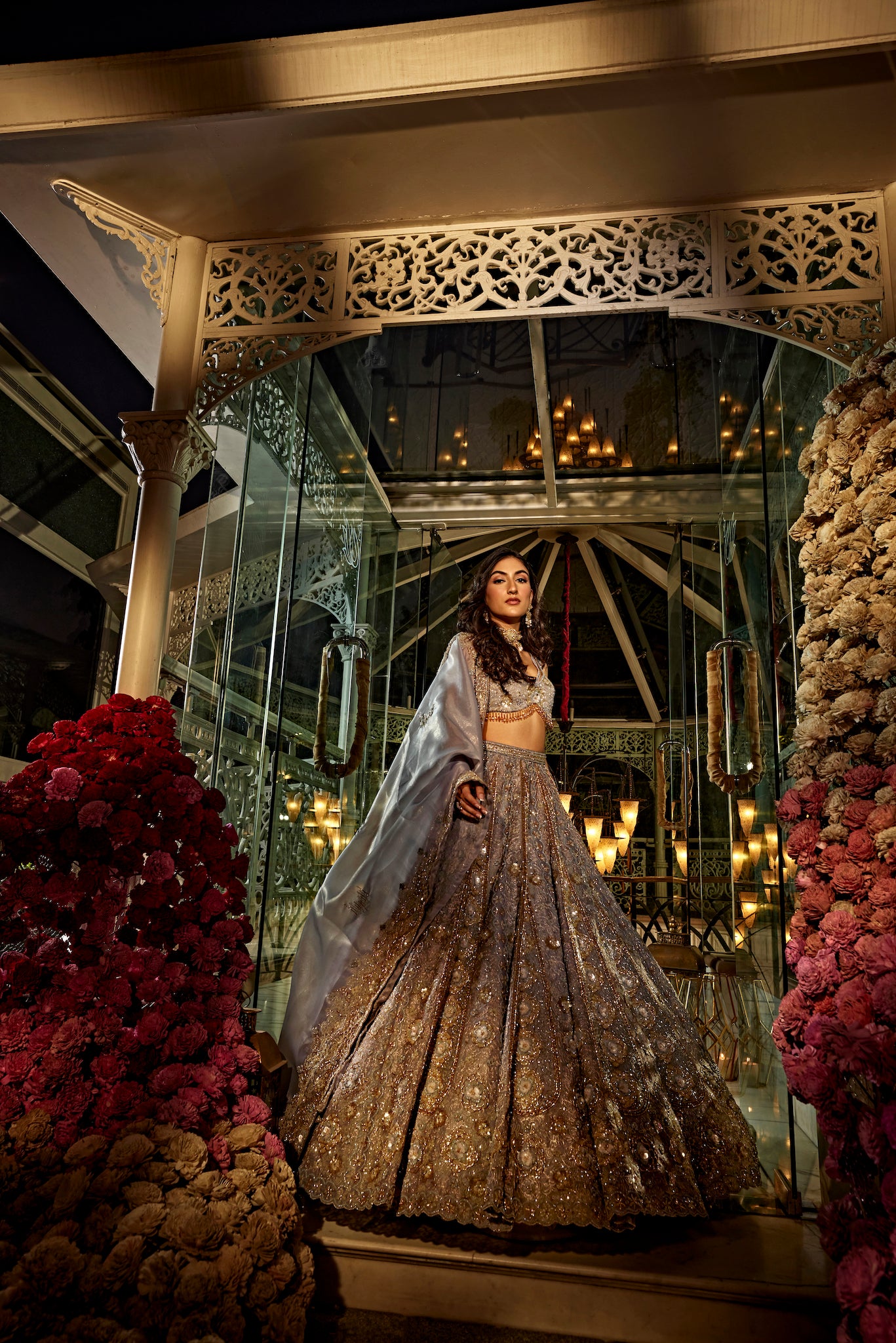 Featuring a blue lehenga, meticulously hand-embroidered on tissue fabric with crystals, cutdana, sequin, thread, beads and zari detailing. The blouse shows crystal tassels at the waist. Paired with a cutdana and crystal detailed matching dupatta with embroidery on all four sides.