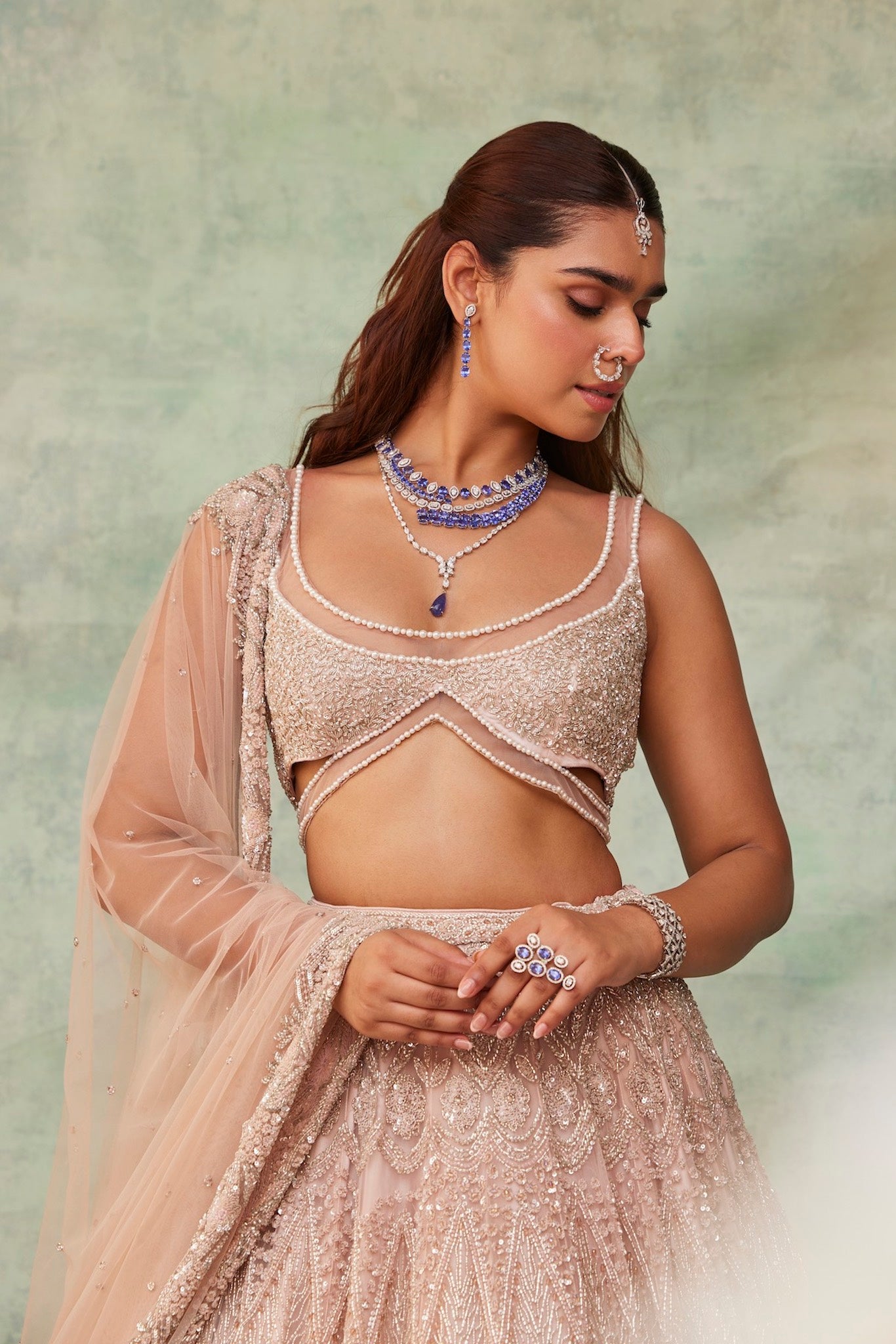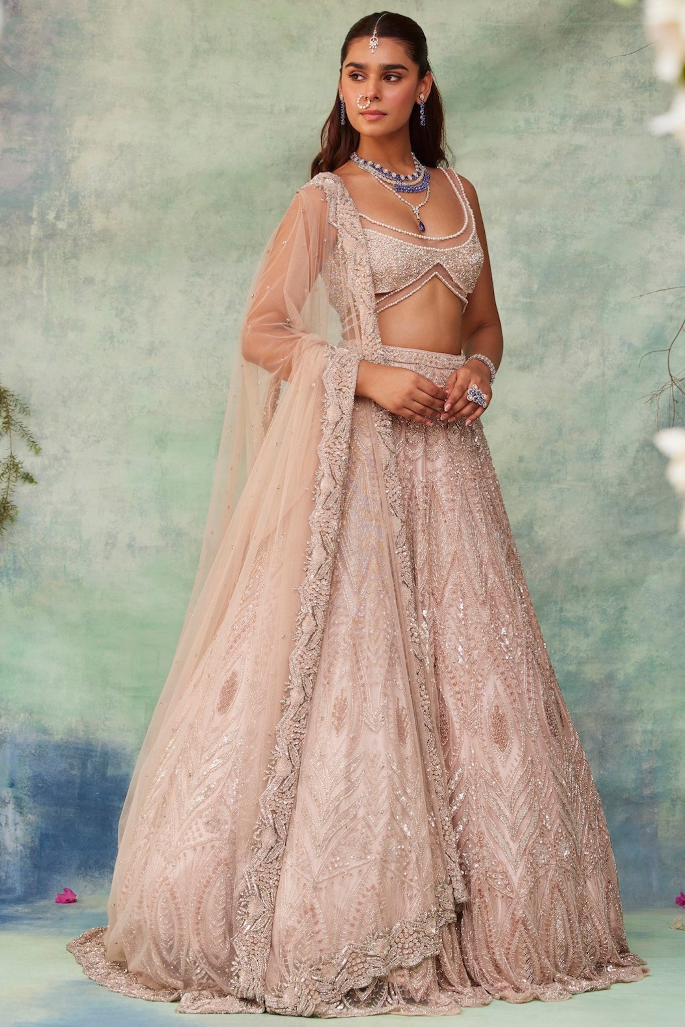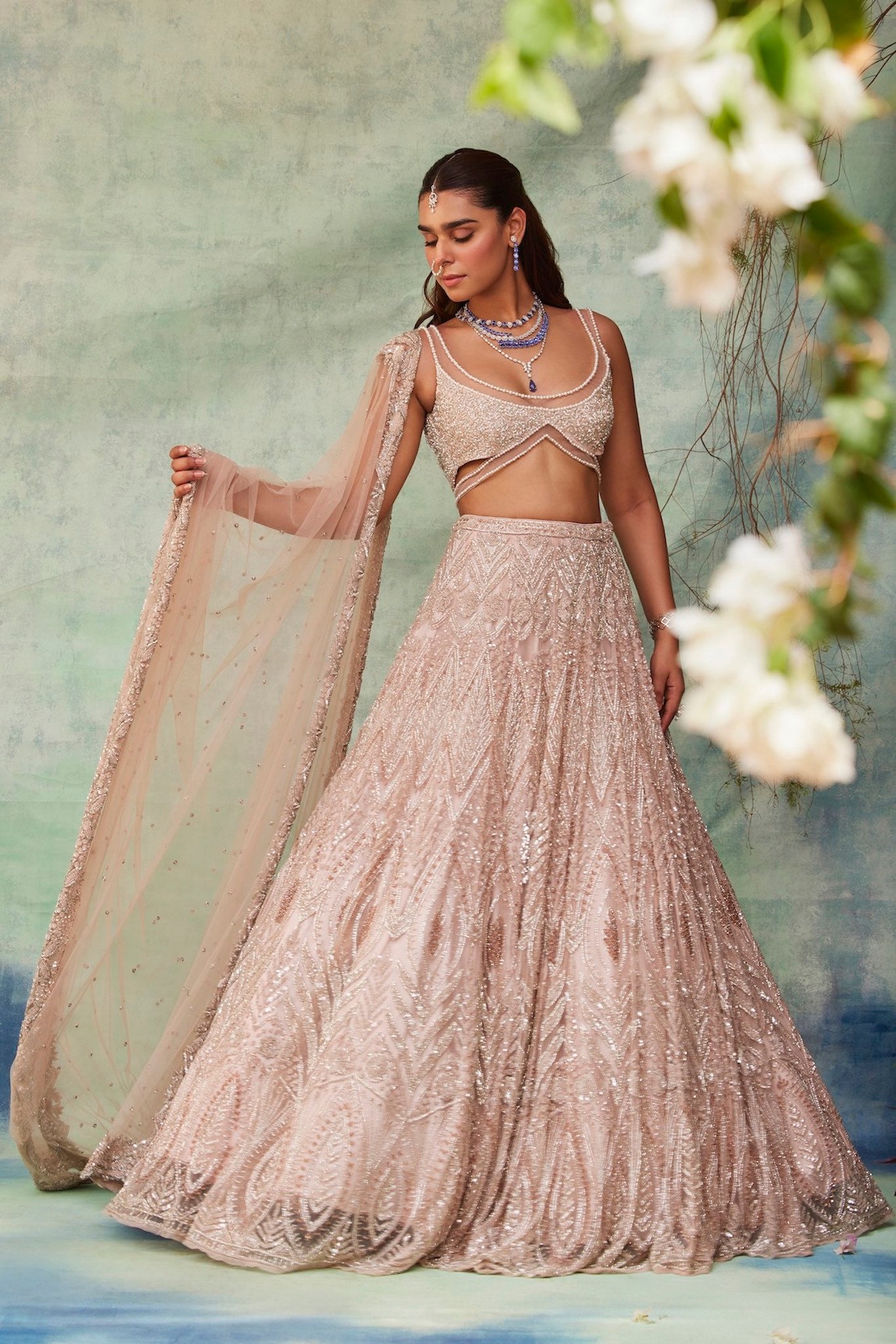 Featuring a blush pink lehenga, meticulously hand-embroidered on tulle fabric with crystals, cutdana, sequin, beads detailing. The blouse shows crystal tassels at the waist. Paired with a cutdana and crystal detailed matching dupatta with embroidery on all four sides.