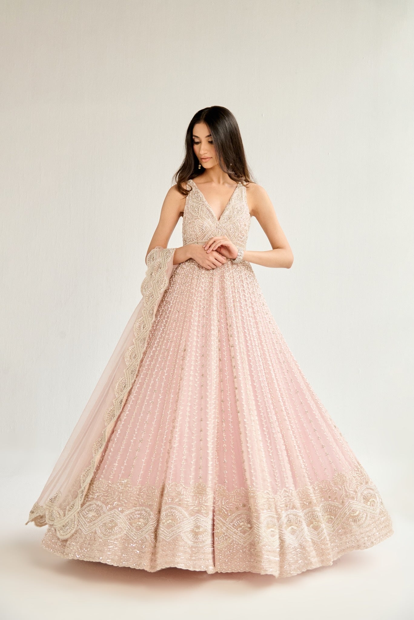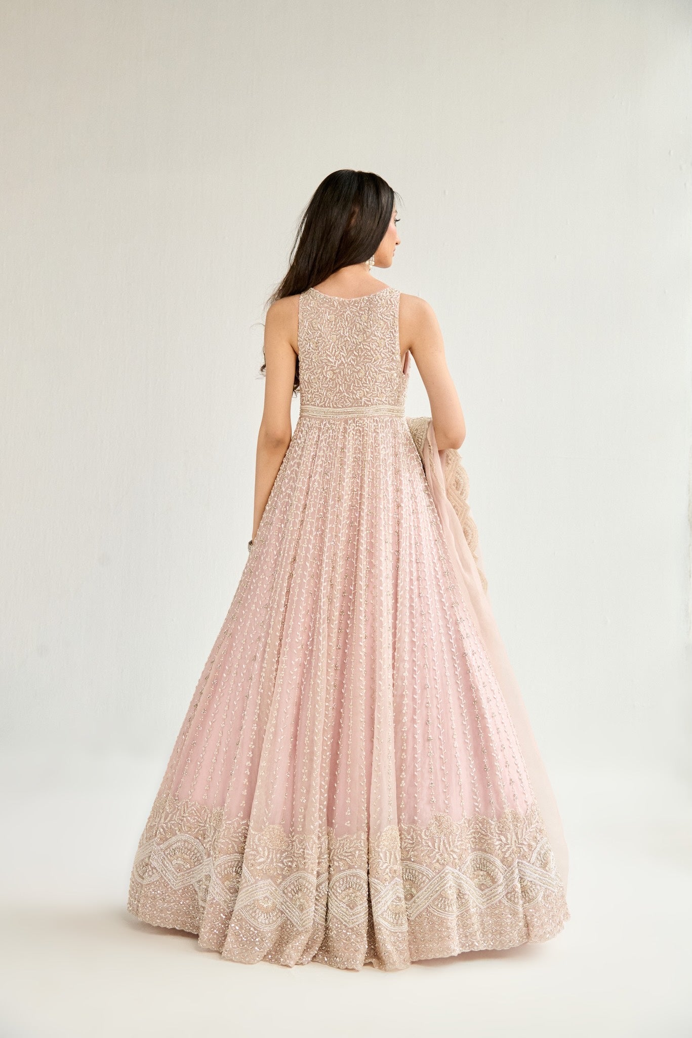 Featuring a blush pink anarkali suit, meticulously hand-embroidered on organza fabric with cutdana, pearl and crystal detailing and skirt . Paired with a cutdana, crystal and pearl detailed scalloped dupatta.