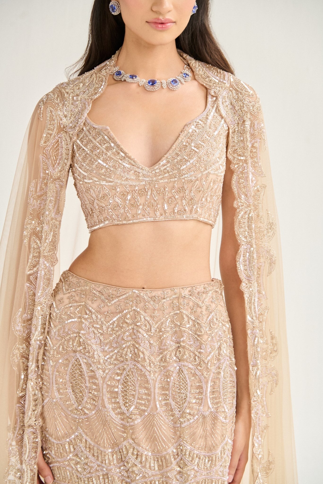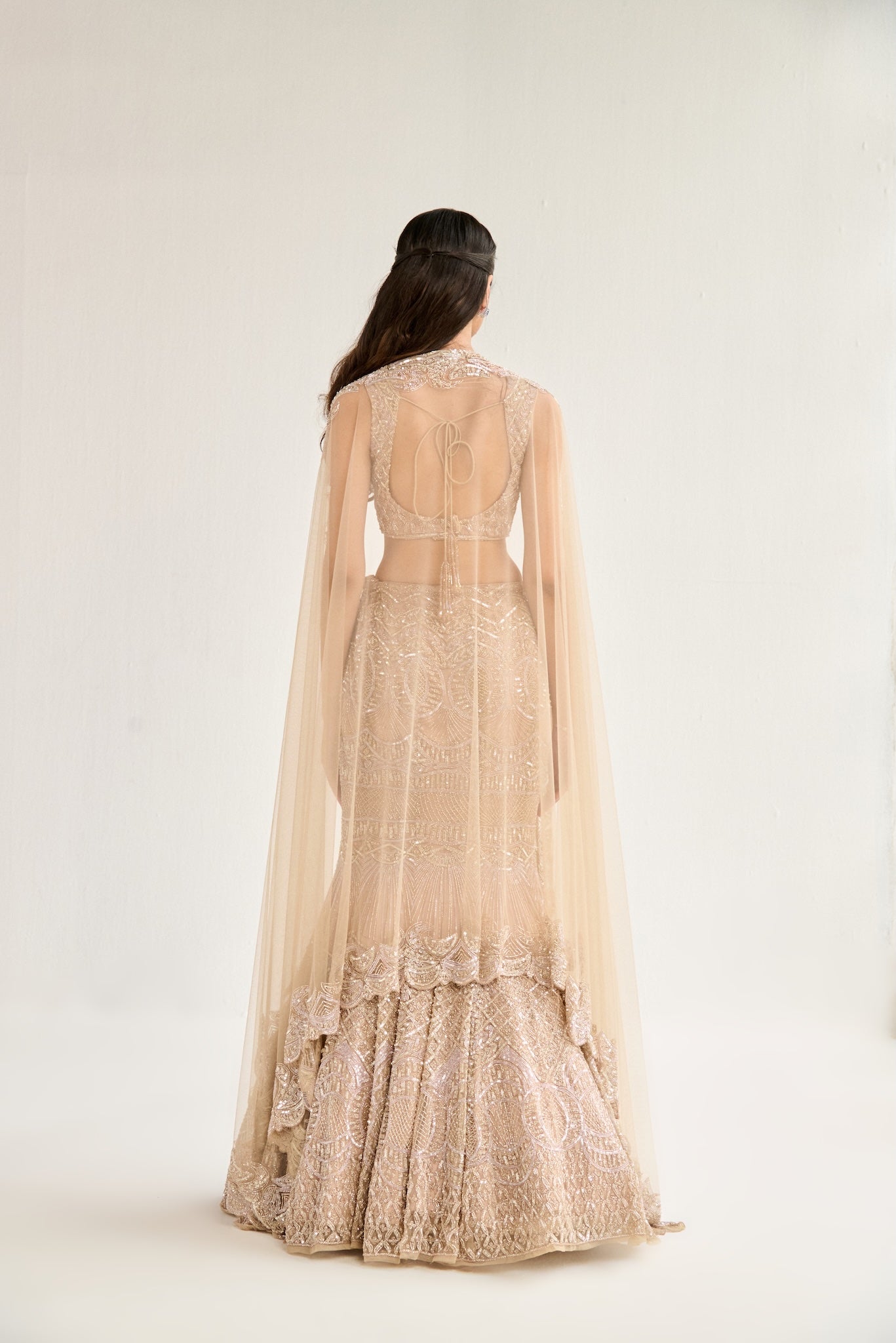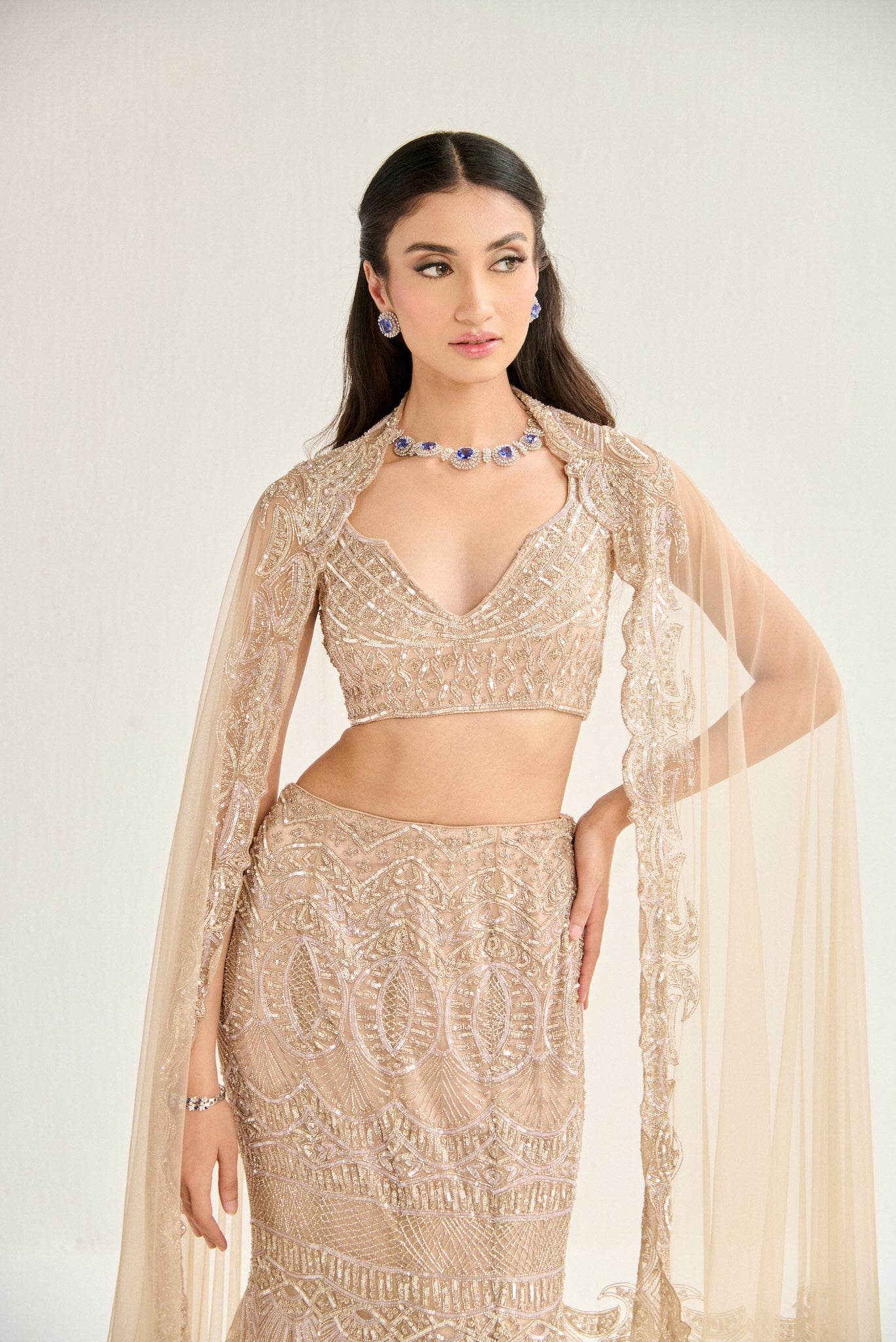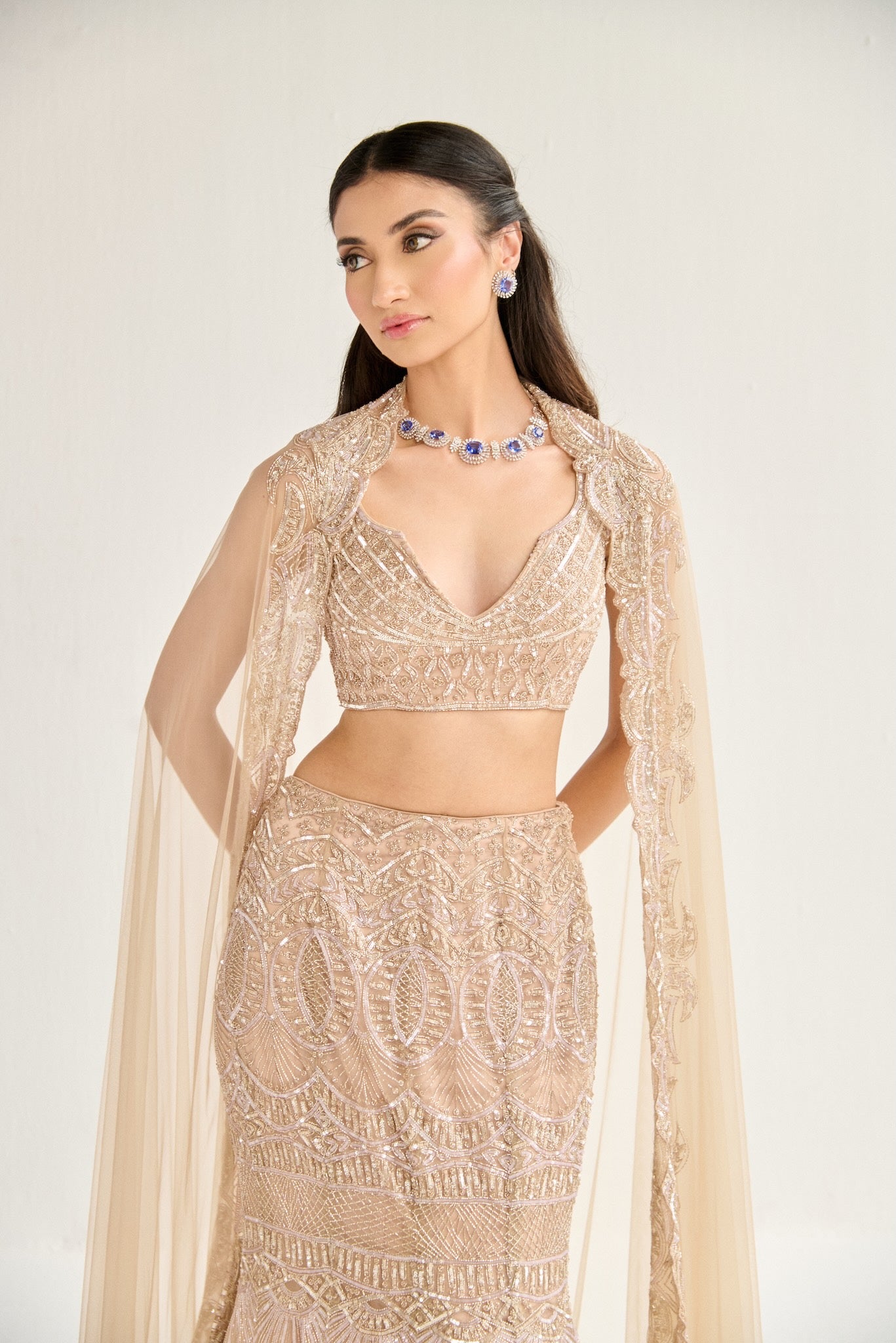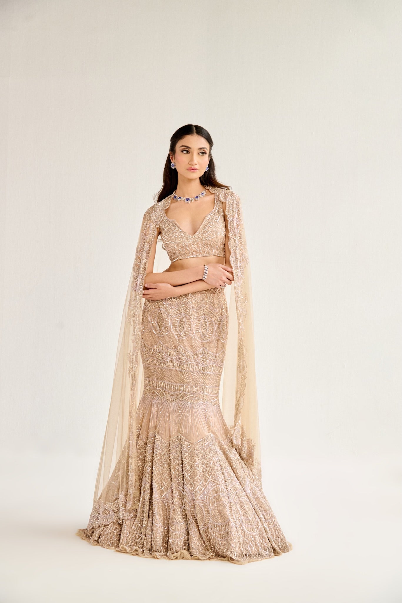 Featuring an champagne fish cut lehenga, meticulously hand-embroidered on tulle fabric with cutdana ,beads and sequin detailing. Paired with a cutdana and sequin detailed matching dupatta with embroidery on all four sides.