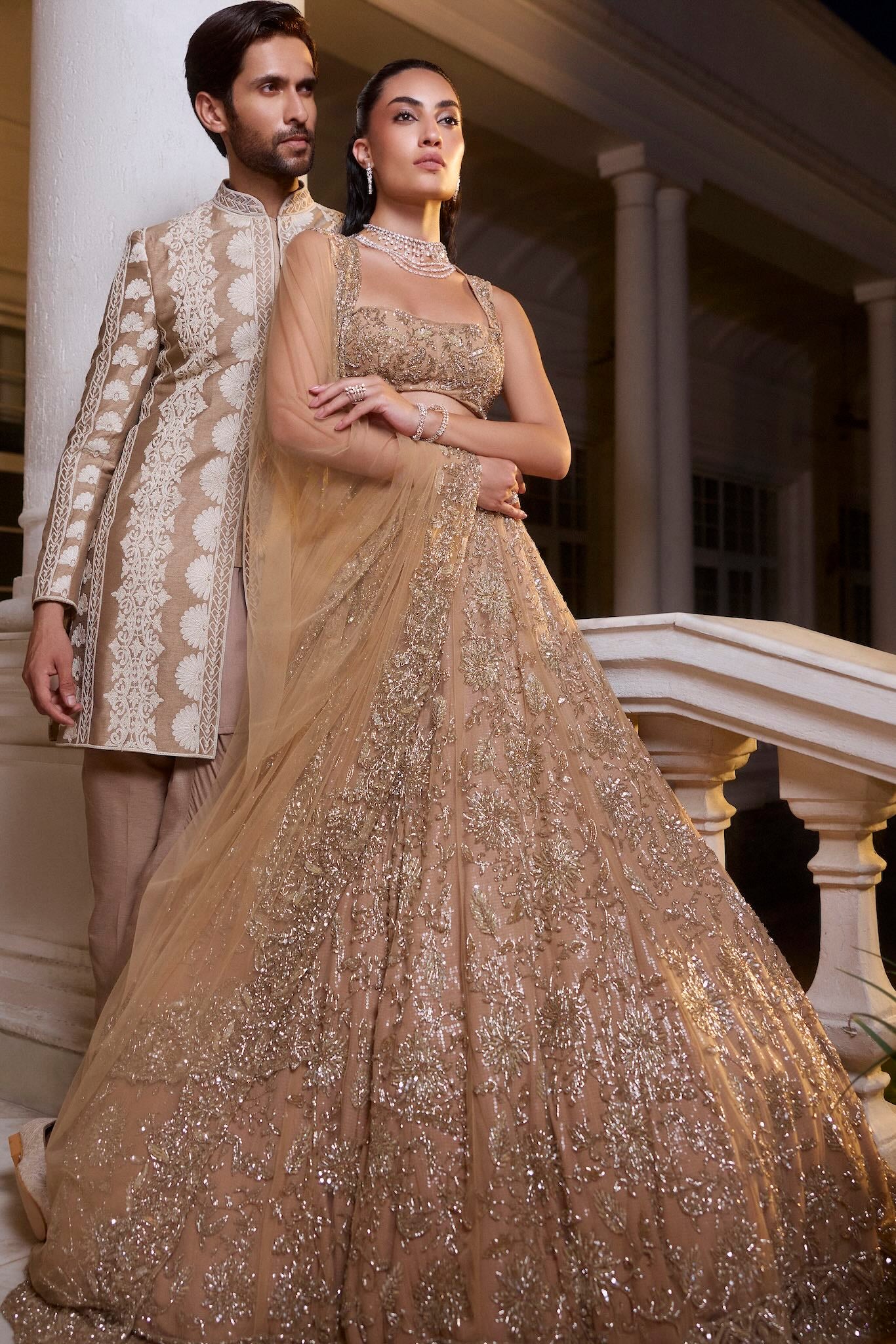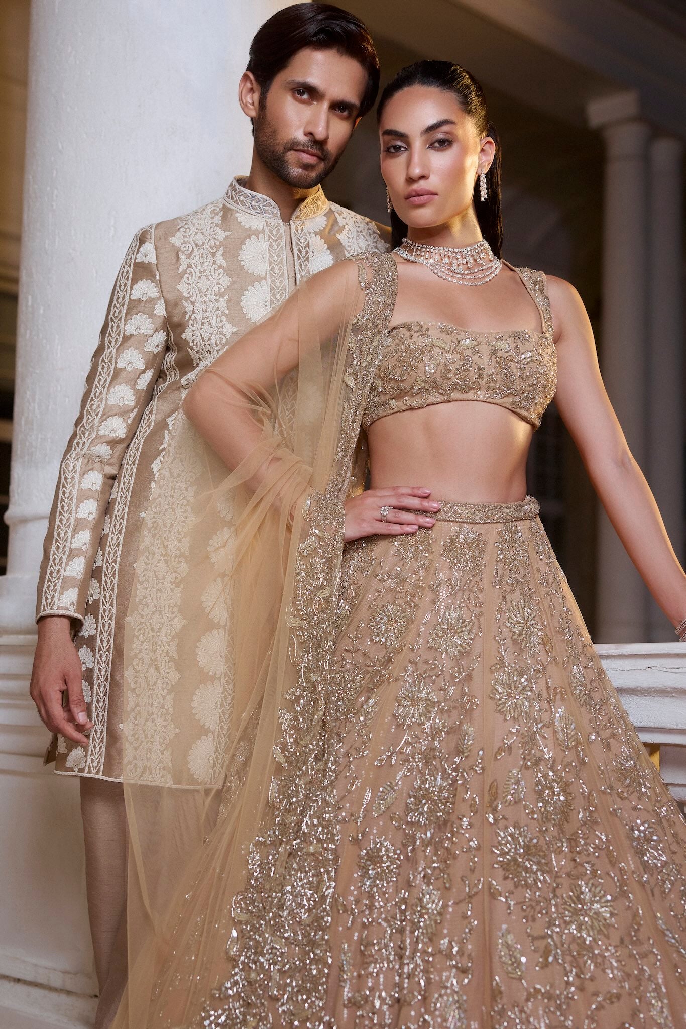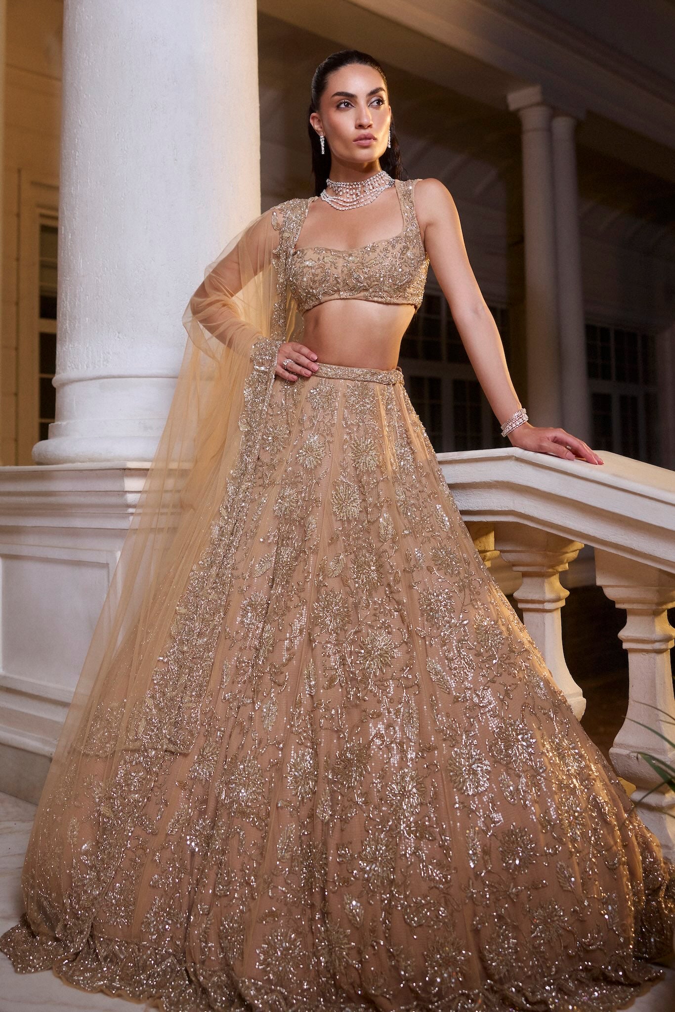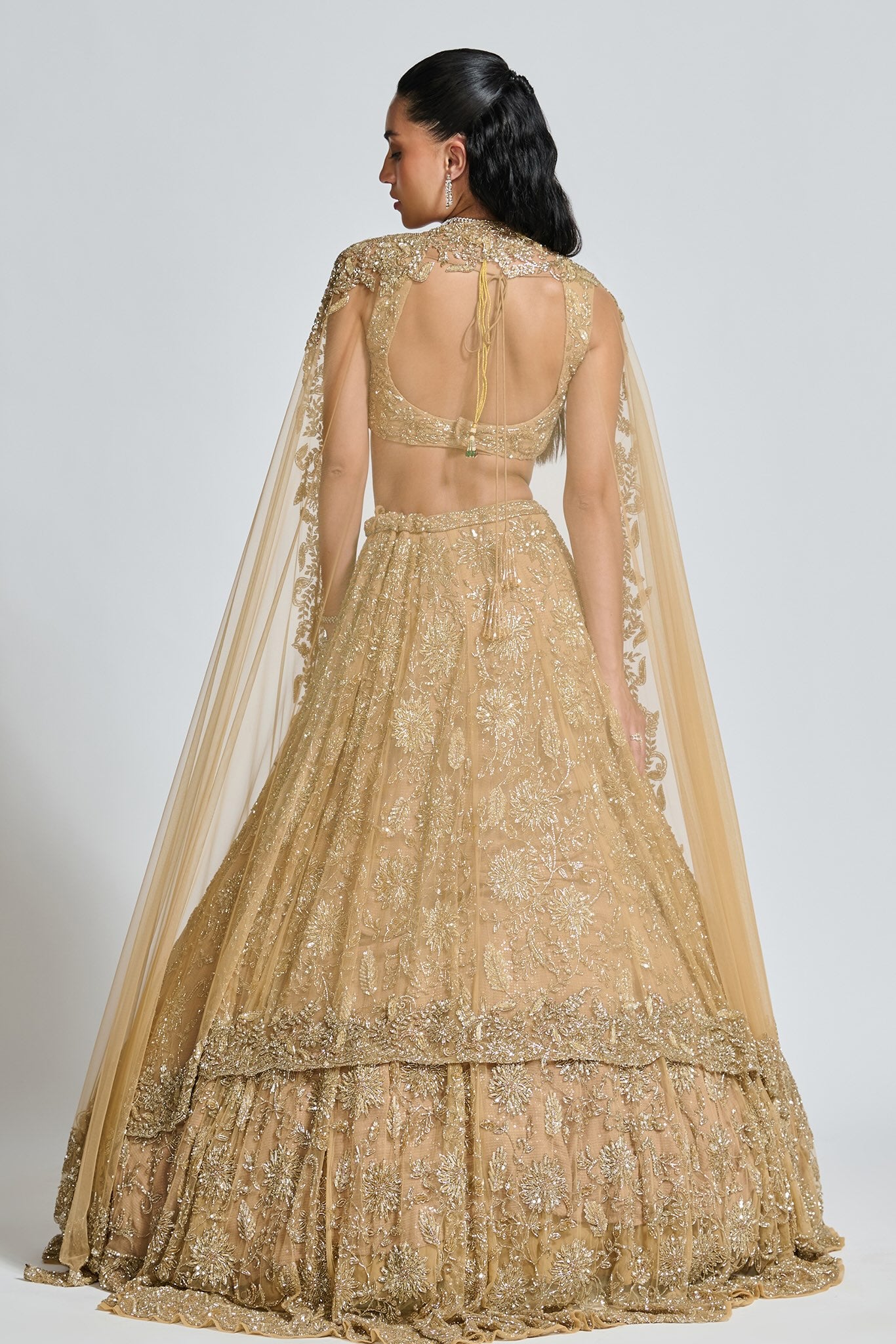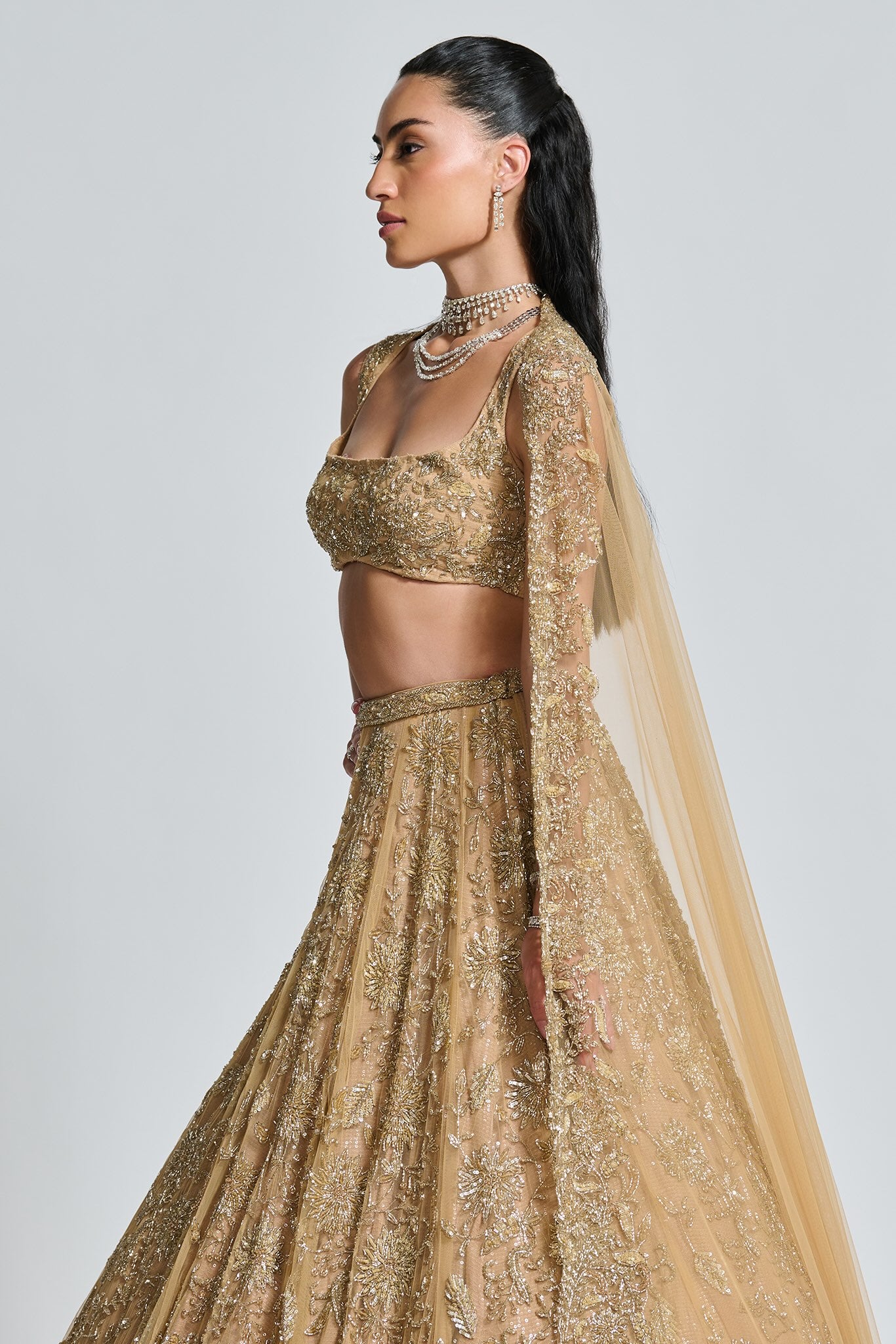 Featuring a gold lehenga, meticulously hand-embroidered on tulle fabric with crystals, cutdana, sequin, thread, beads detailing. Paired with a cutdana and crystal detailed matching dupatta with embroidery on all four sides.
