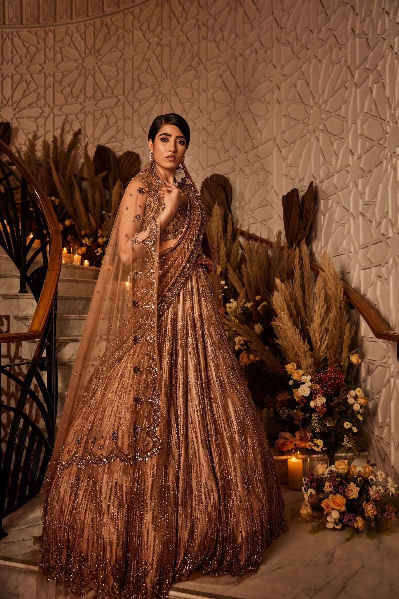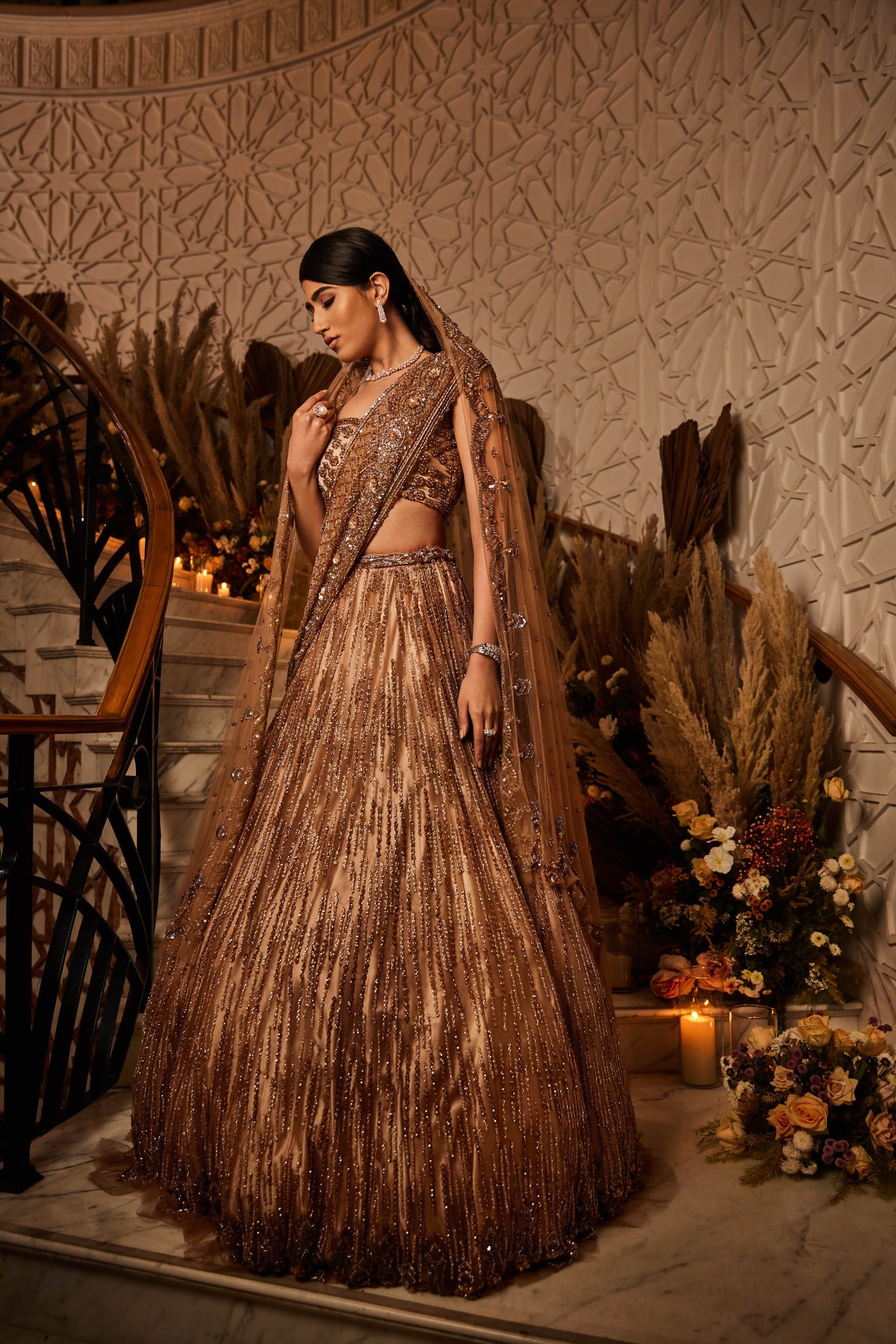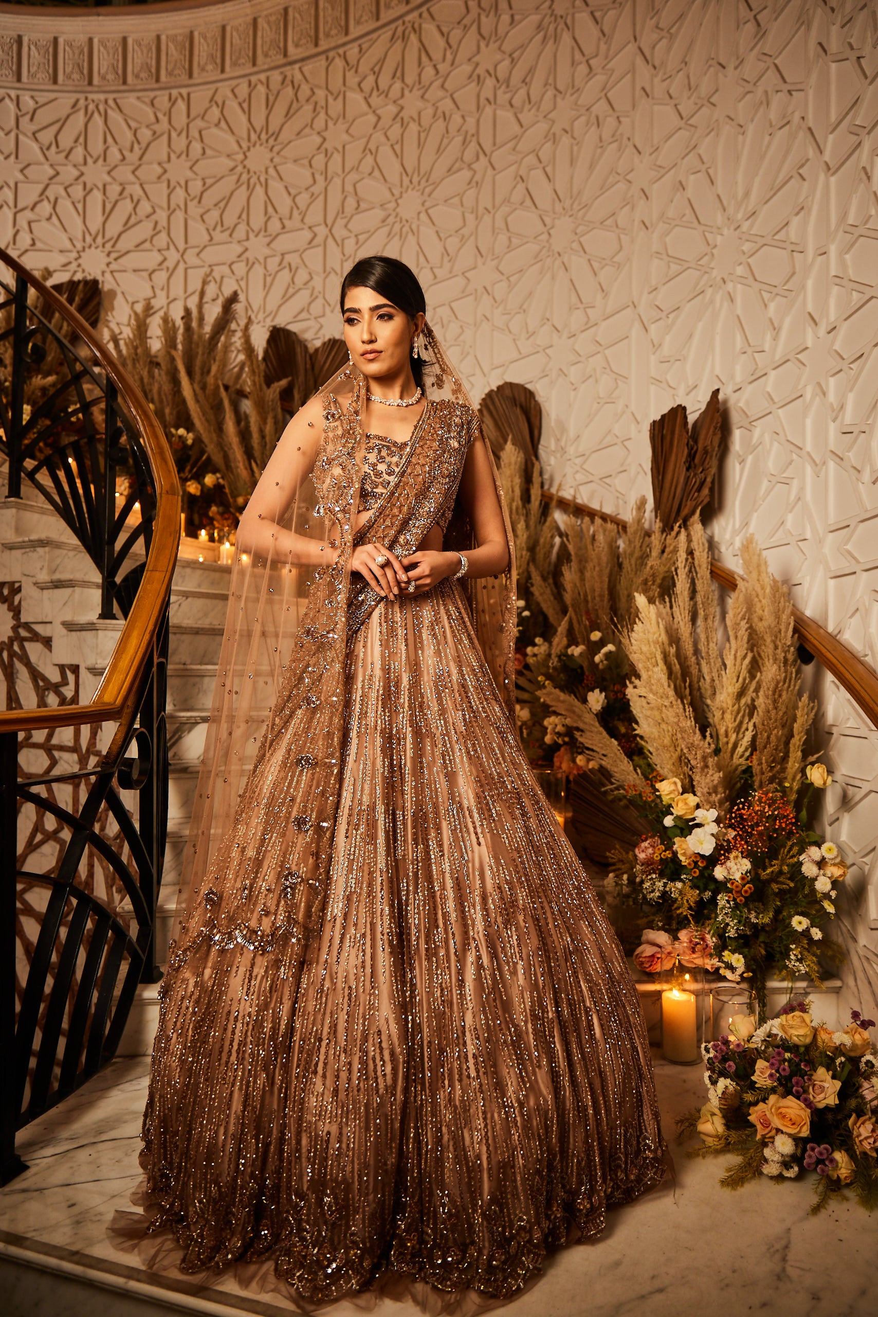Fully hand embriodered lehenga set done on tulle fabric with crystal, cutdana and sequin work. This lehenga set is paired with a crystal, sequin and cutdana detailed dupattas. It comes with two dupatta set. This elegant set can be opted with single dupatta of your choice.