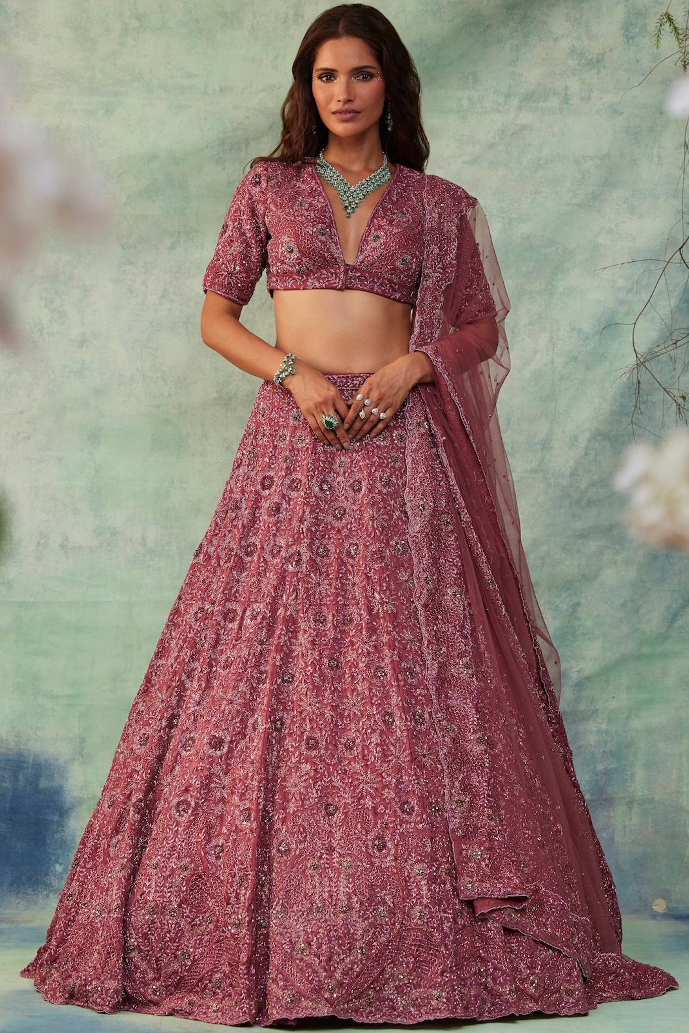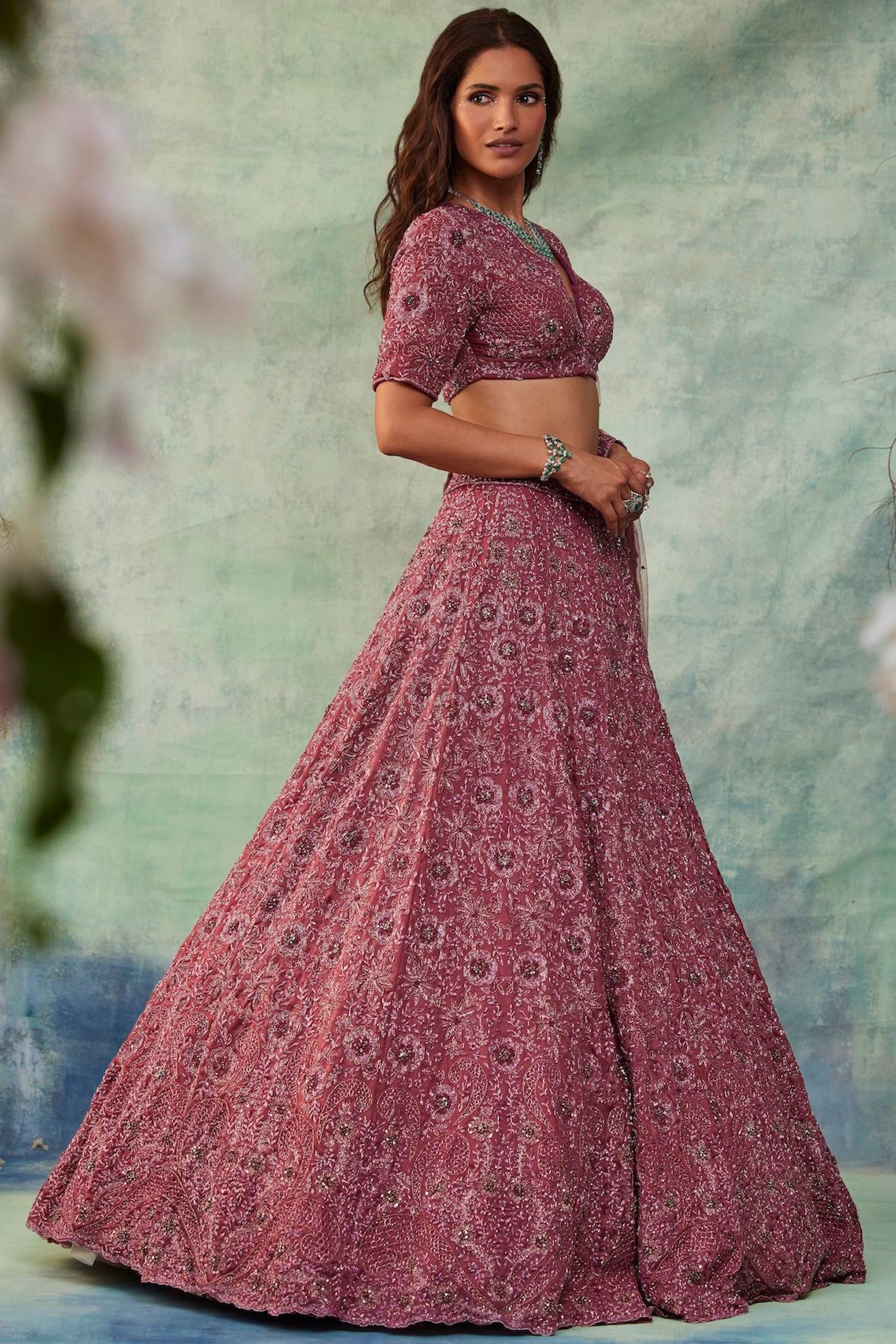 Featuring a dusty pink lehenga, meticulously hand-embroidered on organza fabric with crystals, cutdana, sequin, zari, beads detailing. Paired with a cutdana and crystal detailed matching dupatta with embroidery on all four sides.