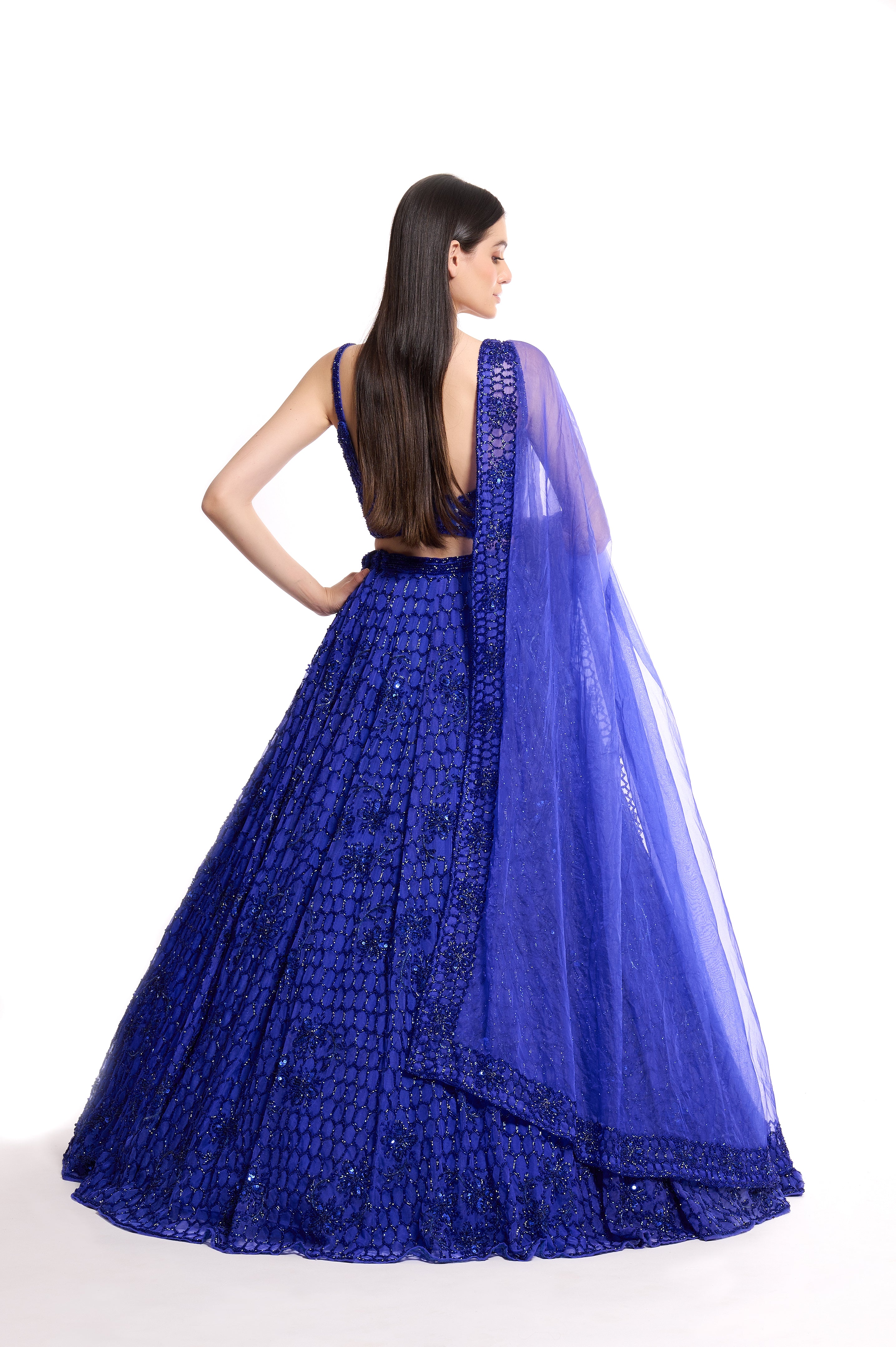 Fully hand embroidered lehenga set done on organza fabric with cutdana, sequin, crystal detailing . This graceful lehenga set is paired with crystal, sequin and cutdana detailed dupatta on all four sides.