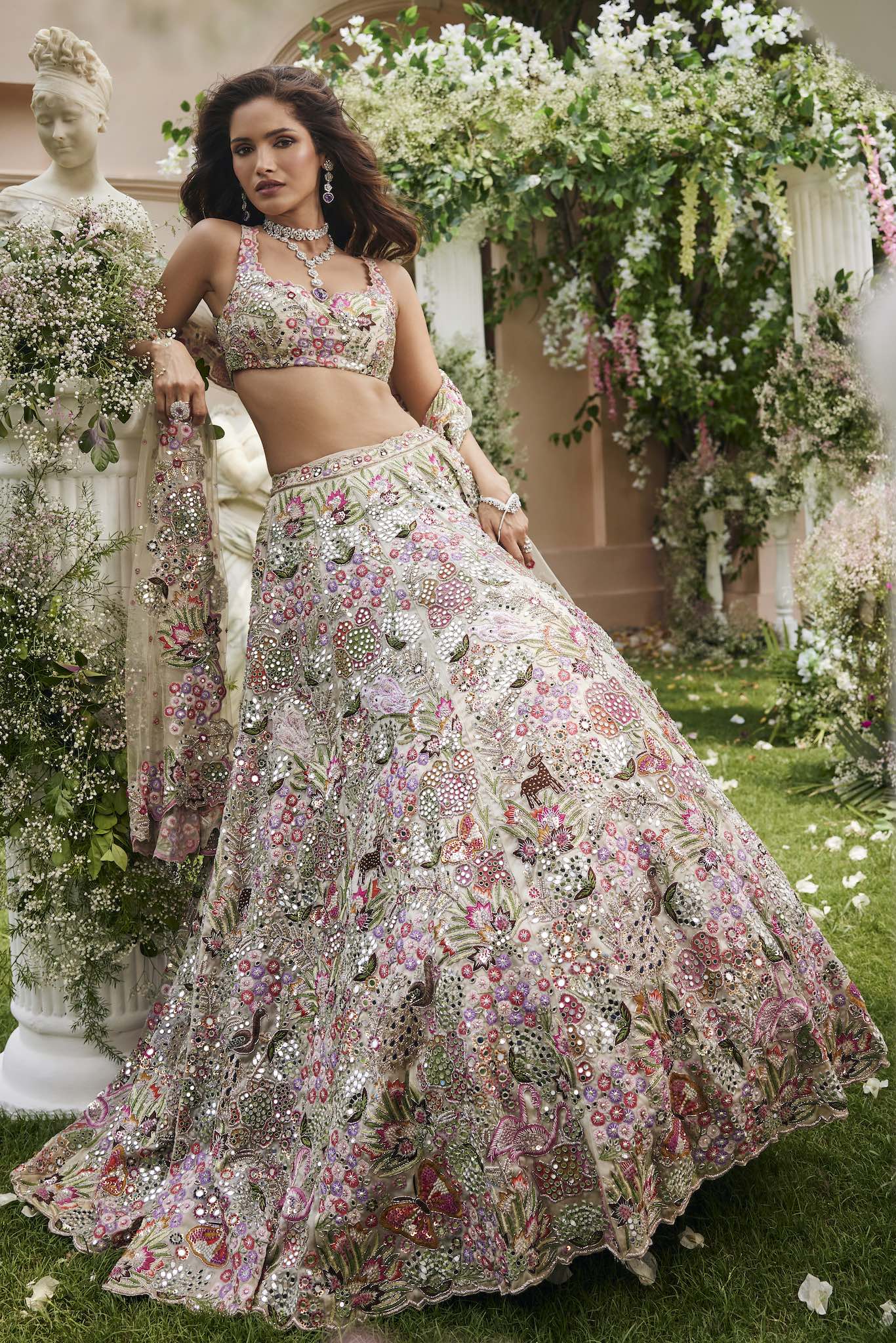 Featuring a lavender lehenga, meticulously hand-embroidered on tissue fabric with crystals, cutdana, sequin, thread, beads detailing. The blouse shows crystal tassels at the waist. Paired with a cutdana and crystal detailed matching dupatta with embroidery on all four sides.