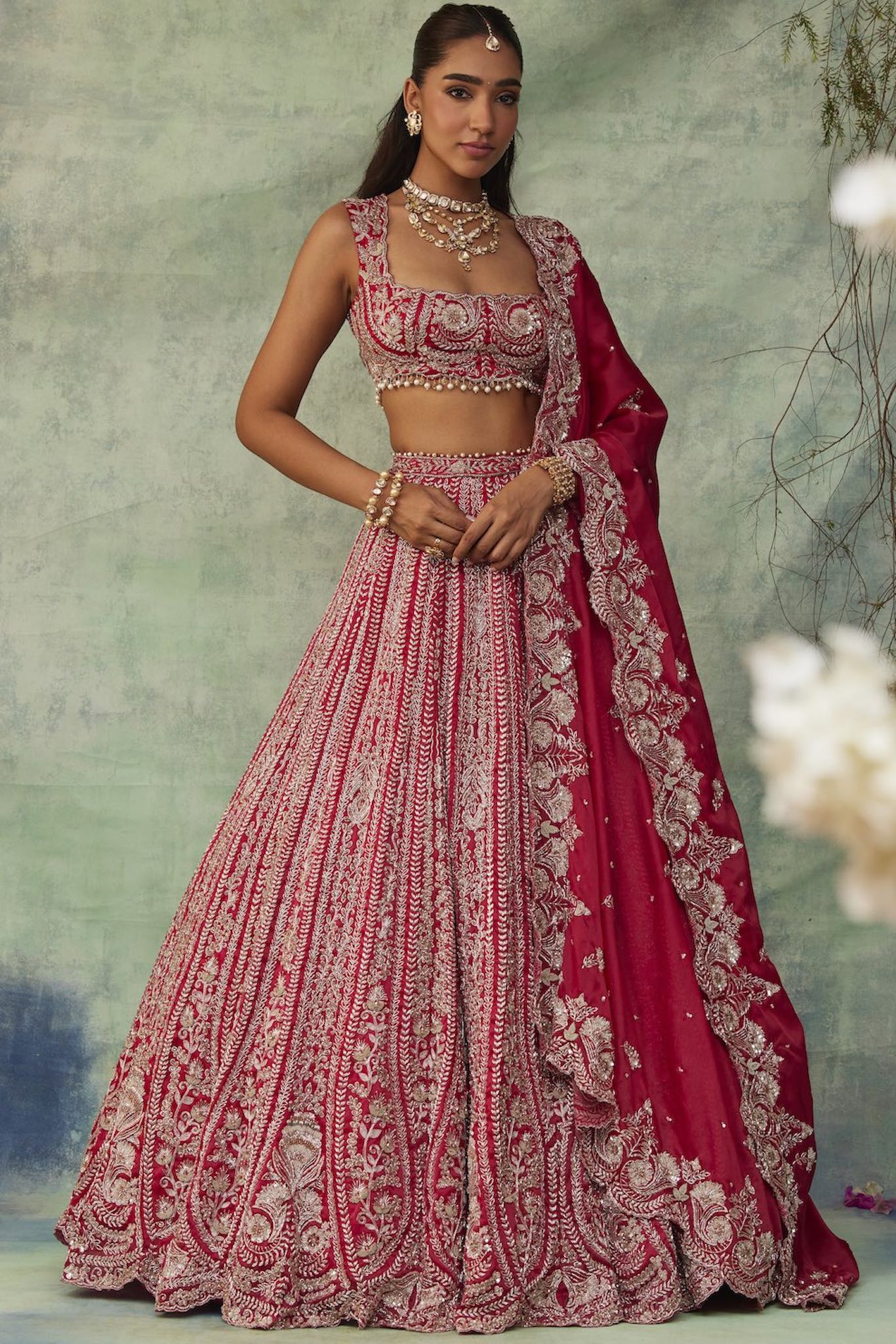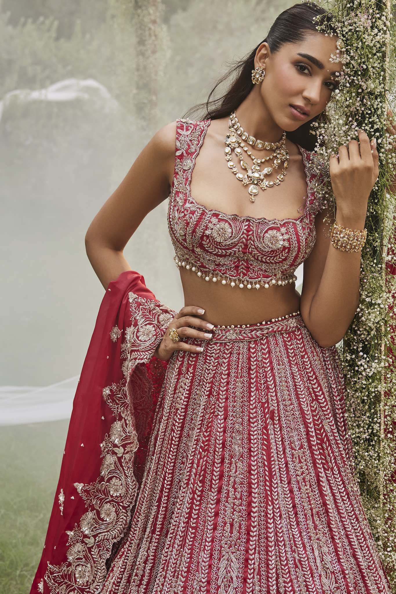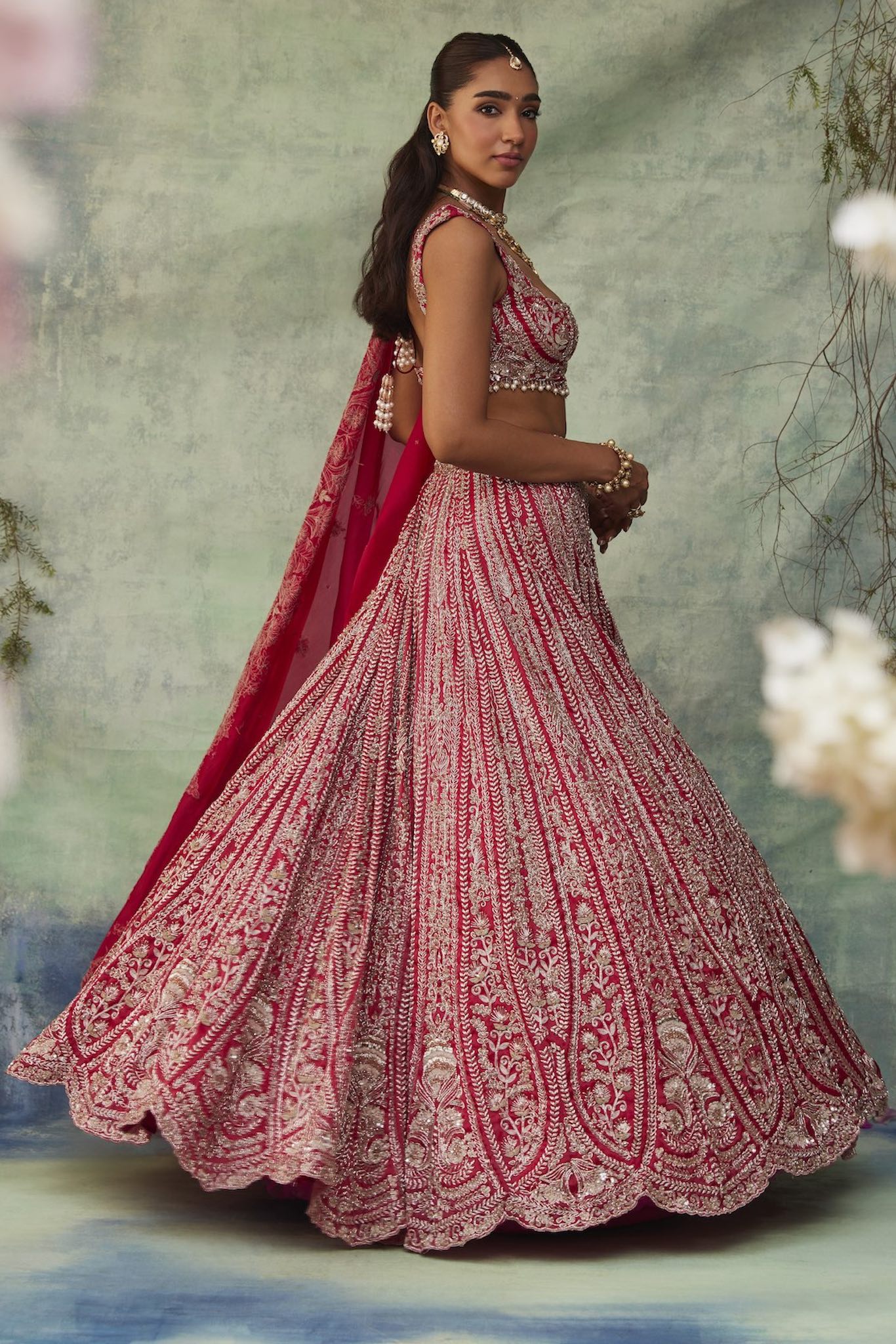Featuring a fuchsia pink lehenga, meticulously hand-embroidered on organza fabric with crystals, cutdana, sequin, dabka and zari detailing. The blouse shows pearl and beads tassels at the waist. Paired with a cutdana and crystal detailed matching dupatta with embroidery on all four sides.