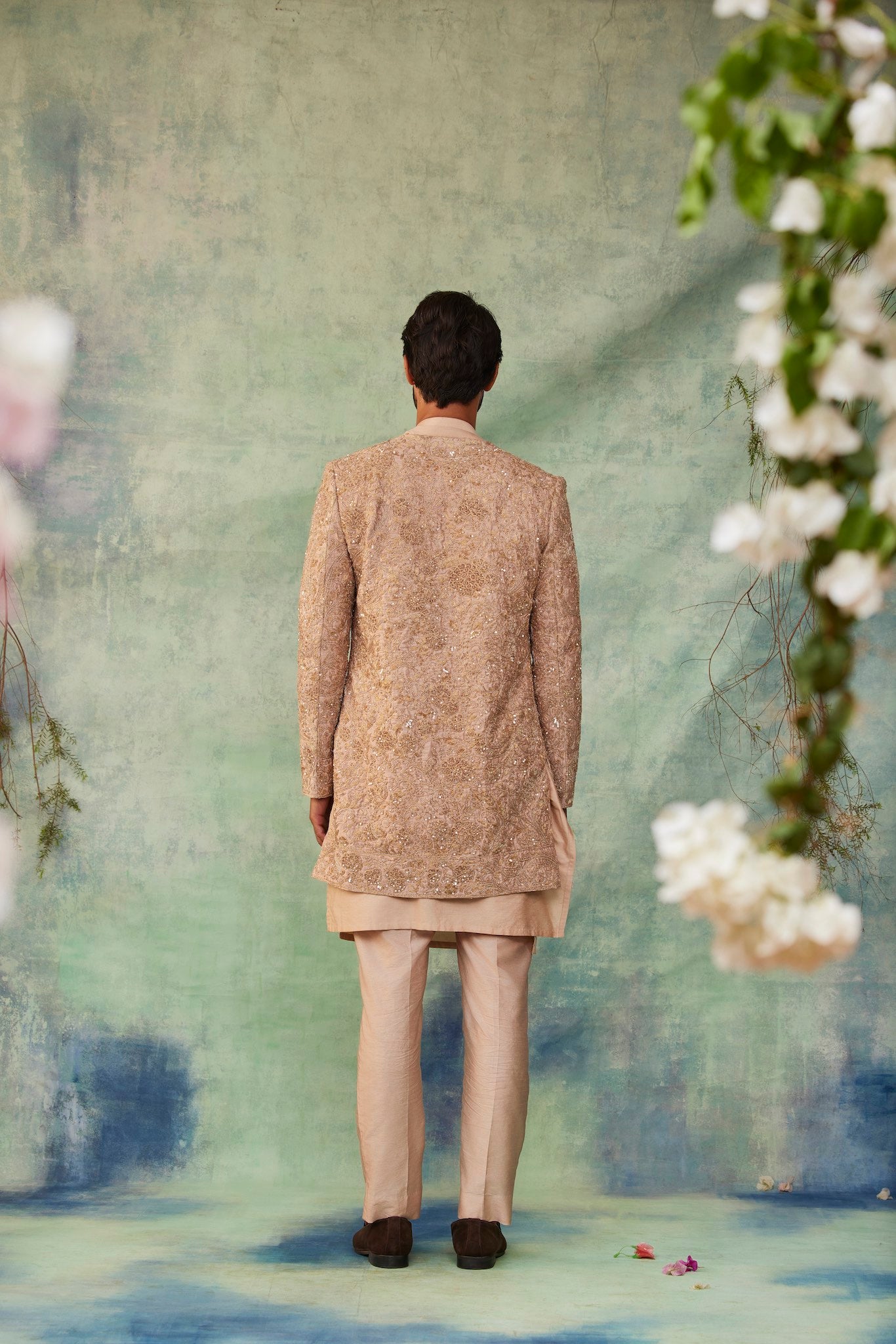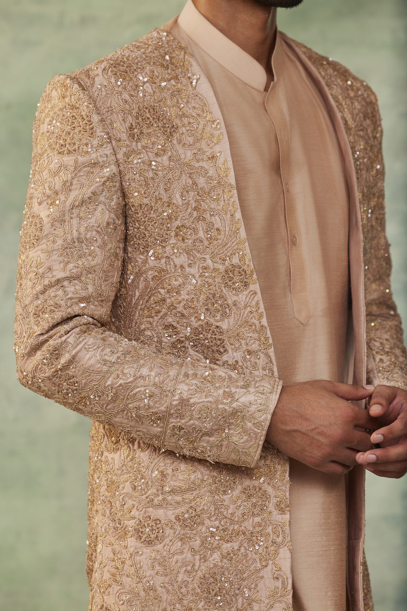Featuring a gold sherwani, meticulously hand-embroidered on linen with tonal thread, beads,cutdana, dabka and cutdana detailing. It is paired with tonal kurta and matching straight pants.