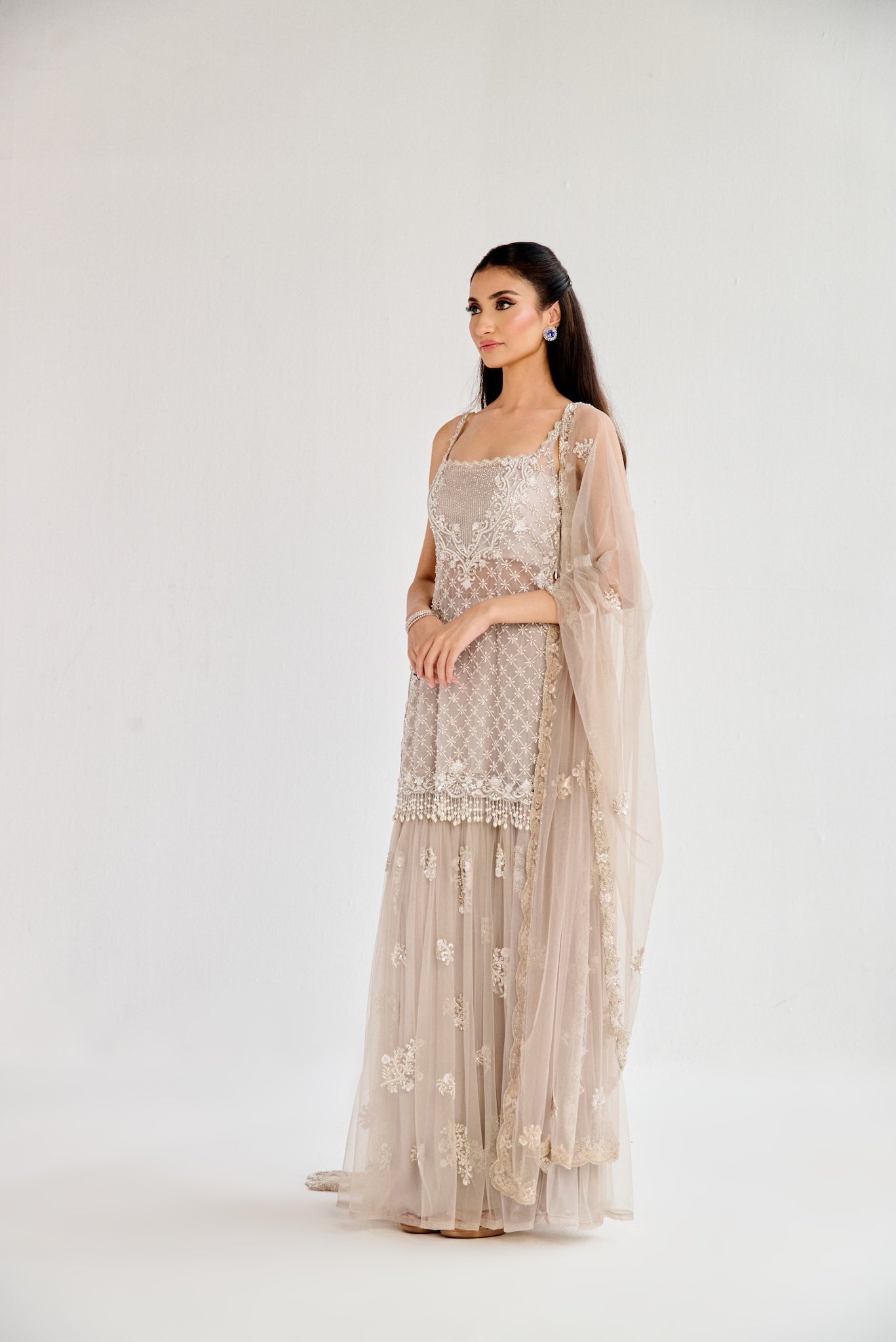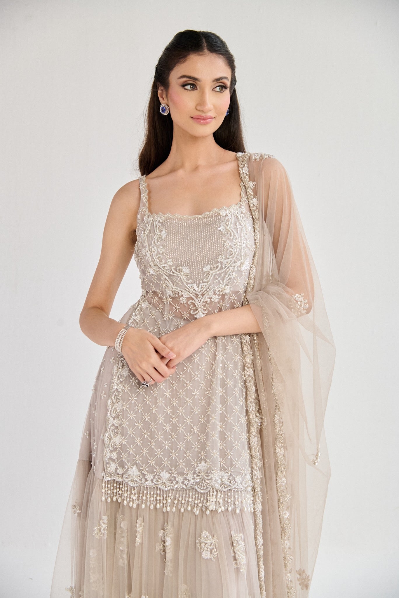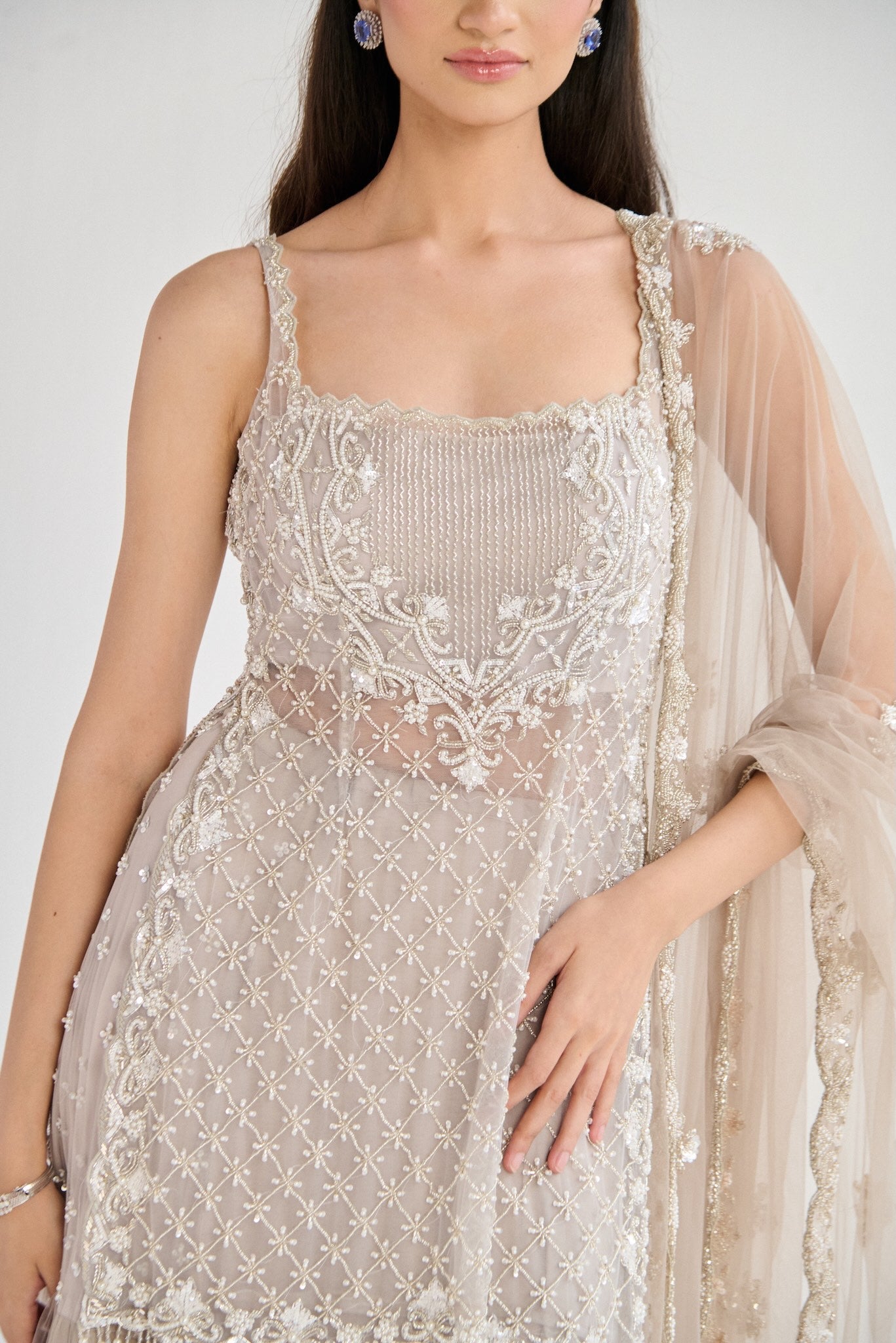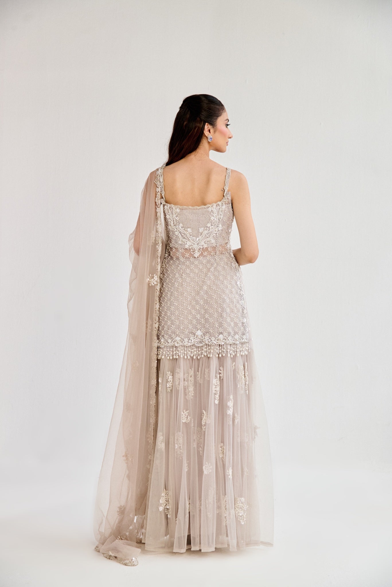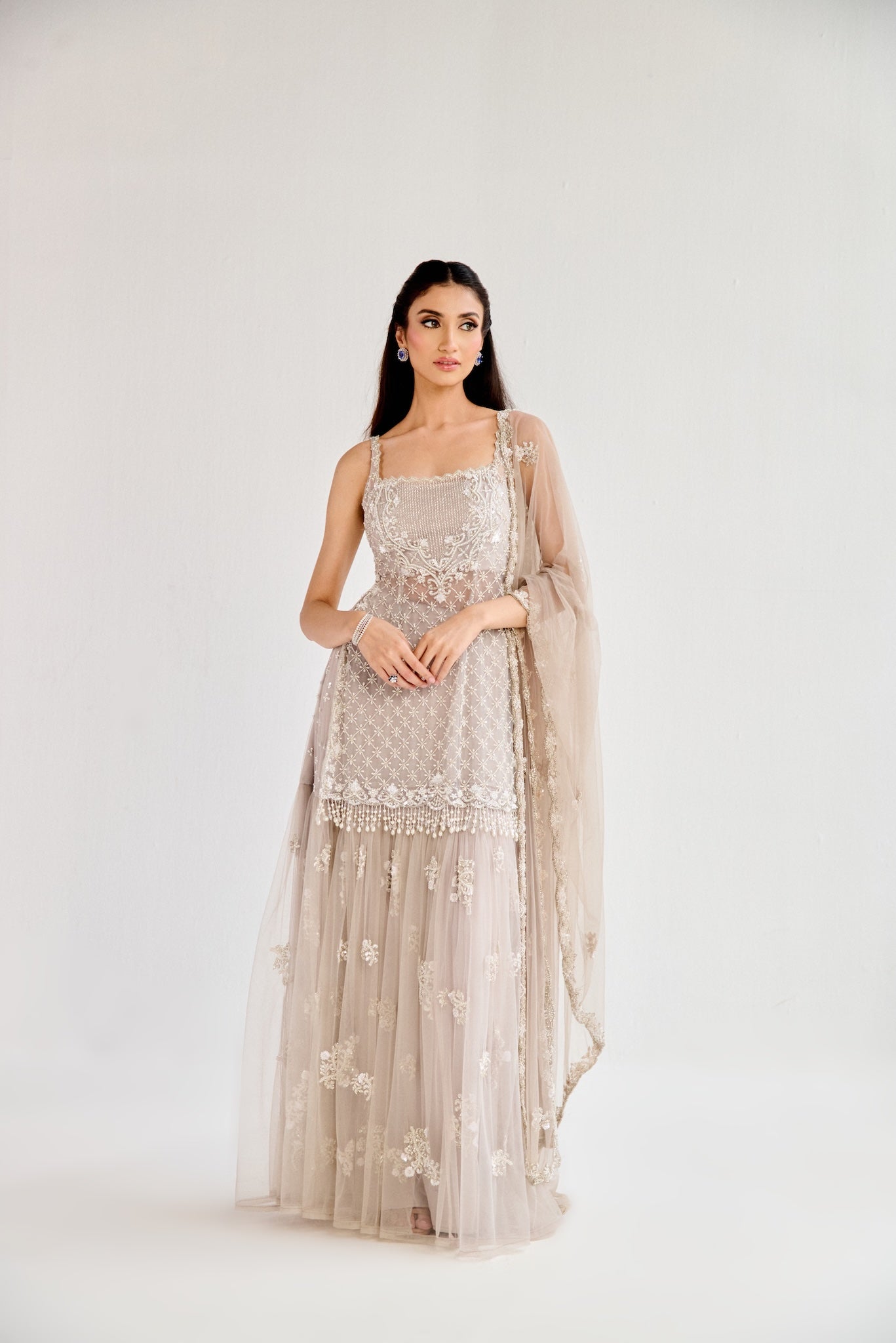 Featuring a grey suit, meticulously hand-embroidered on tulle fabric with cutdana, pearl and crystal detailing and embroidered skirt . Paired with a cutdana and crystal detailed dupatta with all over work.