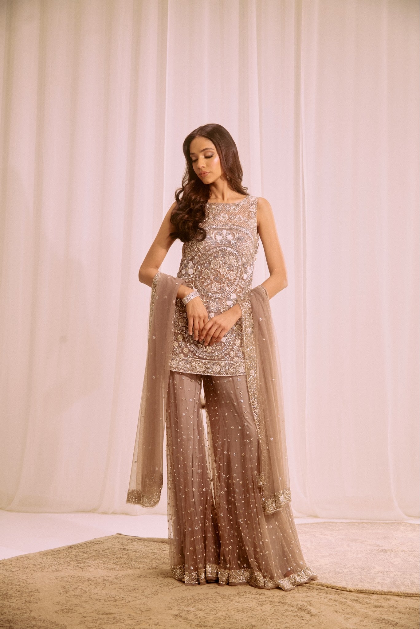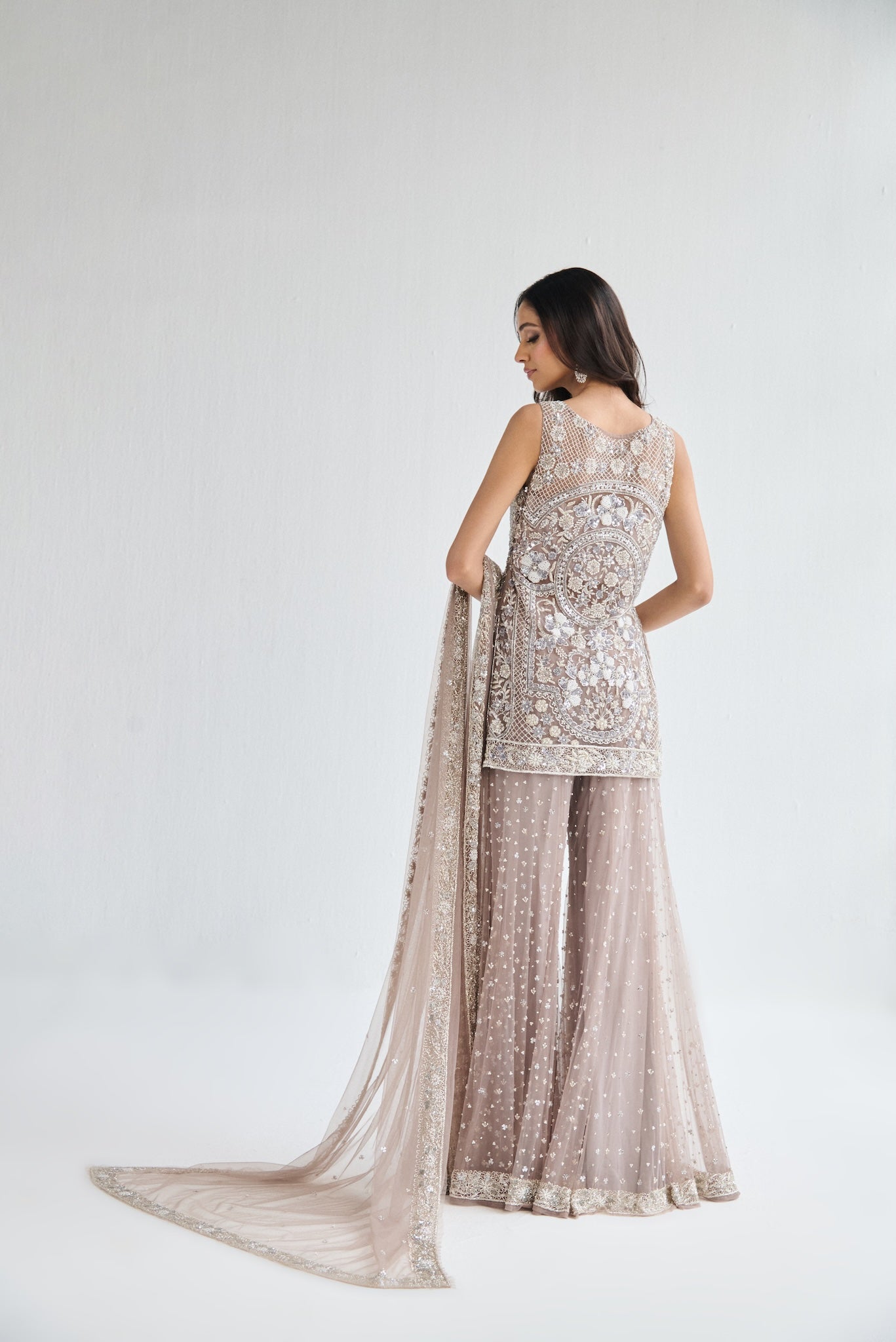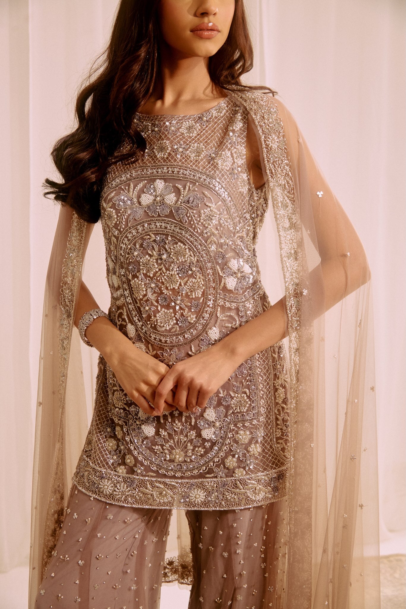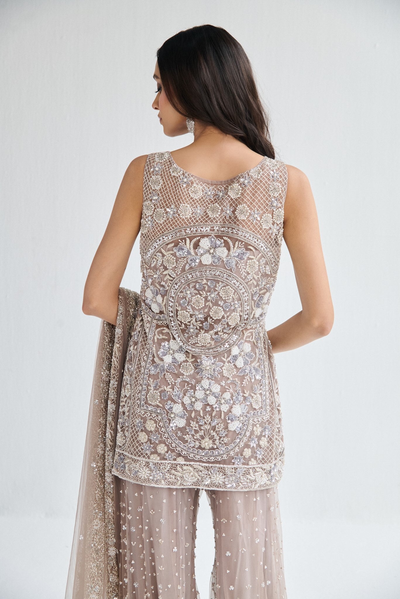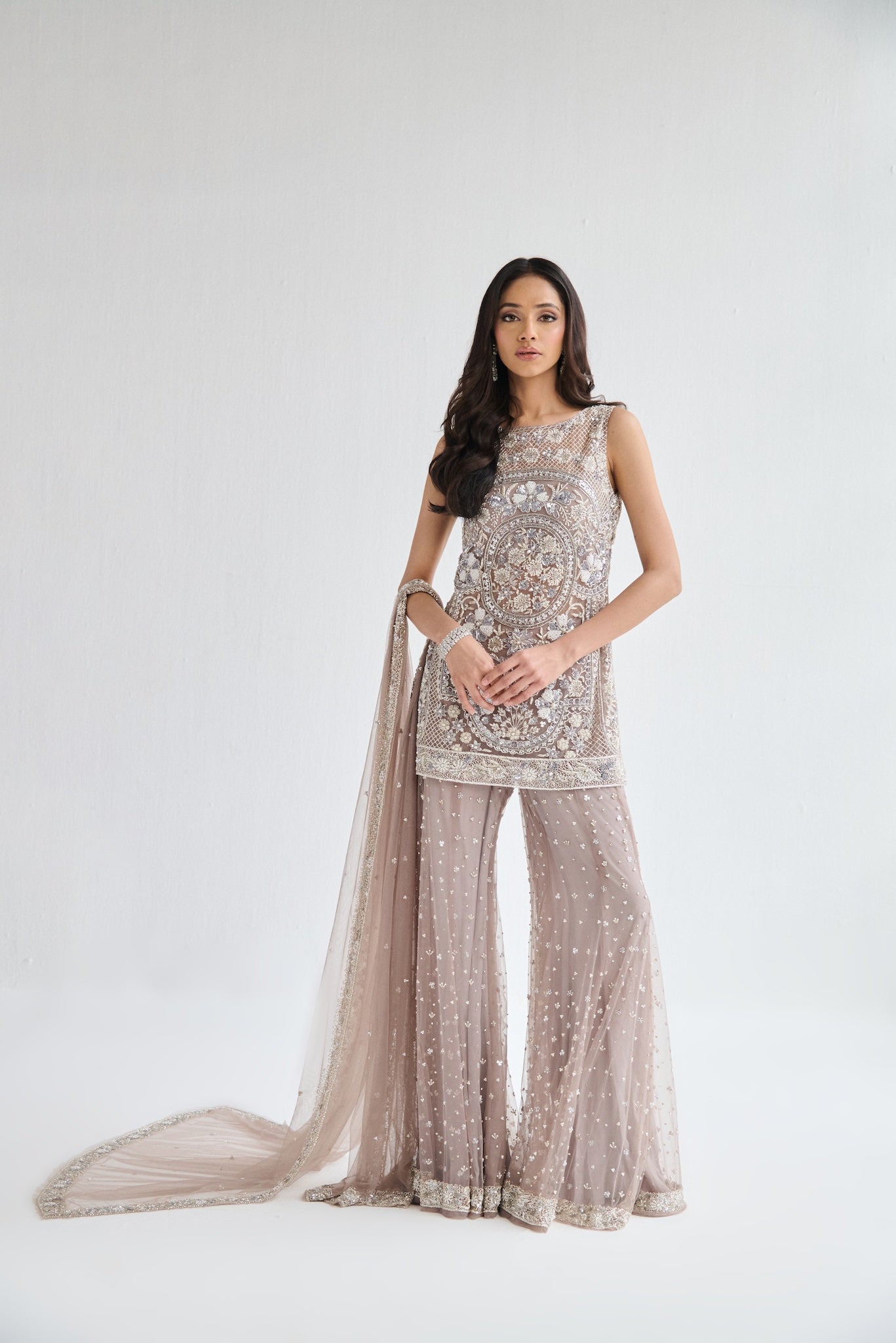 Featuring a grey suit, meticulously hand-embroidered on tulle fabric with cutdana, pearl and crystal detailing and embroidered skirt . Paired with a cutdana and crystal detailed dupatta with all over work.