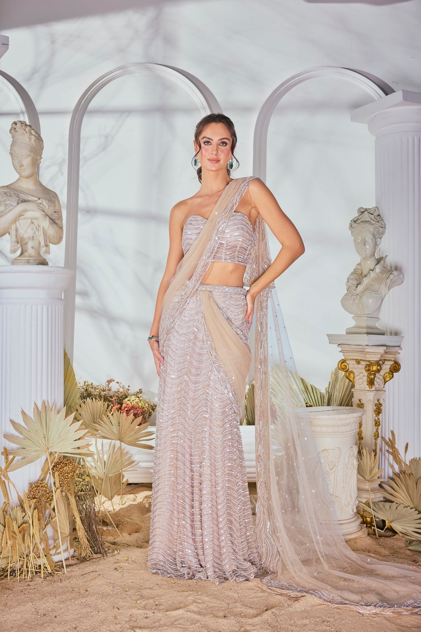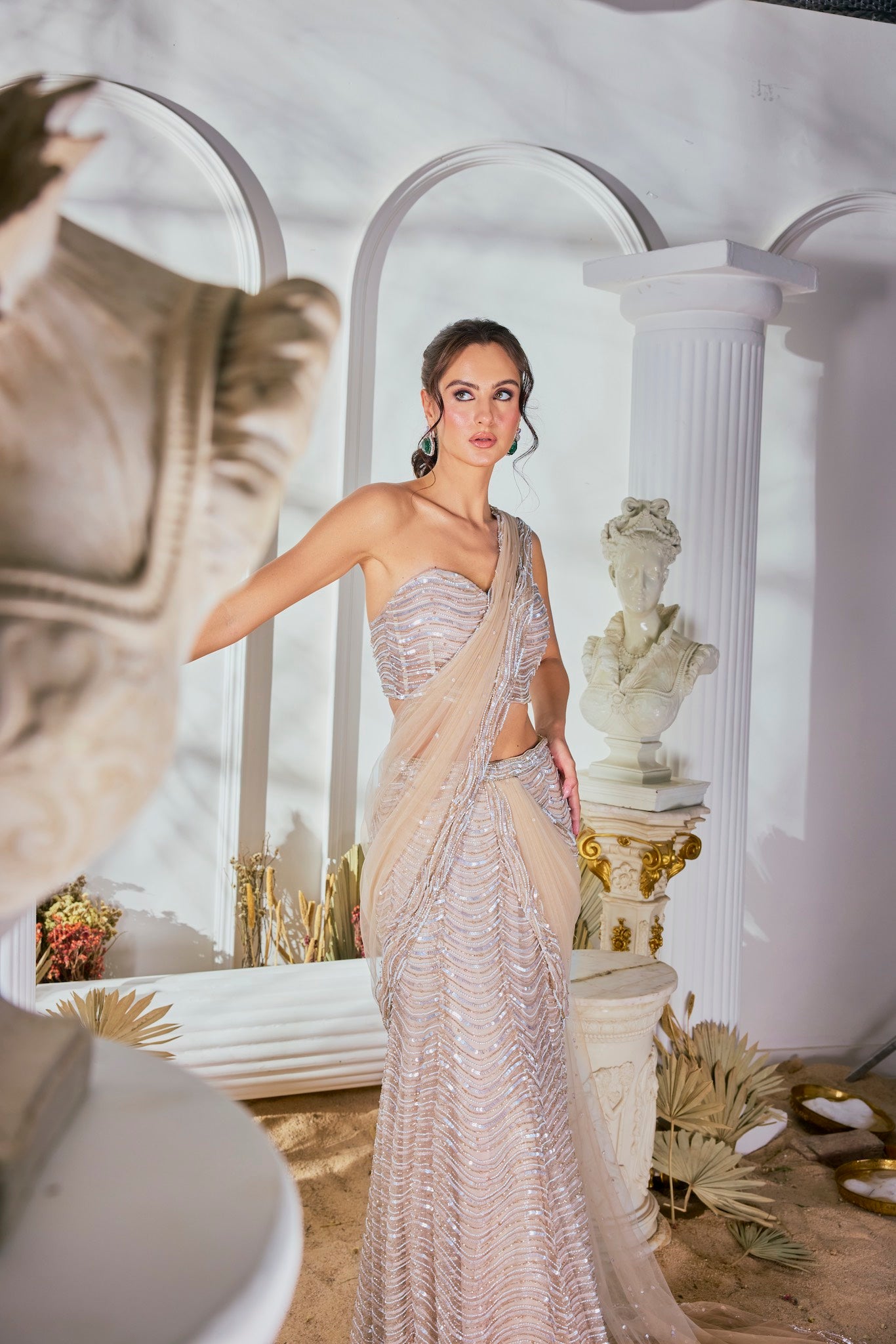 Featuring an ivory hand embroidered pre-draped saree done on tulle fabric with cutdana and sequin, crystal embroidery work. It is paired with a matching embroidered blouse.