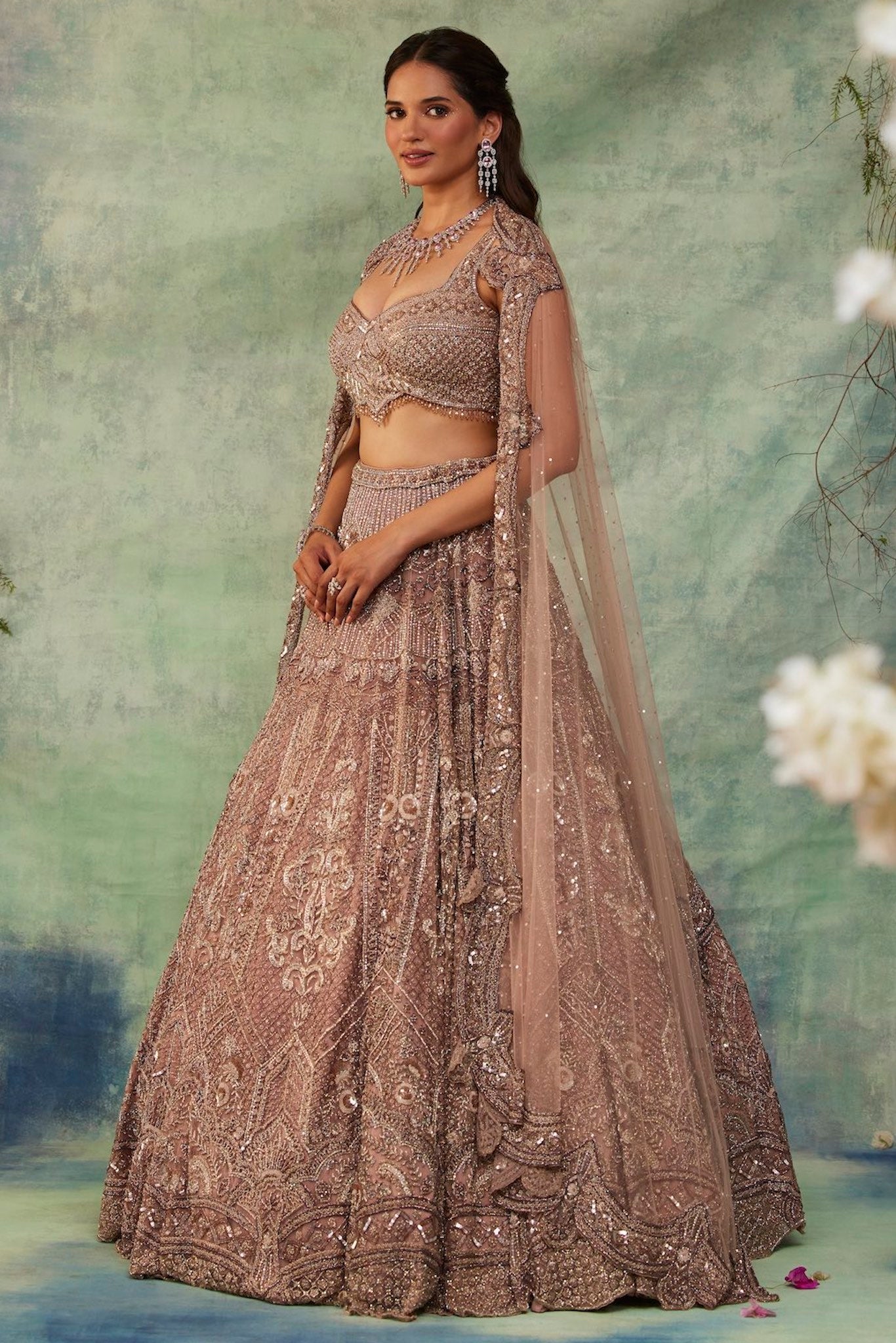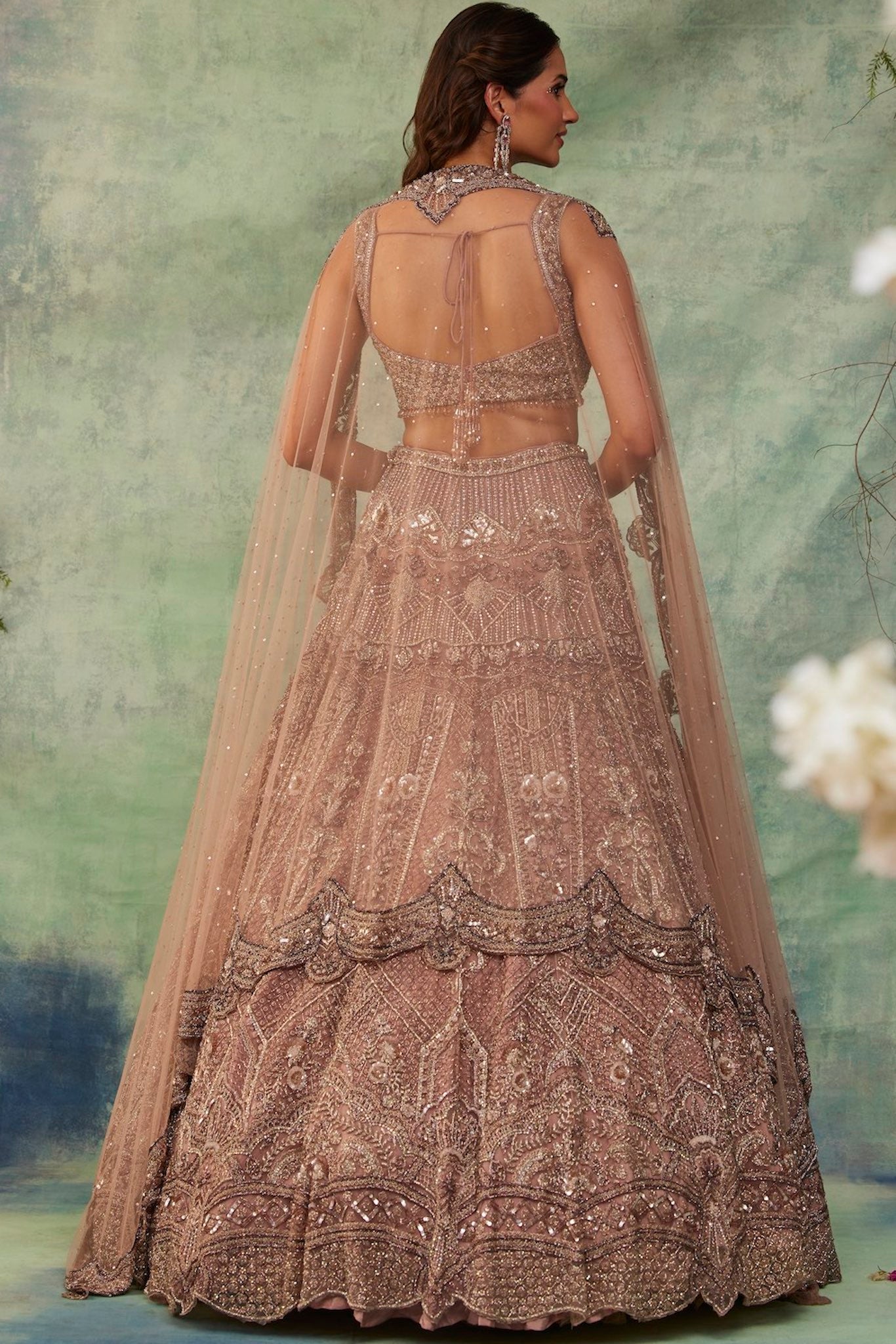 Featuring a dusty pink lehenga, meticulously hand-embroidered on tulle fabric with crystals, cutdana, sequin,and beads detailing. The blouse shows crystal tassels at the waist. Paired with a cutdana and crystal detailed matching dupatta with embroidery on all four sides.