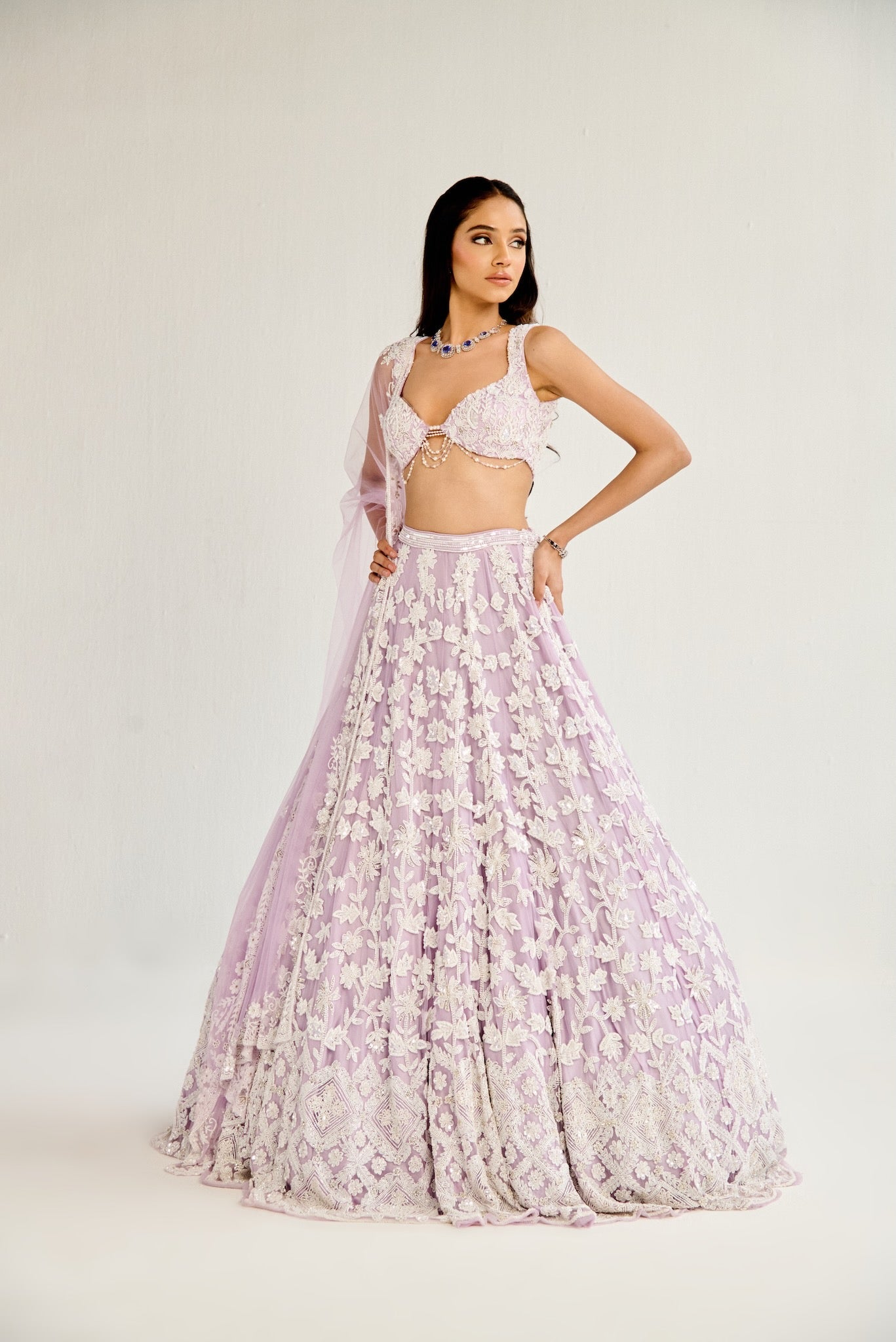 Featuring a lavender lehenga, meticulously hand-embroidered on tulle fabric with crystals, cutdana, sequin, beads detailing. Paired with a cutdana and crystal detailed matching dupatta with embroidery on all four sides.