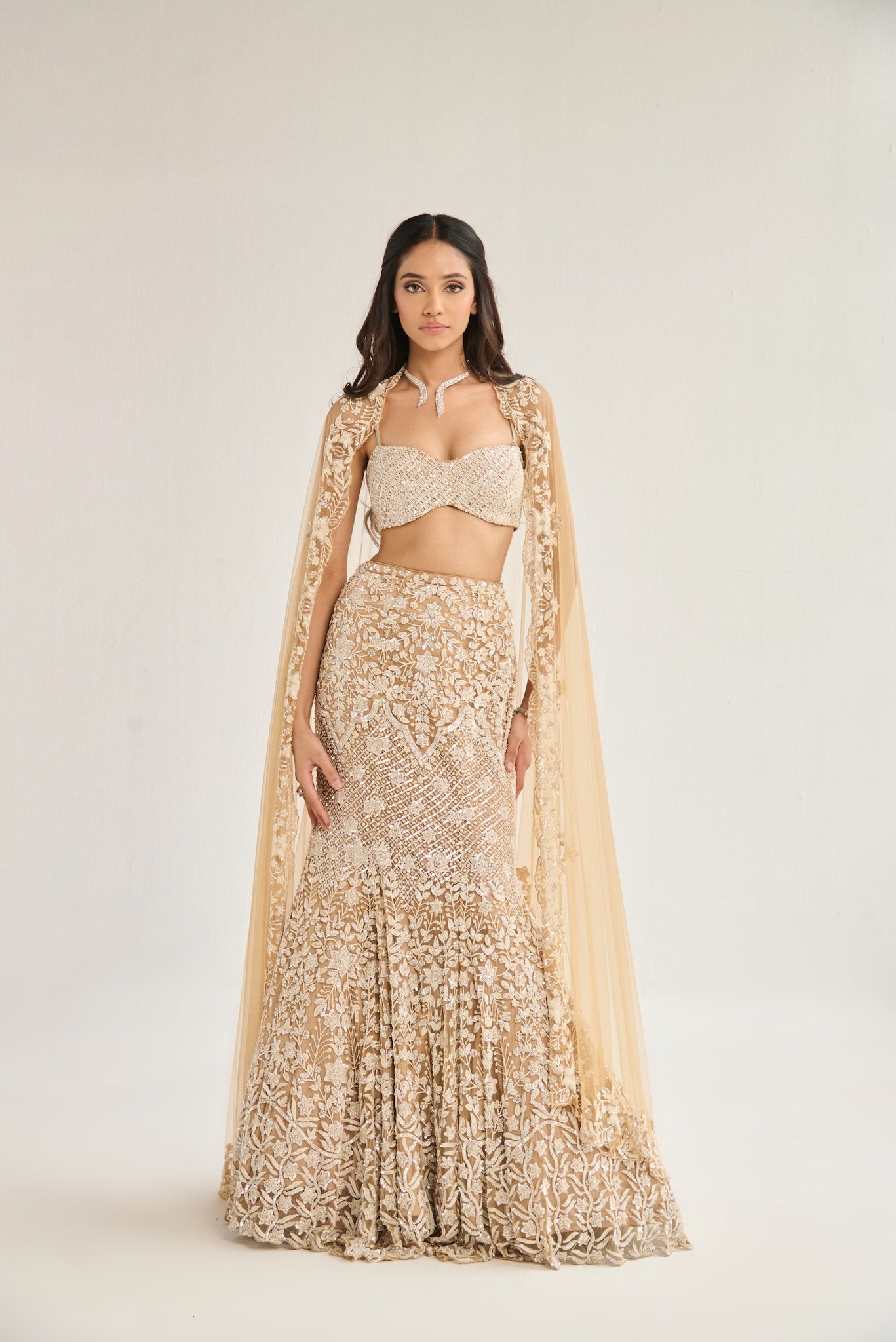 Featuring a nude ivory fish cut lehenga, meticulously hand-embroidered on tulle fabric with cutdana ,beads and sequin detailing. Paired with a cutdana and sequin detailed matching dupatta with embroidery on all four sides.