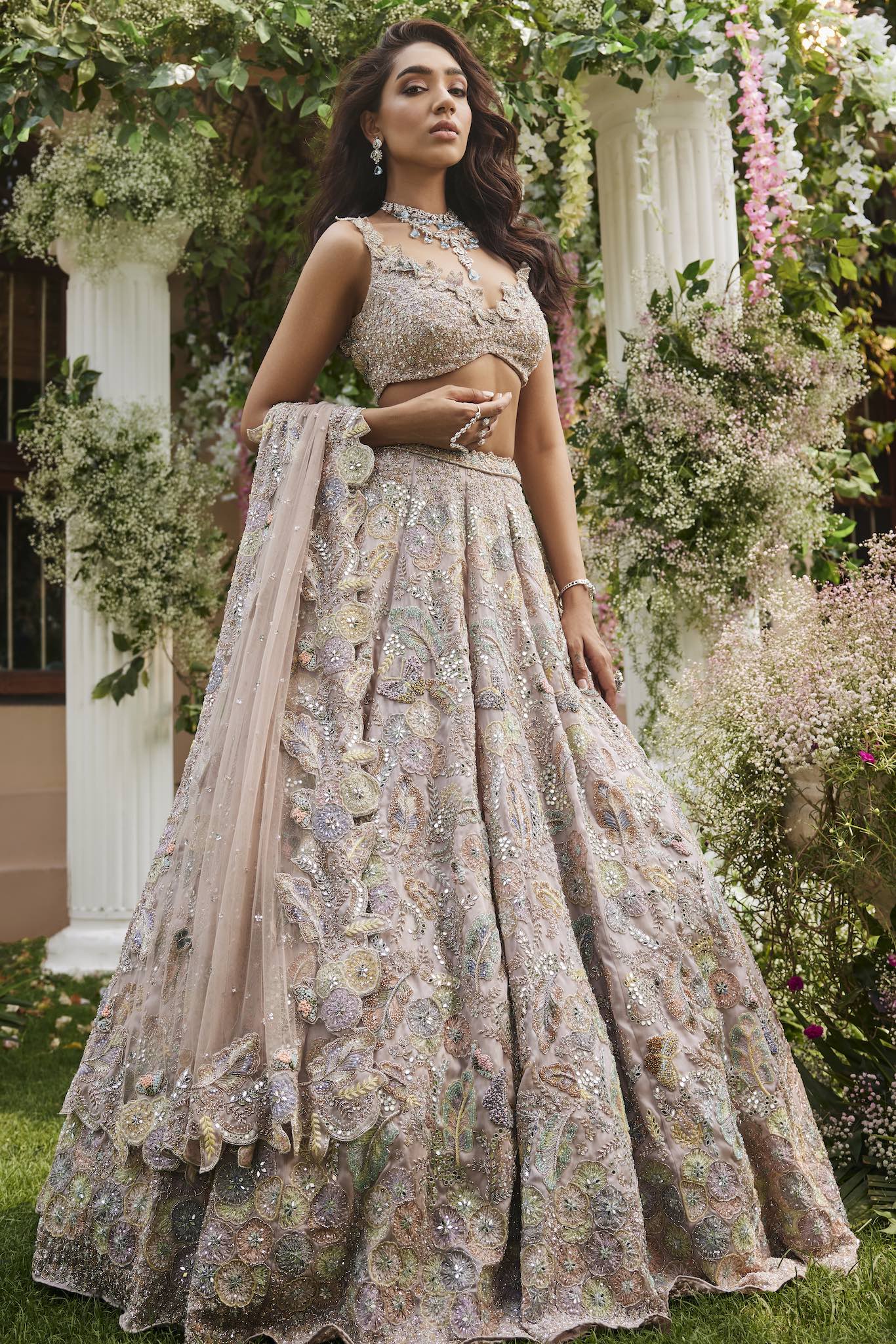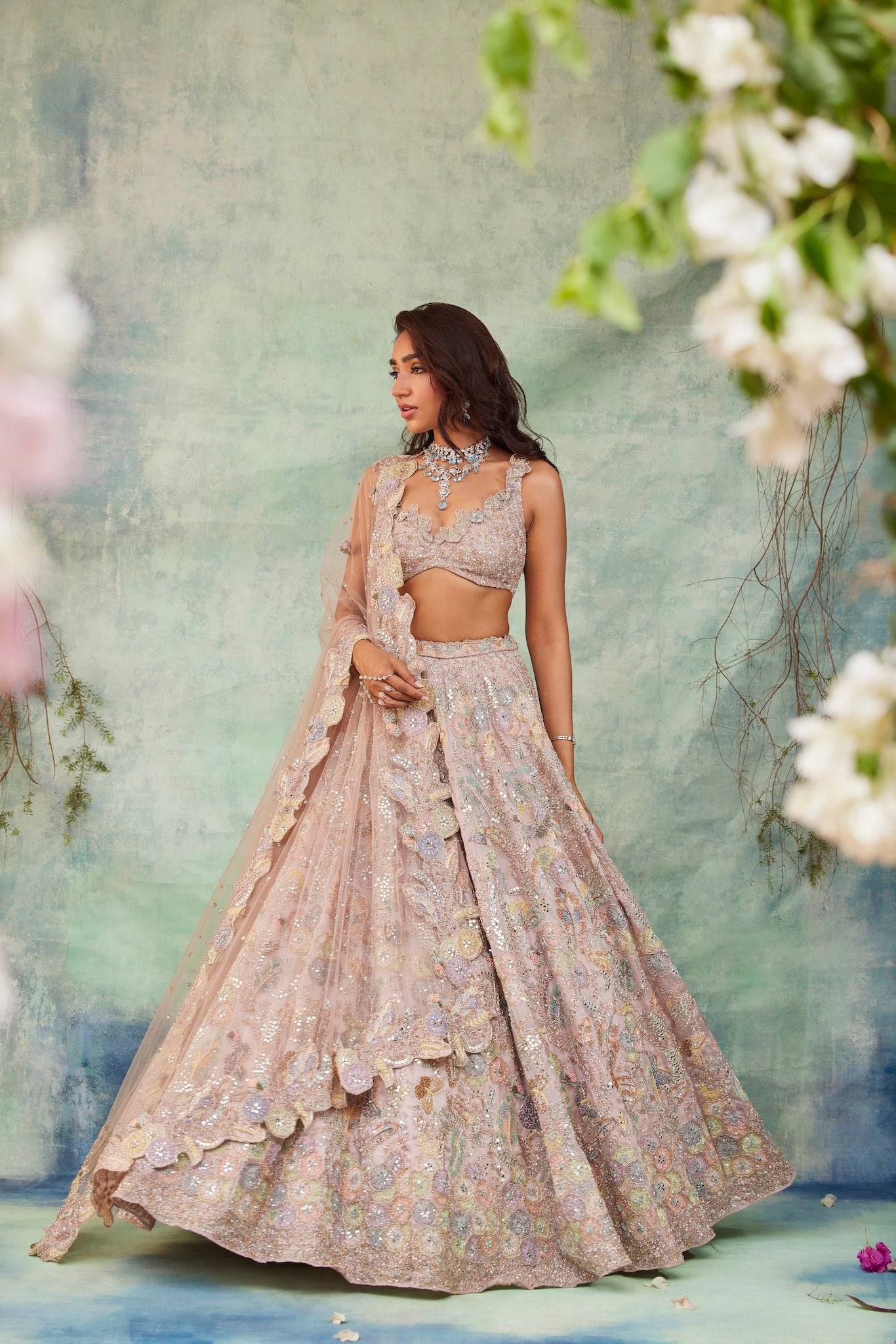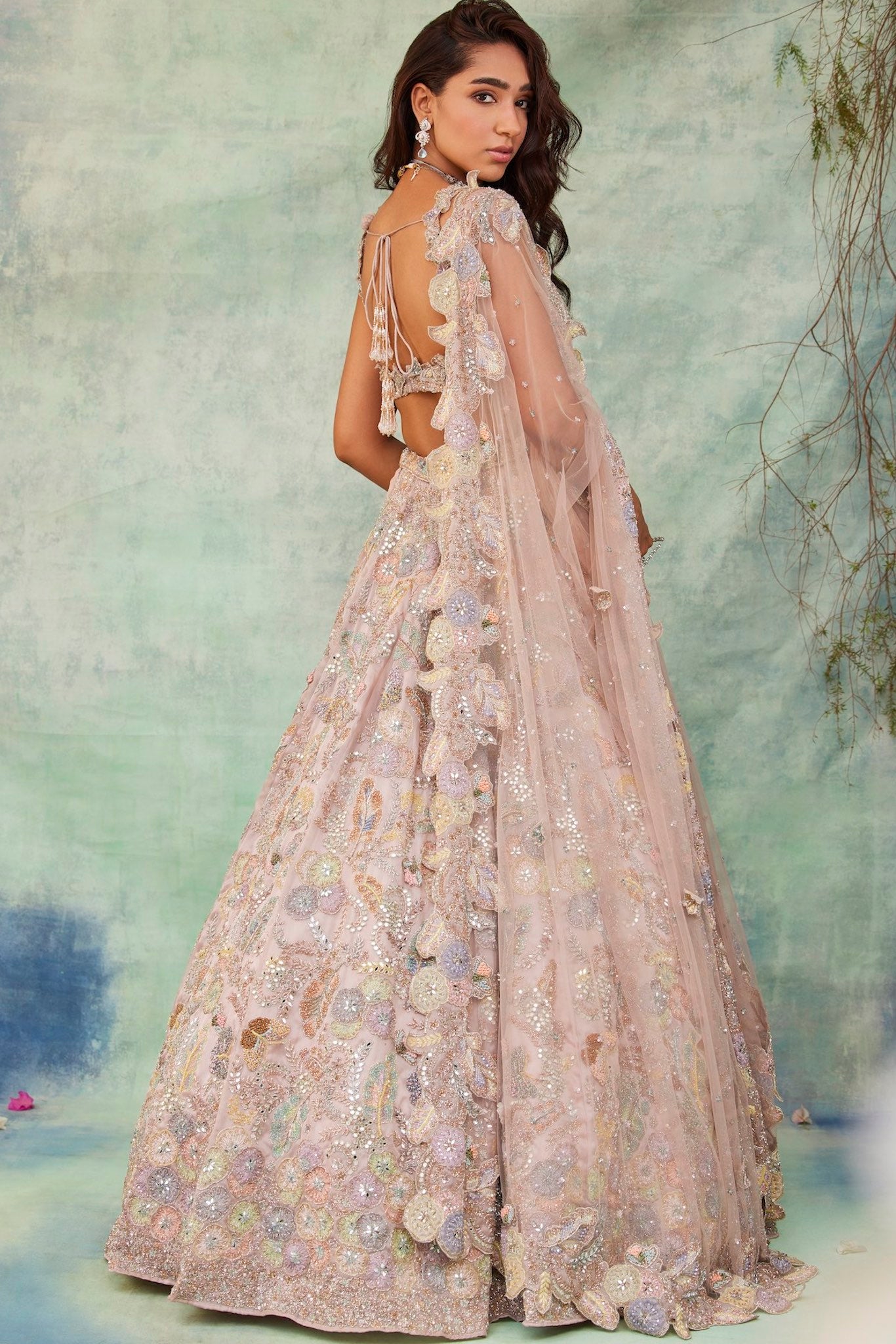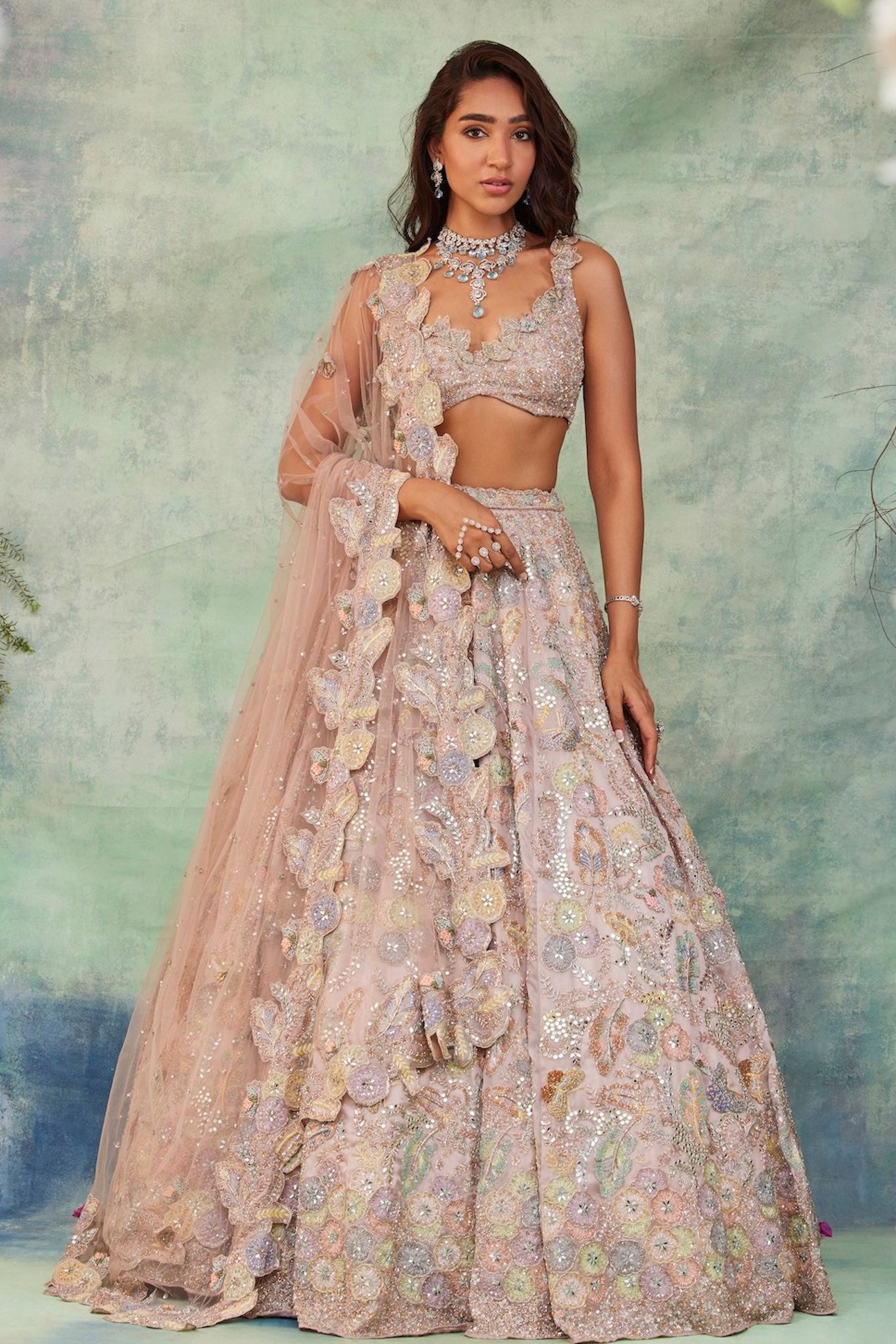 Featuring a baby pink lehenga, meticulously hand-embroidered with floral applique work on organza fabric with crystals, cutdana, sequin, mirror, thread, beads detailing. Paired with a cutdana and crystal detailed matching dupatta with embroidery on all four sides.