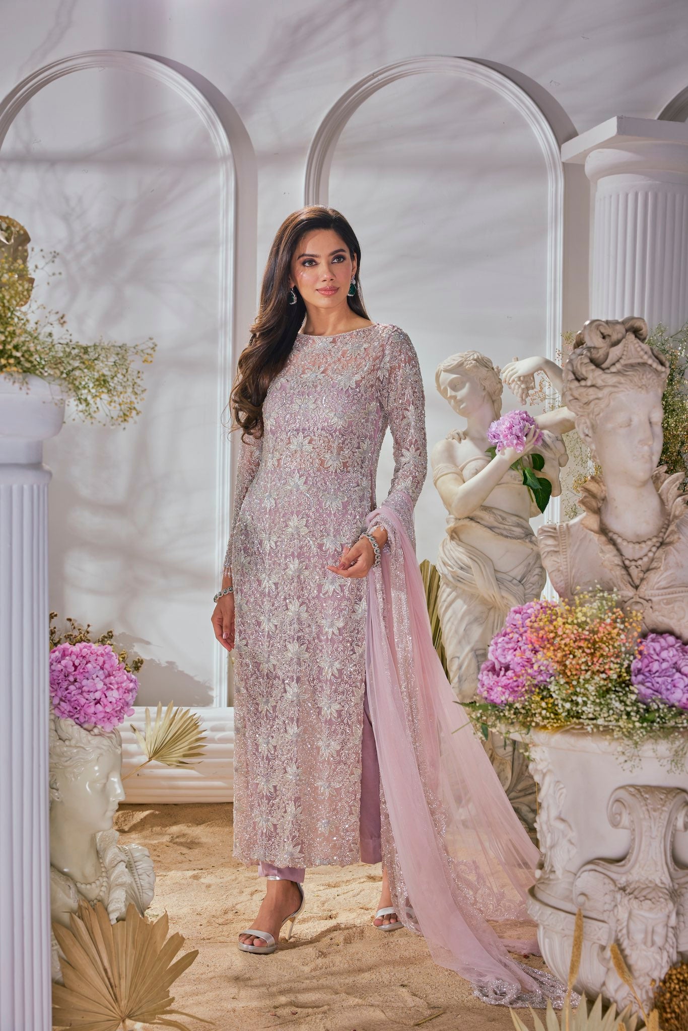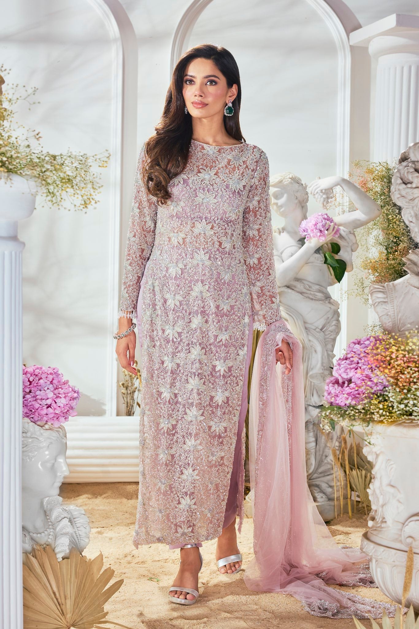 Featuring a pink suit, meticulously hand-embroidered on tulle fabric with cutdana and crystal detailing and straight pants . Paired with a cutdana and crystal detailed matching dupatta.