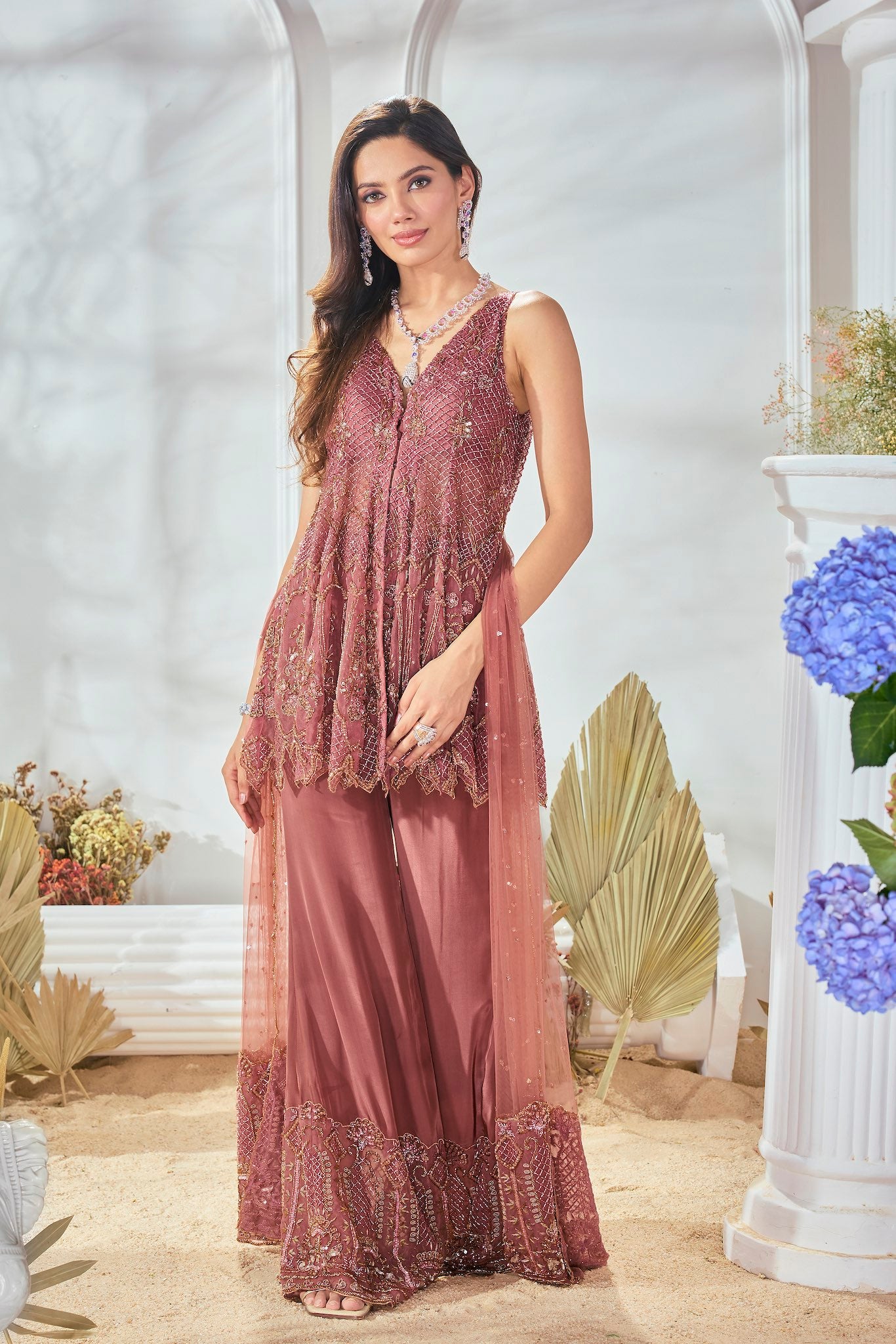 Featuring a pink peplum suit, meticulously hand-embroidered on tissue fabric with cutdana, sequin, beads detailing. Paired with a cutdana and crystal detailed matching dupatta.