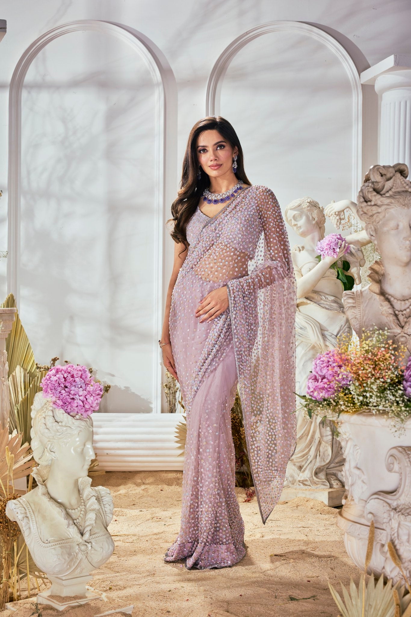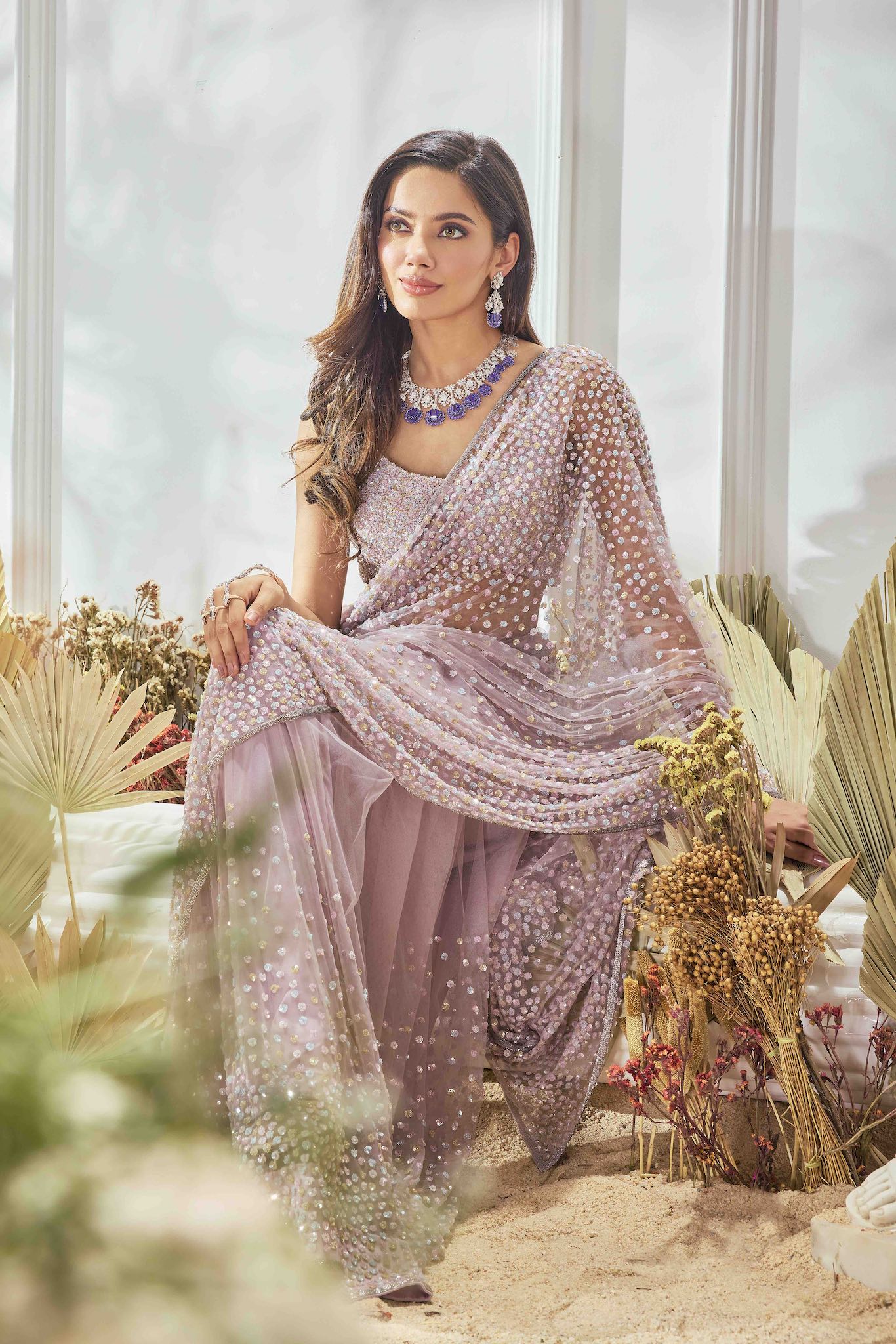 Featuring a pink embroidered saree done on tulle fabric with cutdana and sequin embroidery work. It is paired with a matching embroidered strappy blouse.