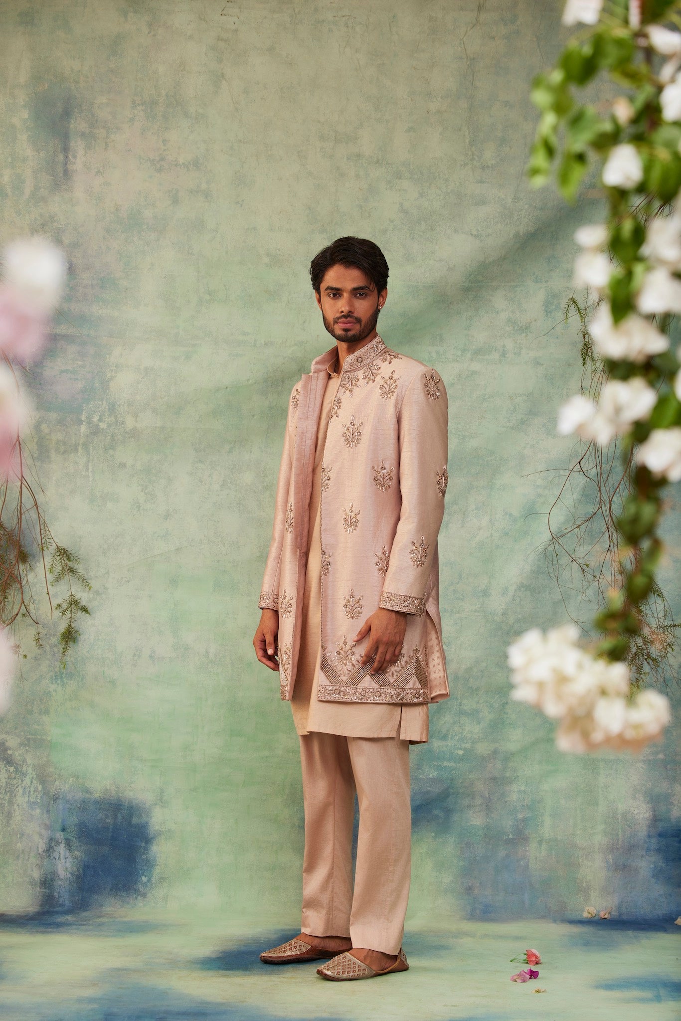 Featuring a light pink sherwani, meticulously hand-embroidered on raw silk with thread, beads,cutdana, dabka and cutdana detailing. It is paired with tonal kurta and matching straight pants.