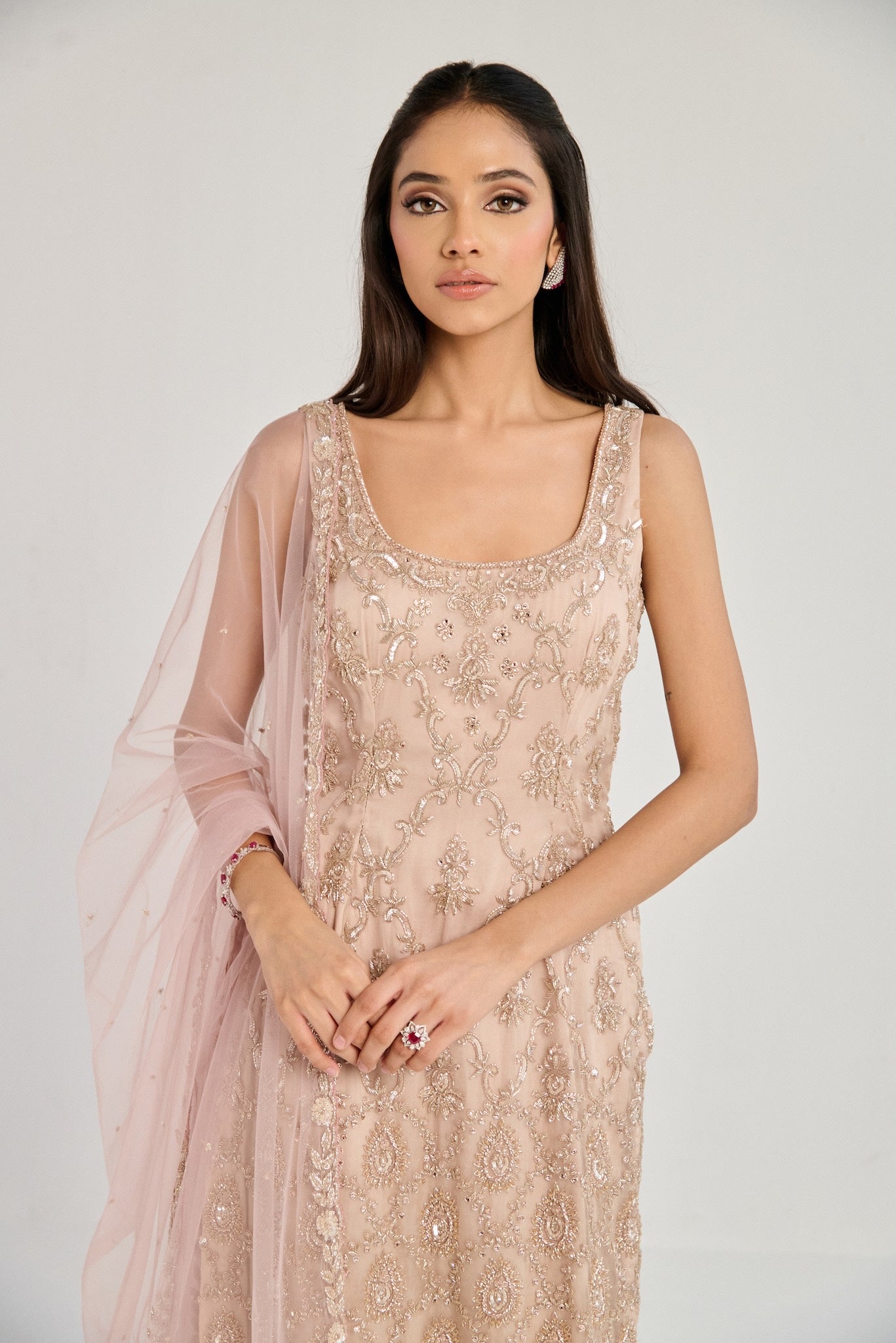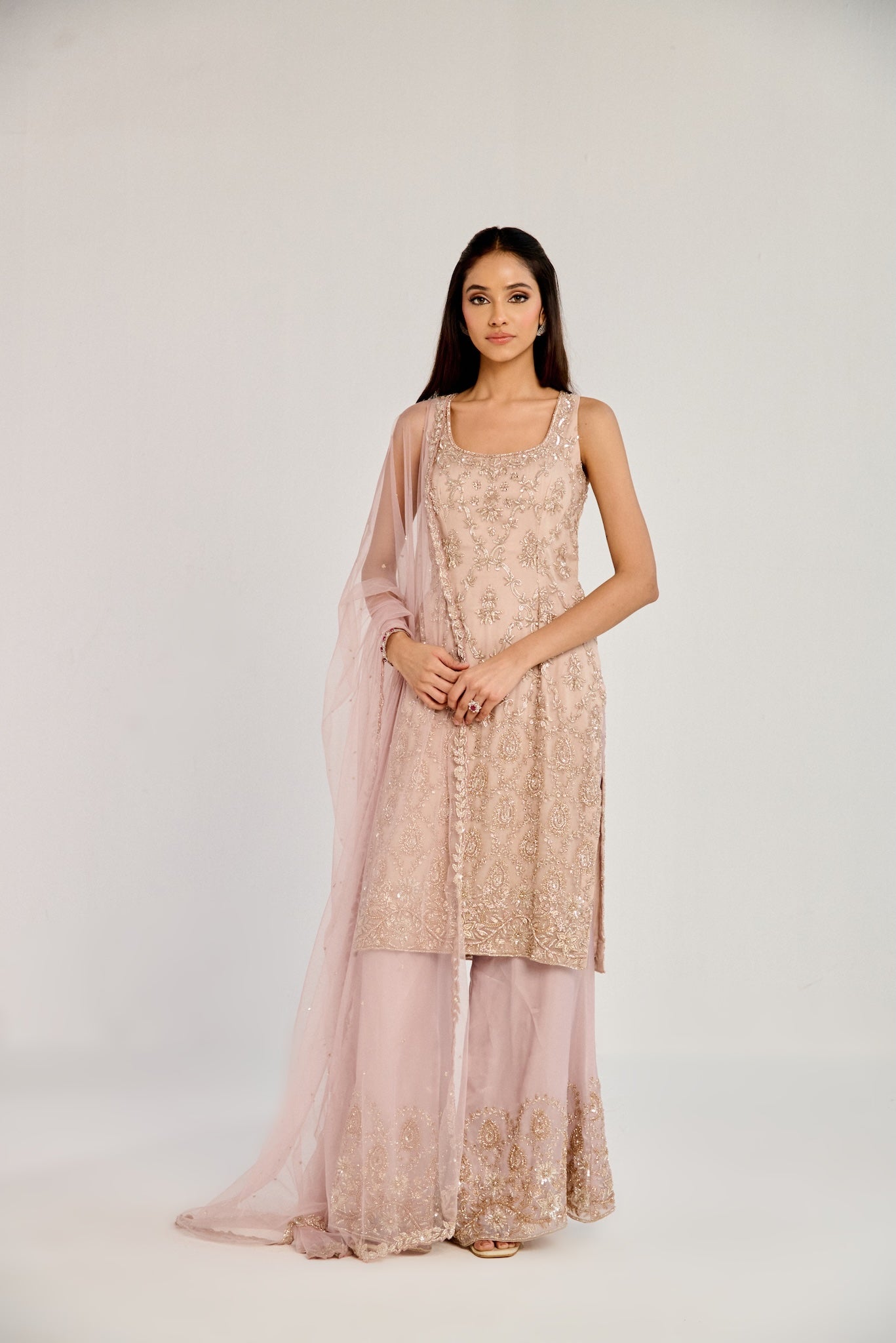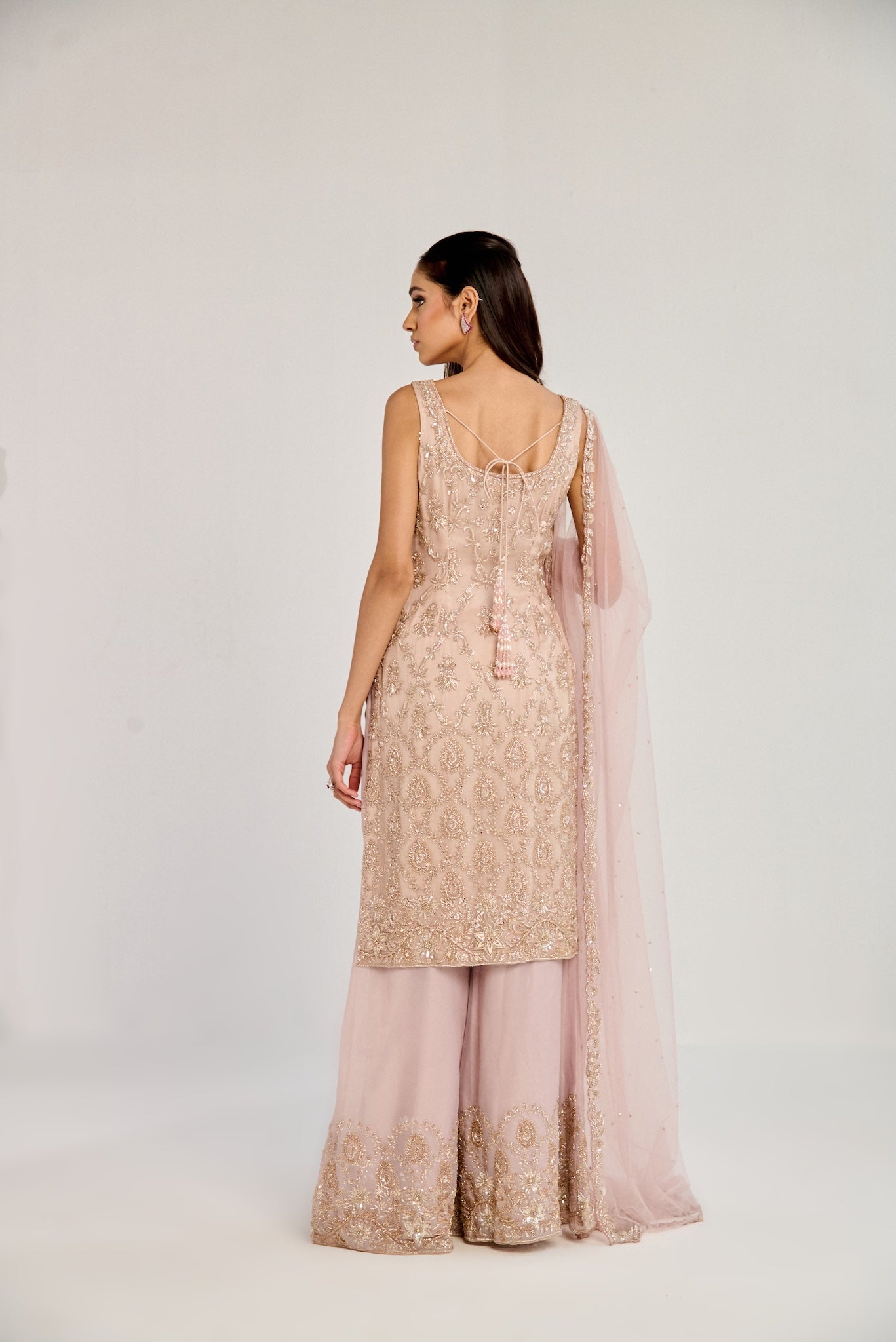 Featuring a pink suit, meticulously hand-embroidered on organza fabric with cutdana and crystal detailing and embroidered pants . Paired with a cutdana and crystal detailed dupatta with all over work.