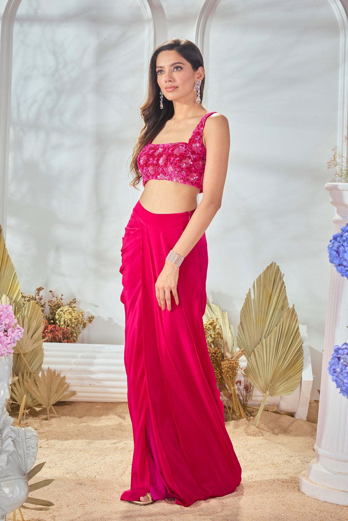 Featuring a pink pre-drape on georgette base with threadwork and sequin hand work. It comes with a stylish slit skirt Accentuate it with statement earrings and heels for a sangeet ceremony or cocktail look.