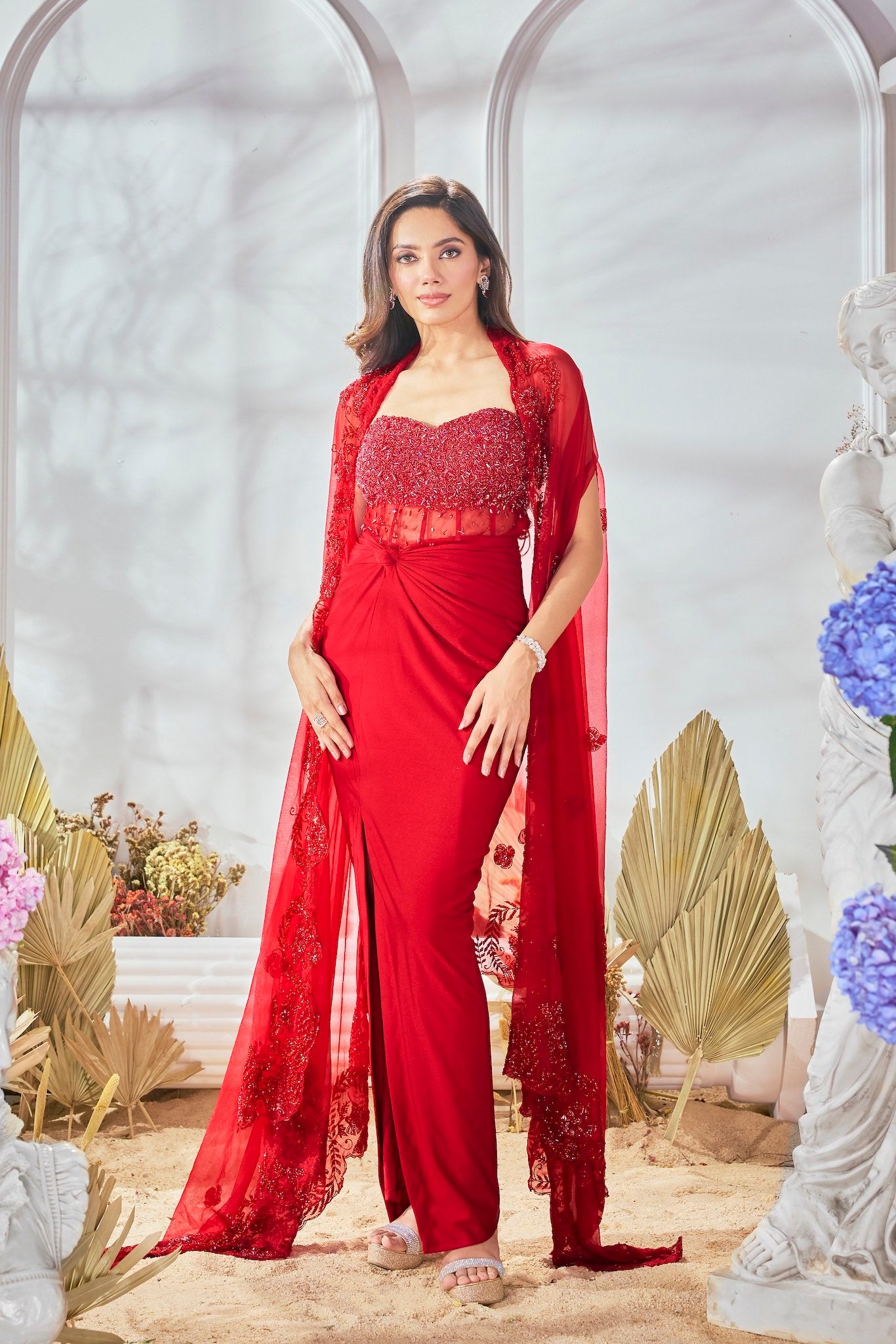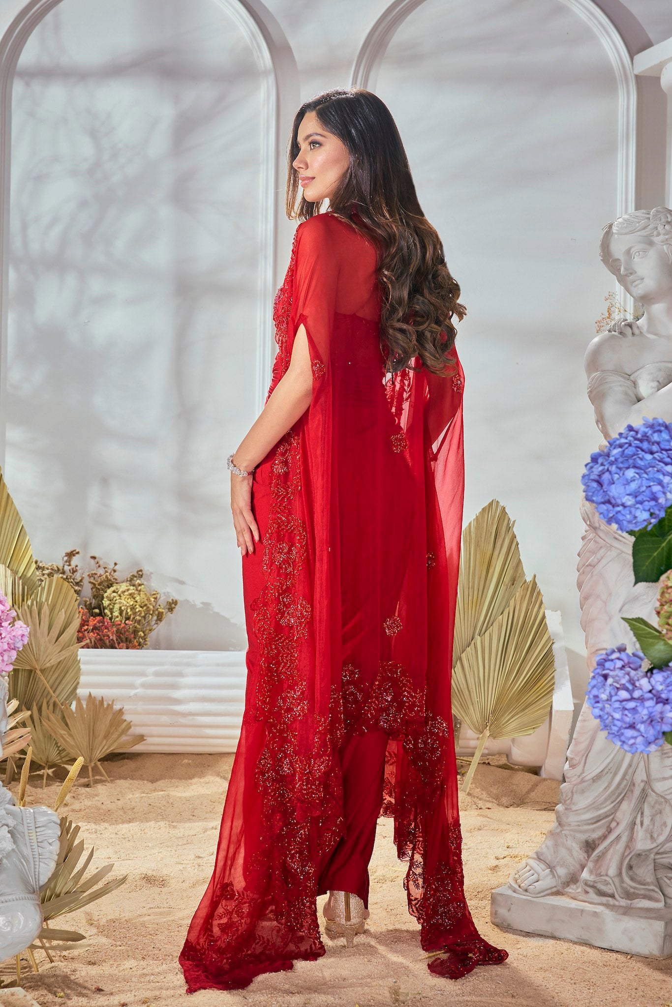 Featuring a red pre-drape on georgette base with cutdana and crystal hand work corset blouse. Accentuate it with statement earrings and heels for a sangeet ceremony or cocktail look.