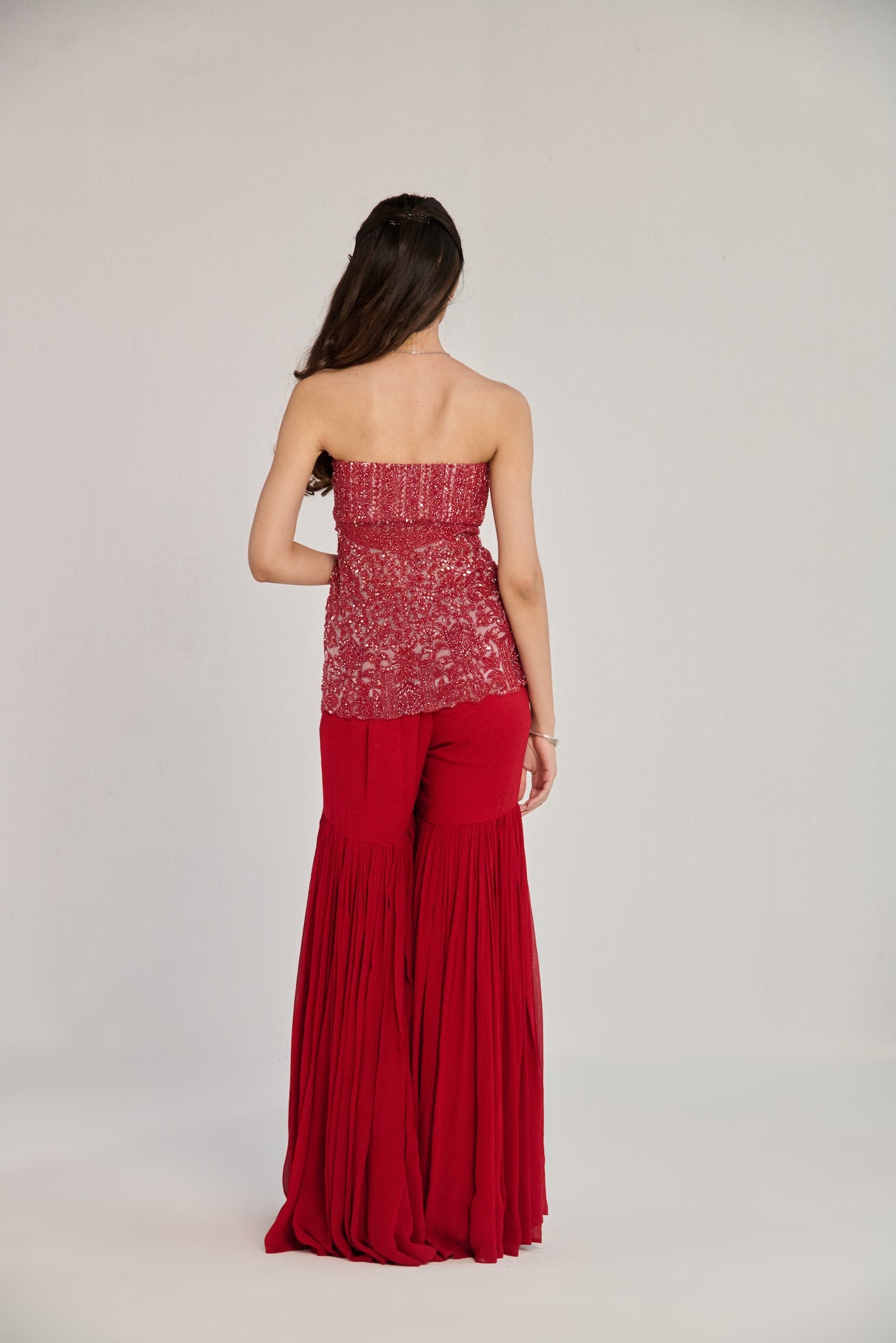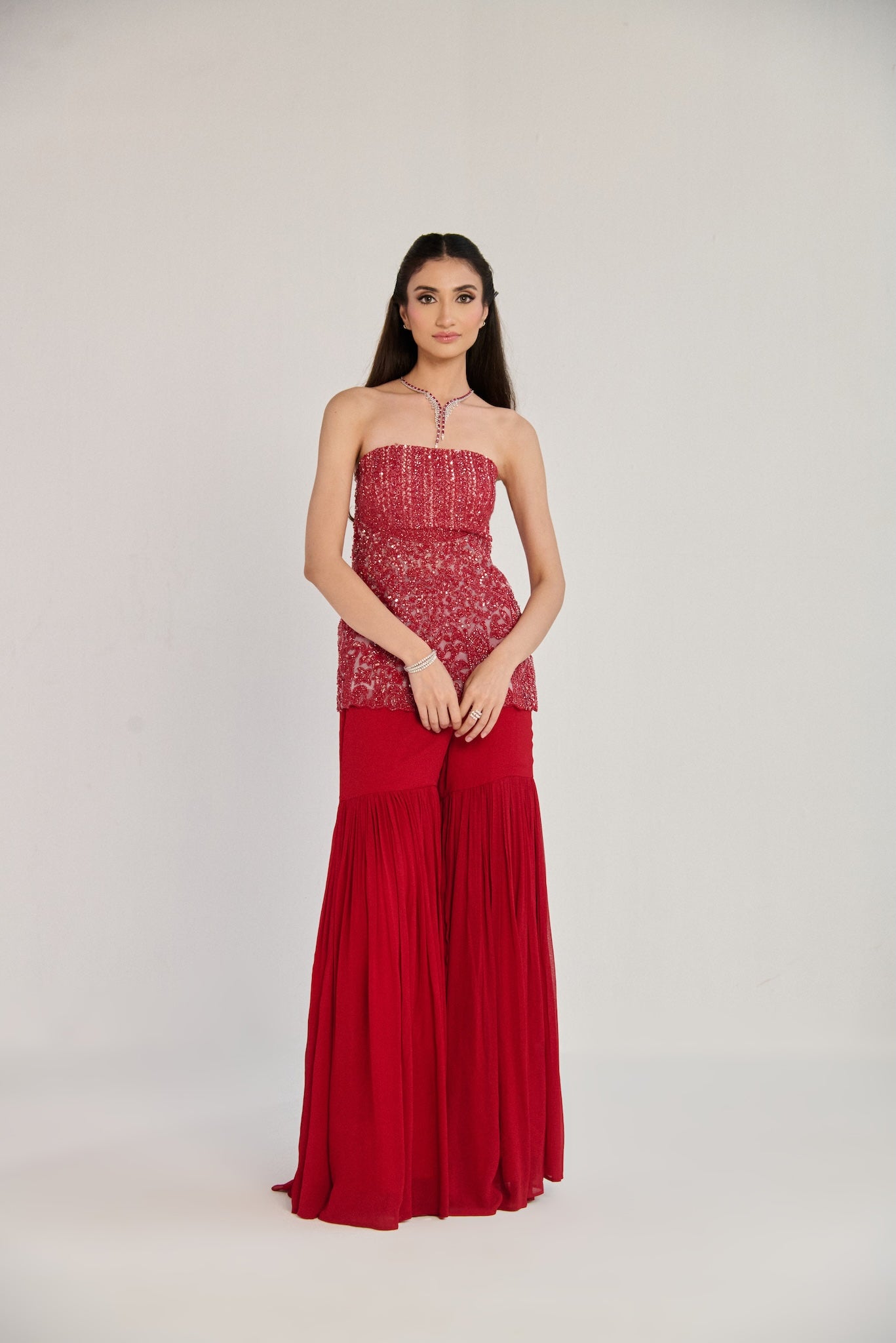 Featuring a red suit, meticulously hand-embroidered on tulle fabric with cutdana and crystal detailing and embroidered garara on georgette.