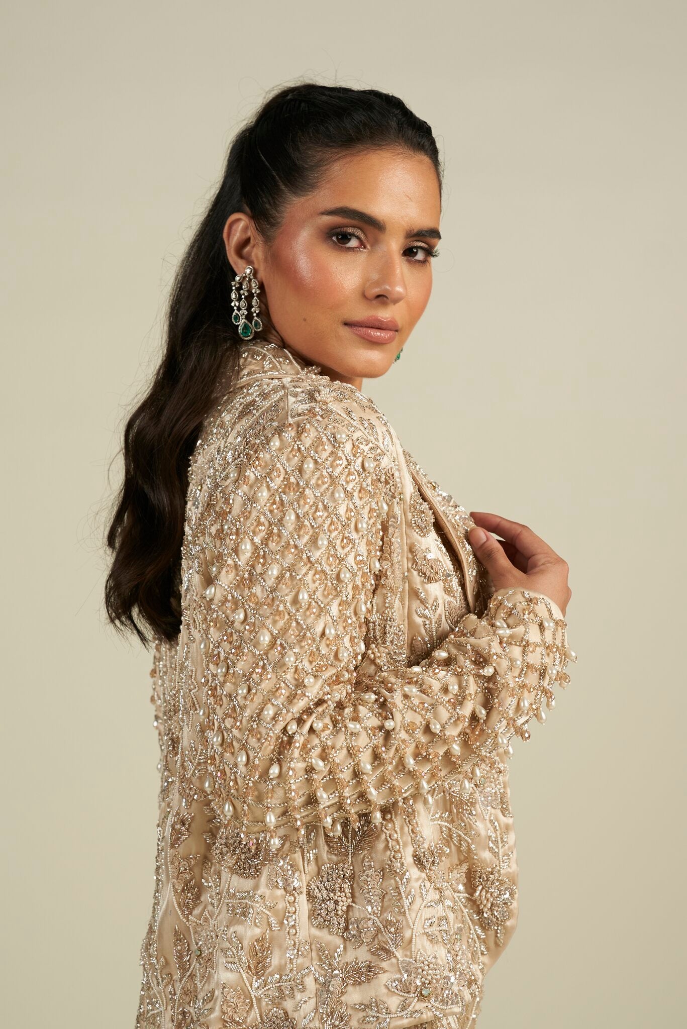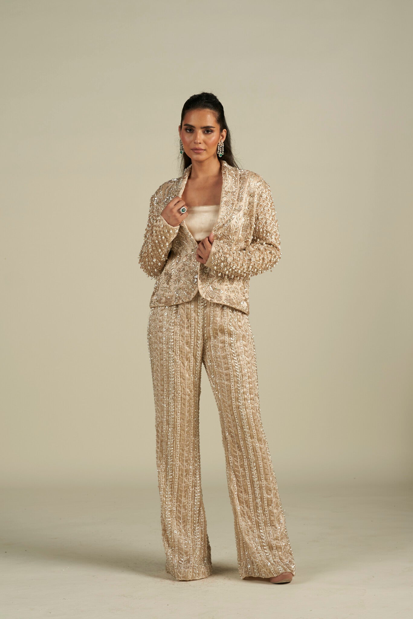 Fully hand embroidered pant suit done on organza fabric with cutdana, crystal, pearl and sequin detailing.