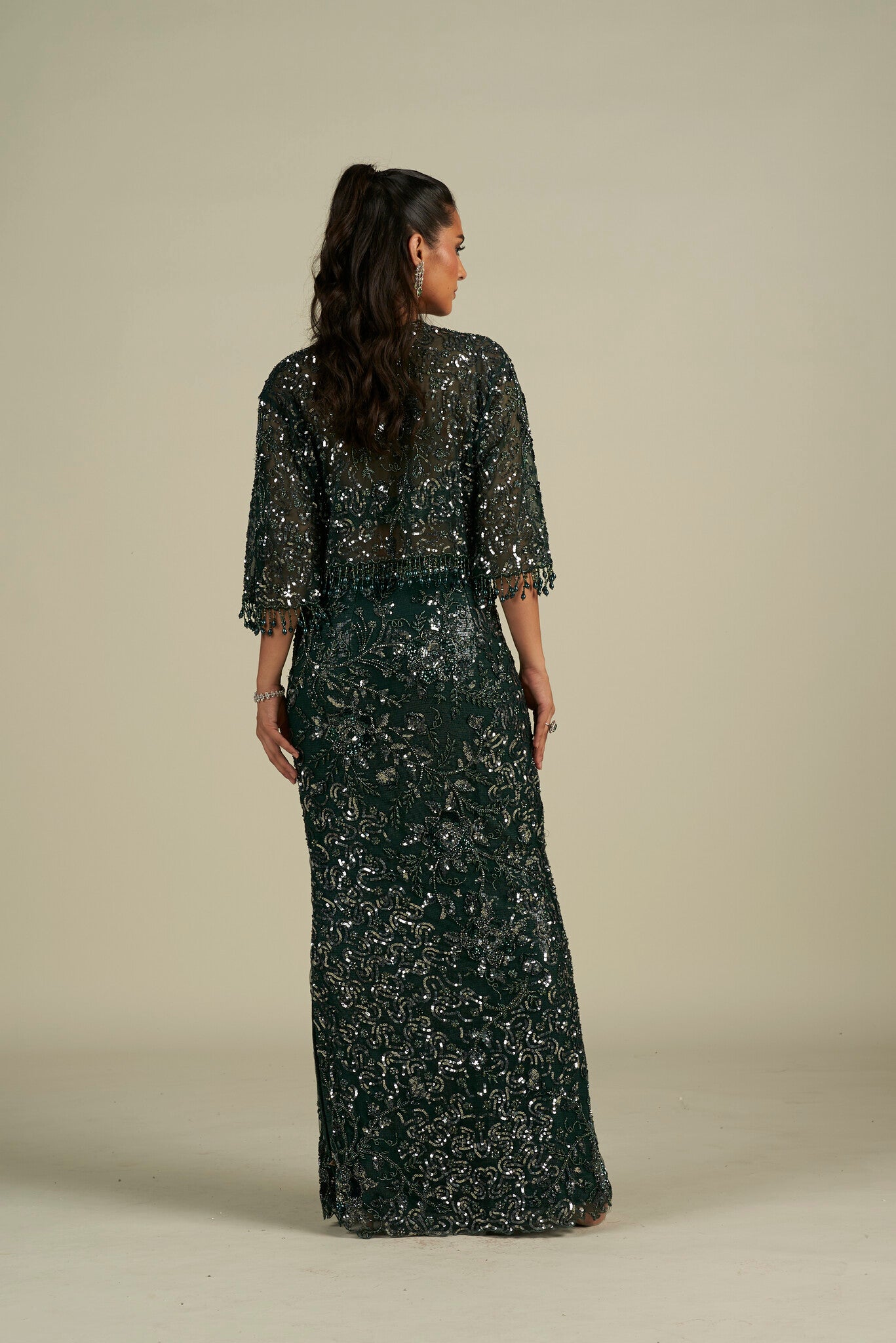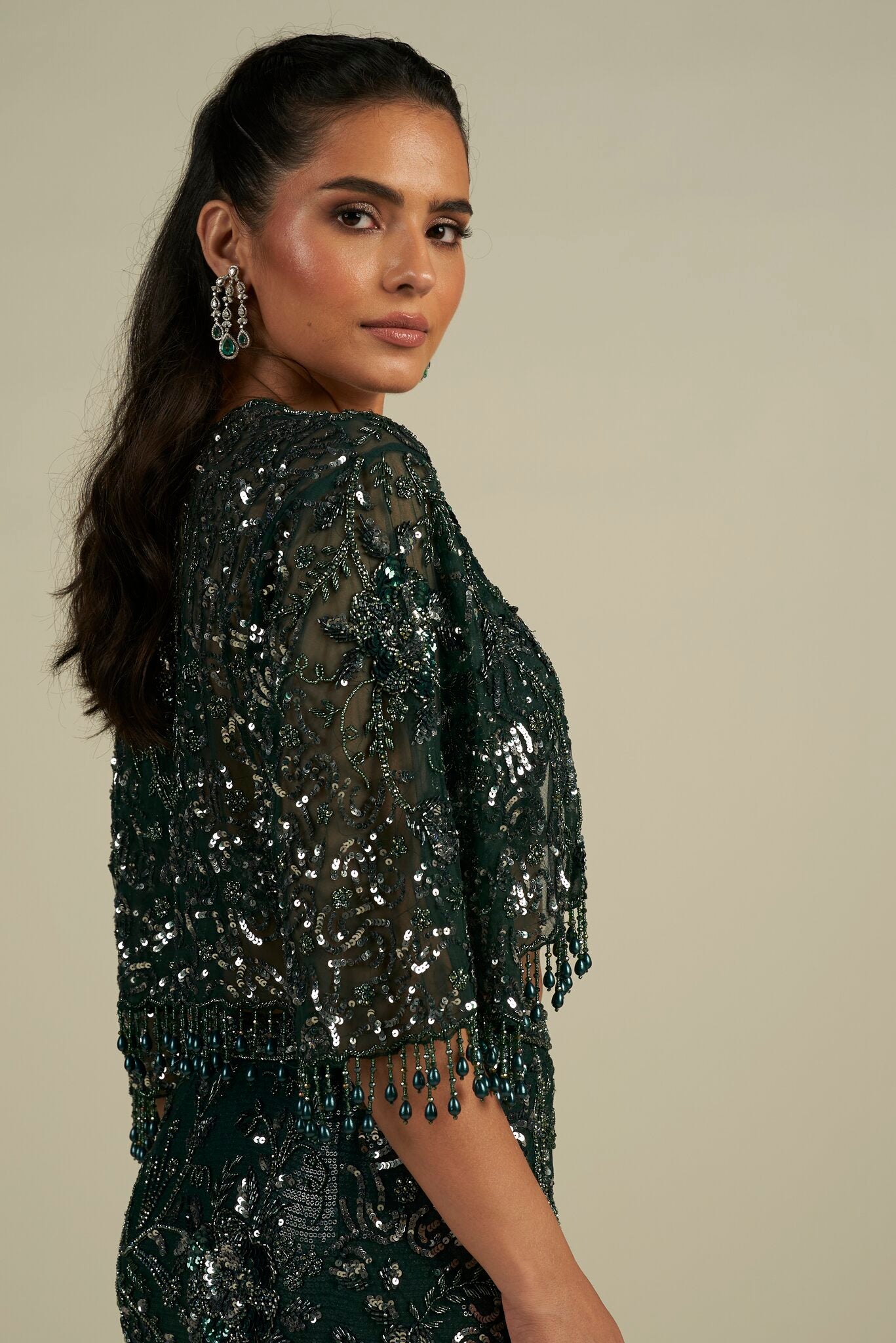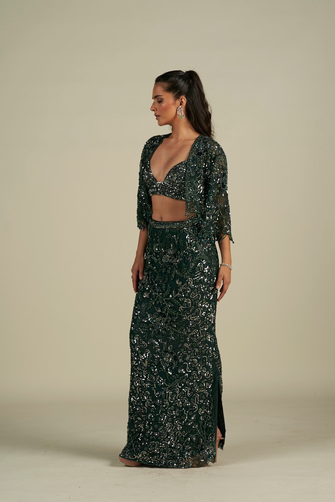 Featuring a green hand embroidered skirt set, meticulously hand-embroidered on tulle fabric with sequin, cutdana and crystal detailing. Paired with a sequin detailed matching jacket cape.