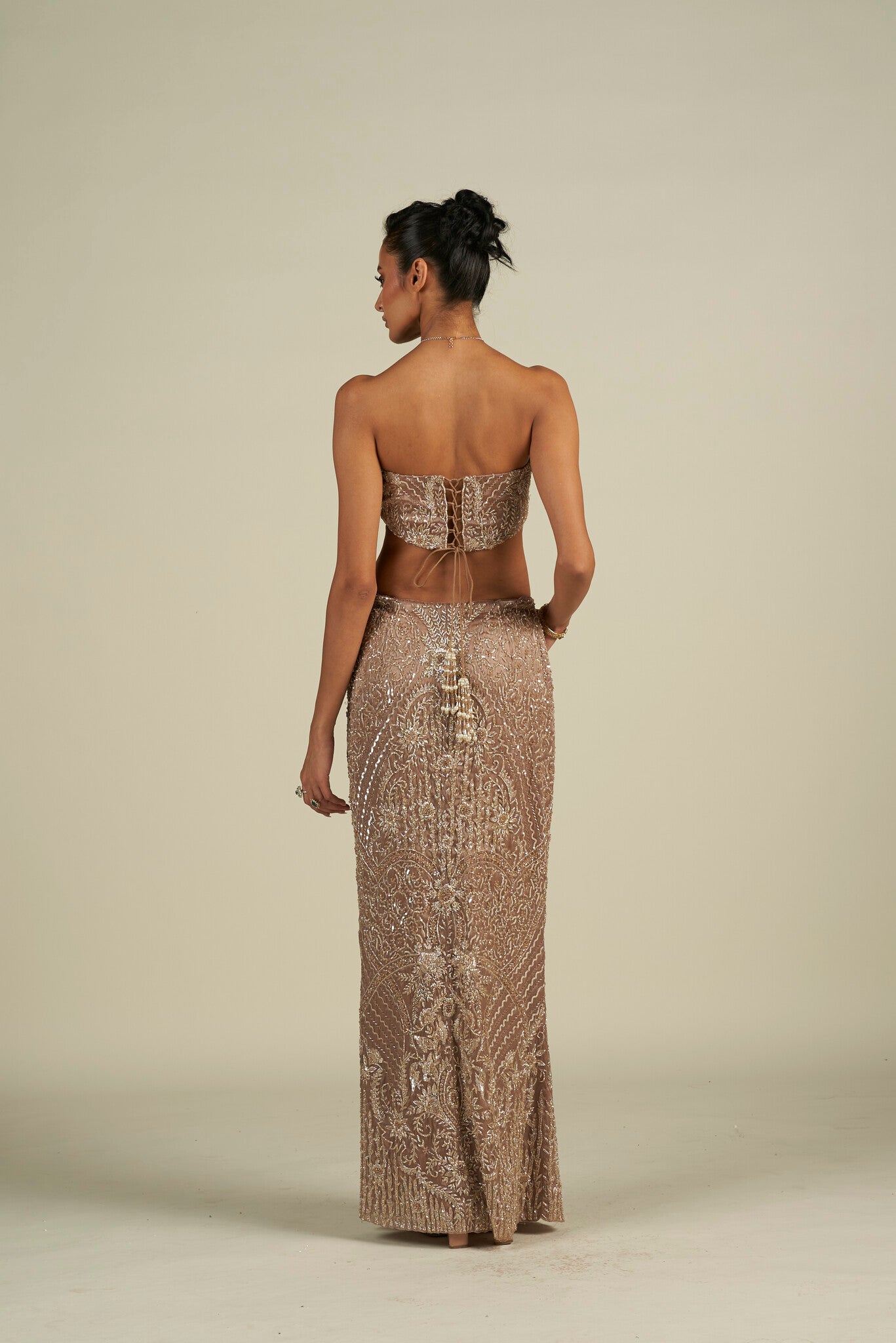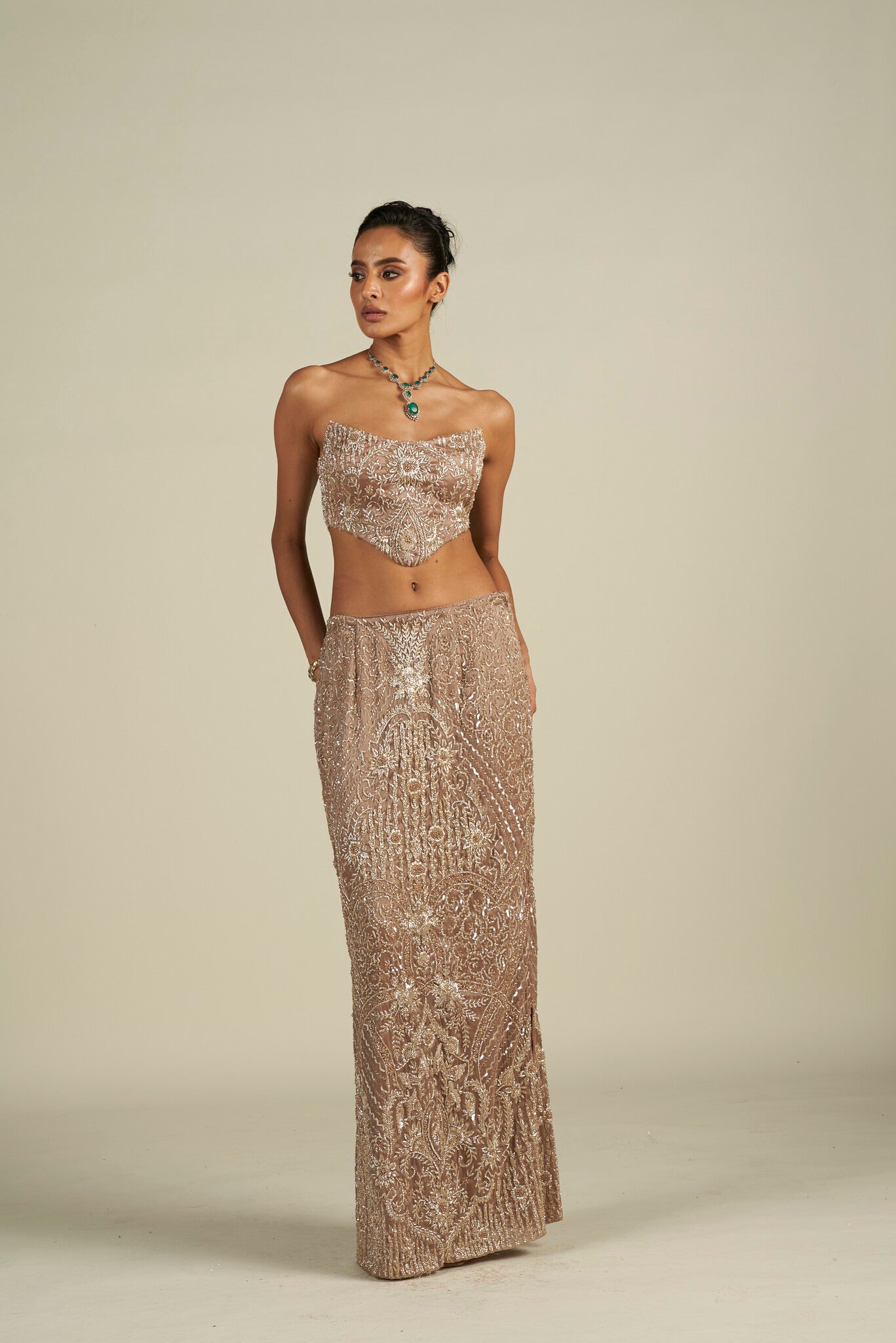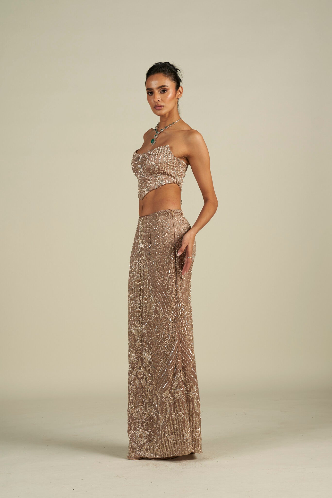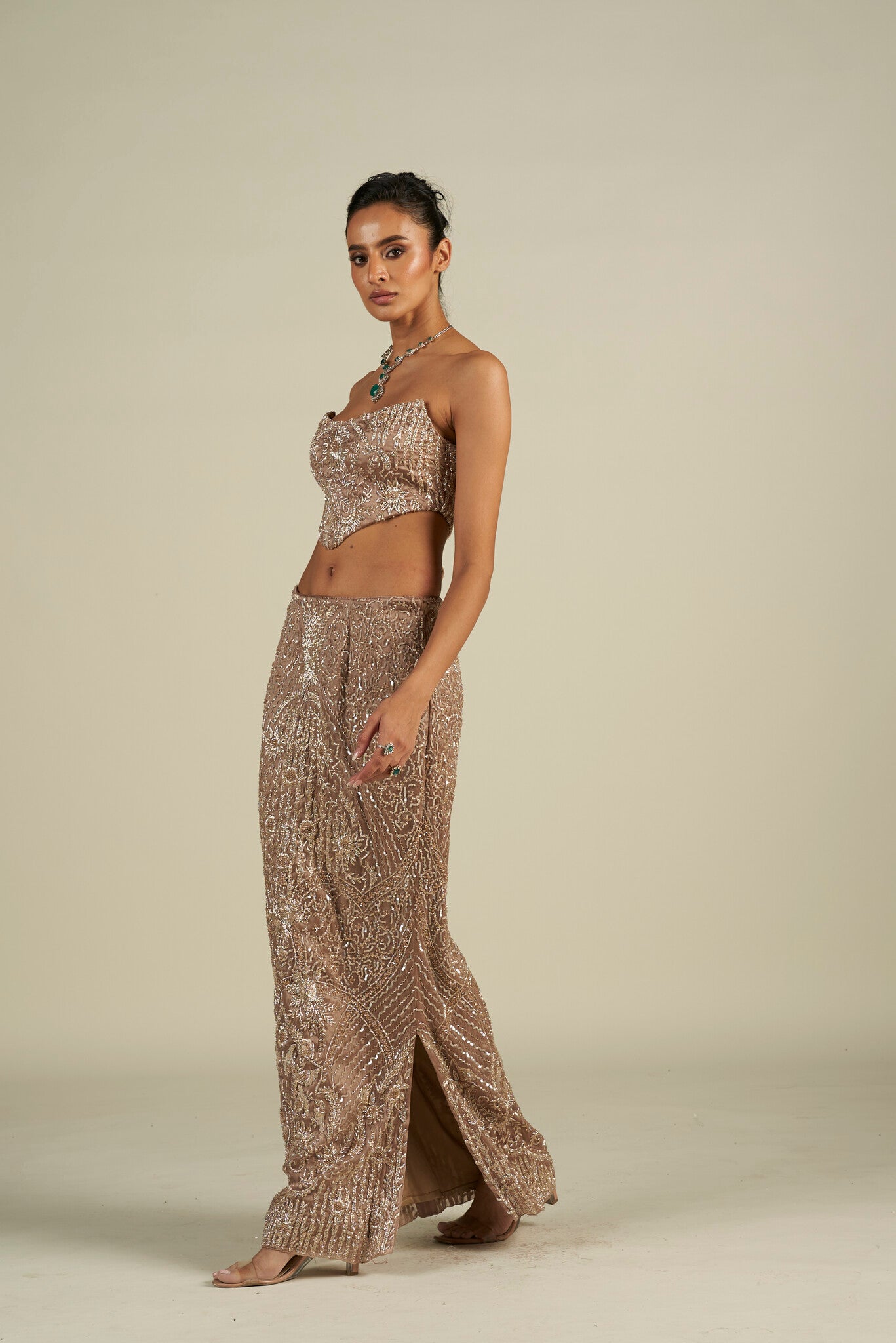 Featuring a brown hand embroidered skirt set, meticulously hand-embroidered on tissue organza fabric with sequin, cutdana and crystal detailing.
