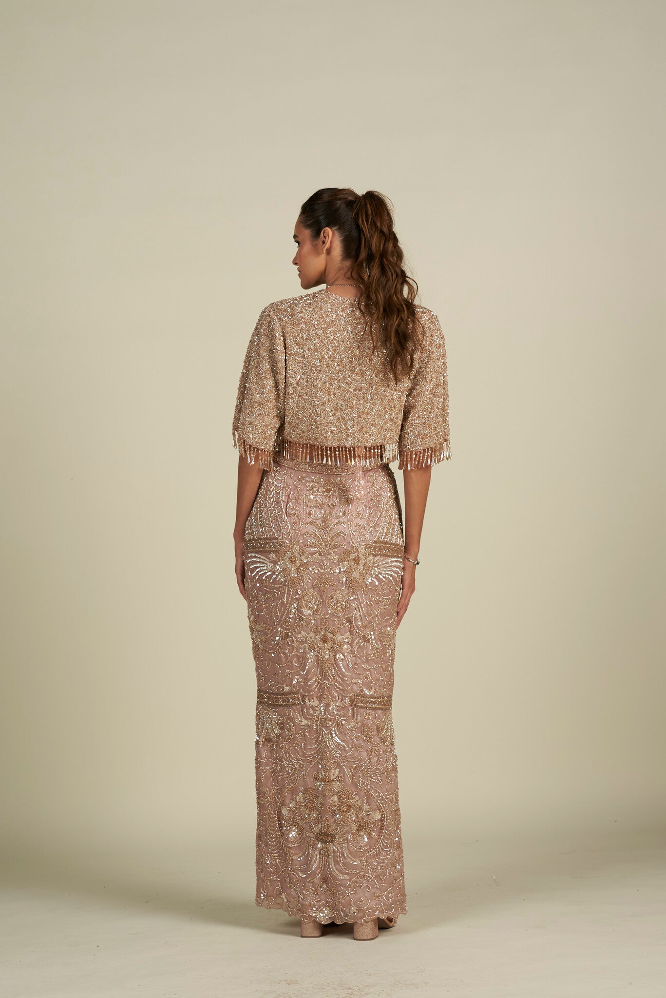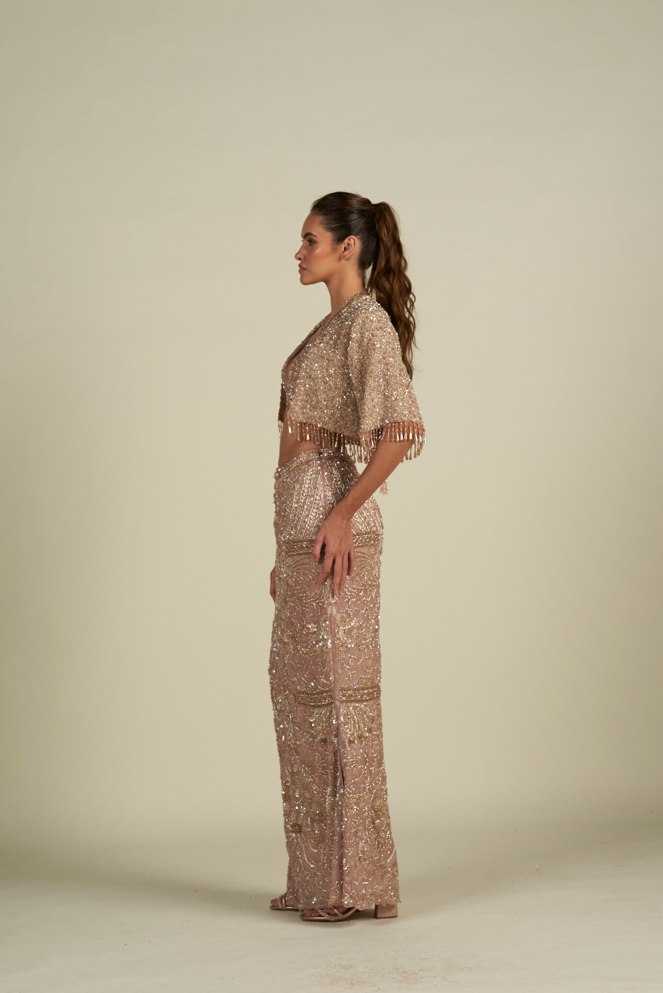 Featuring a mauve hand embroidered skirt set, meticulously hand-embroidered on organza fabric with sequin, cutdana and crystal detailing. Paired with a sequin and crystal detailed matching jacket cape