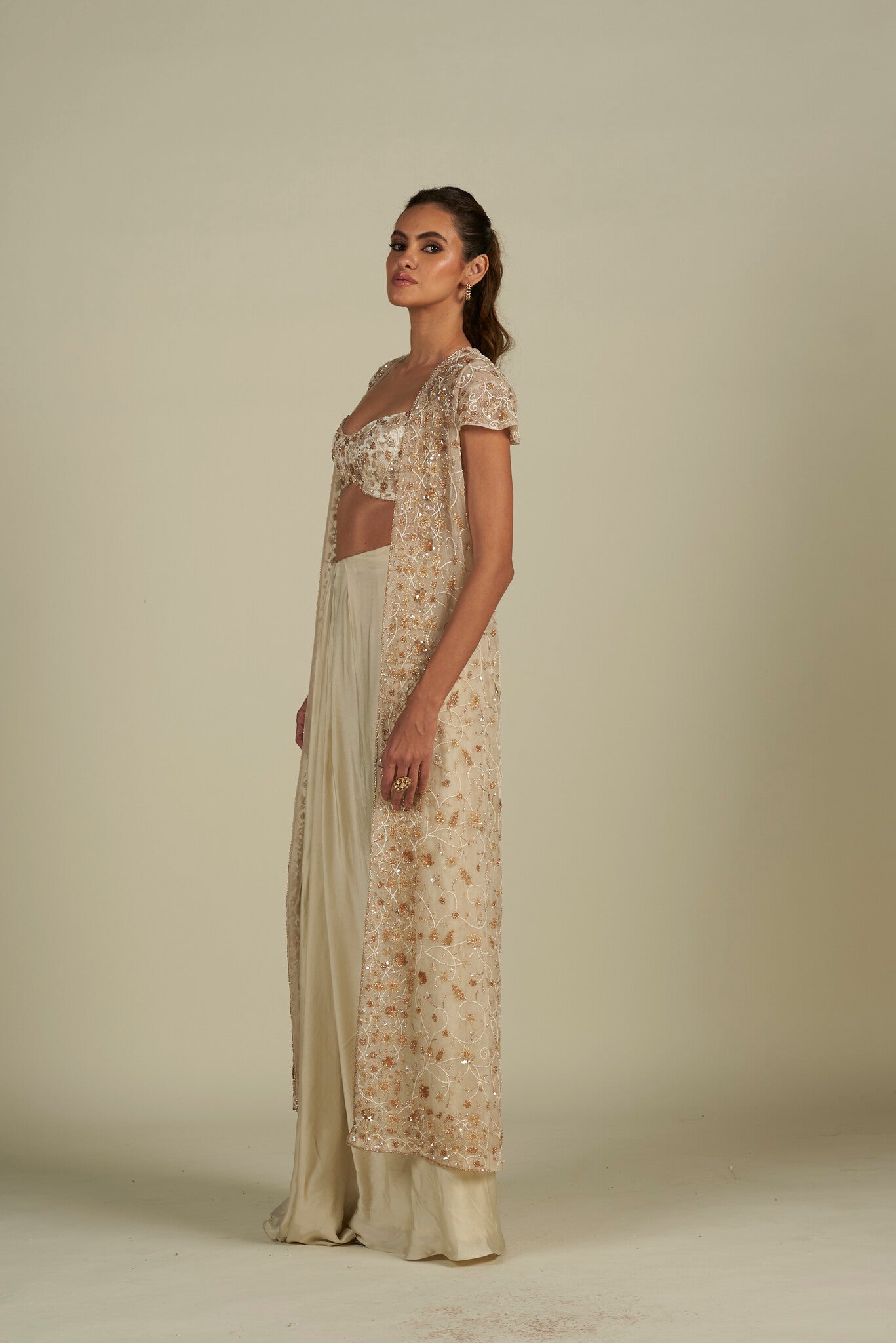 Featuring an white long cape skirt hand embroidered lehenga, meticulously hand-embroidered on organza fabric with sequin, cutdana and crystal detailing.