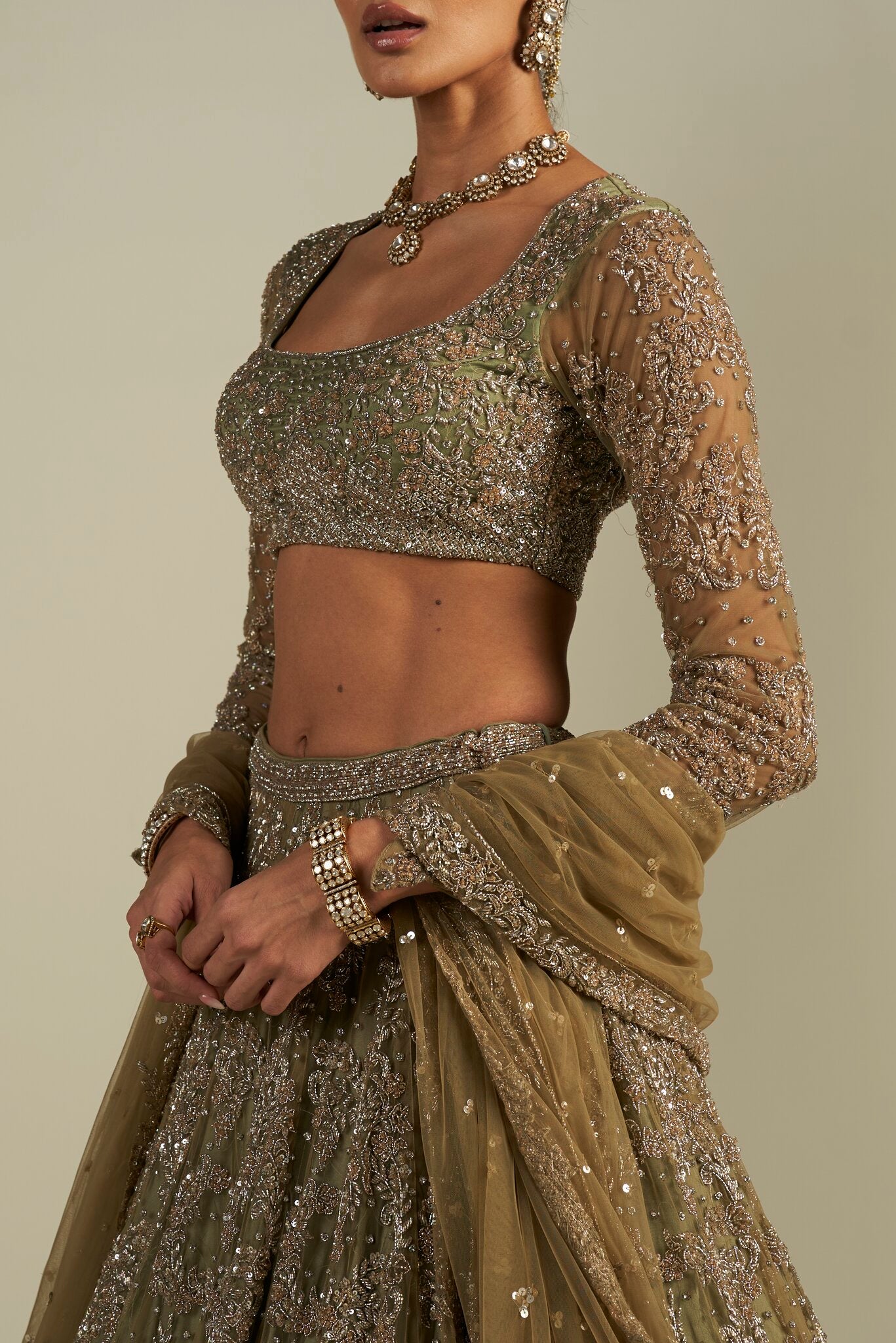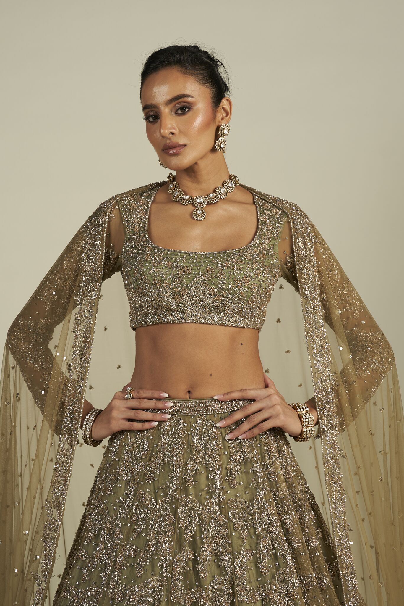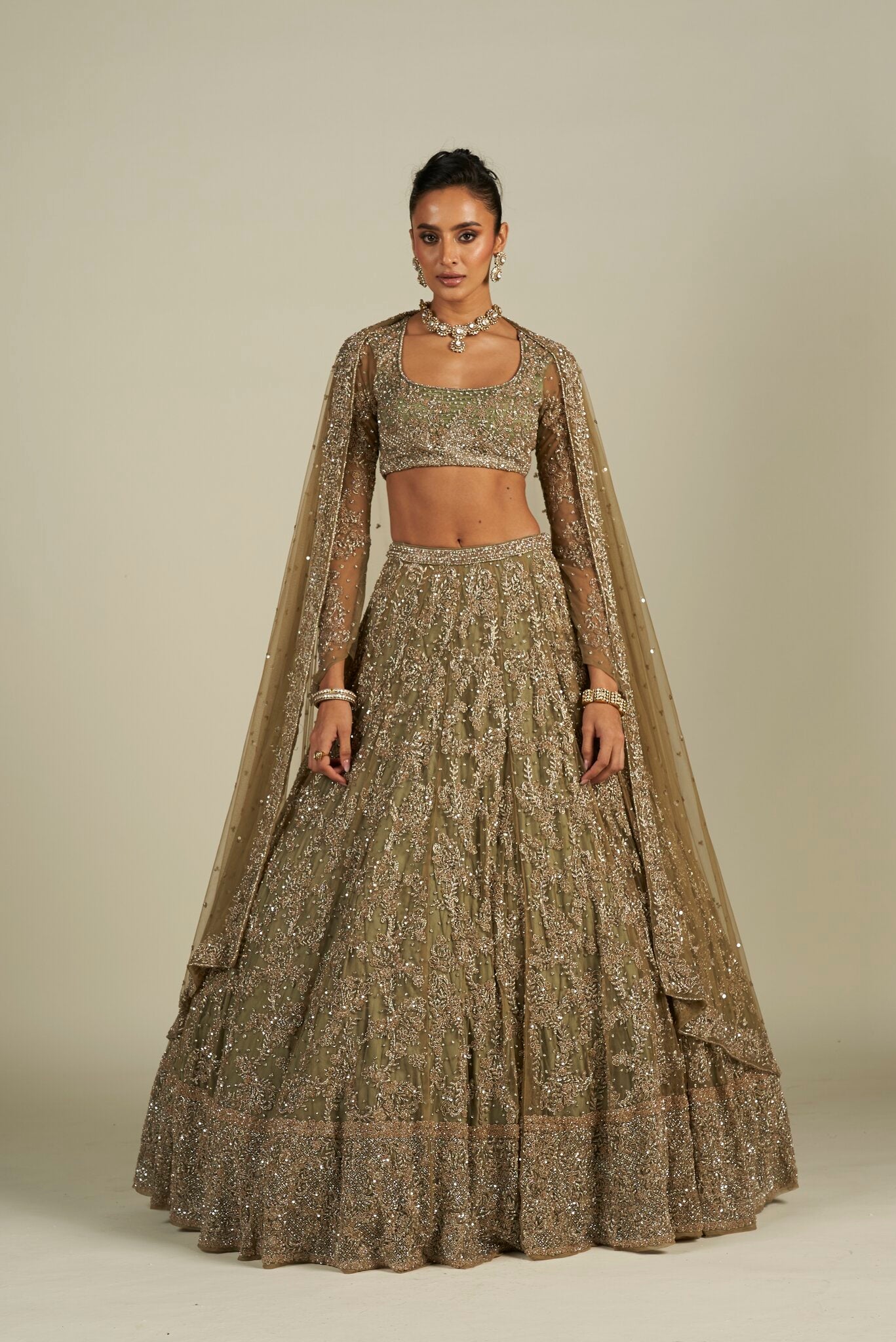 Featuring an olive green hand embroidered lehenga, meticulously hand-embroidered on tulle fabric with sequin, swarovski and cutdana detailing. Paired with a cutdana and sequin detailed matching dupatta with embroidery on all four sides.