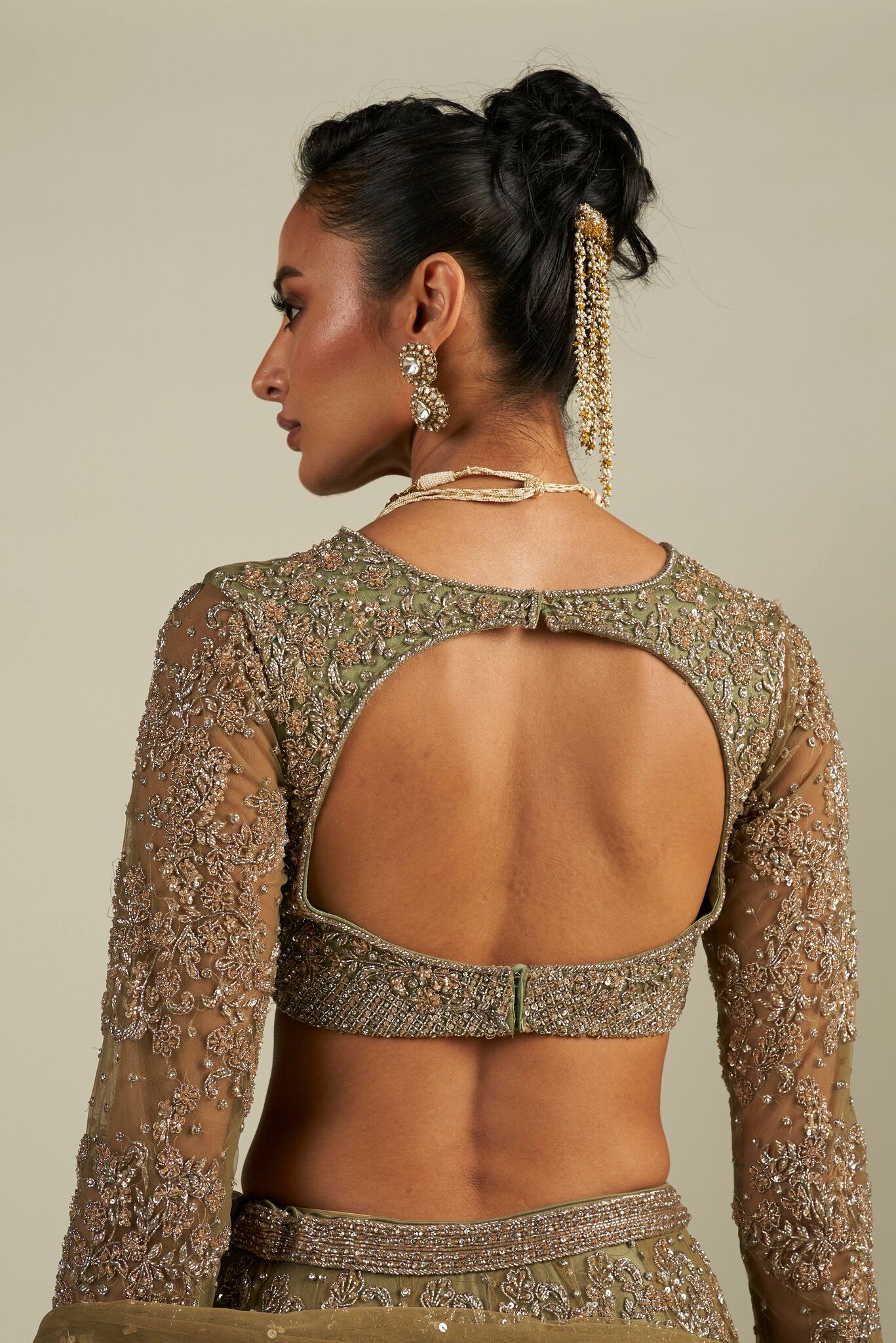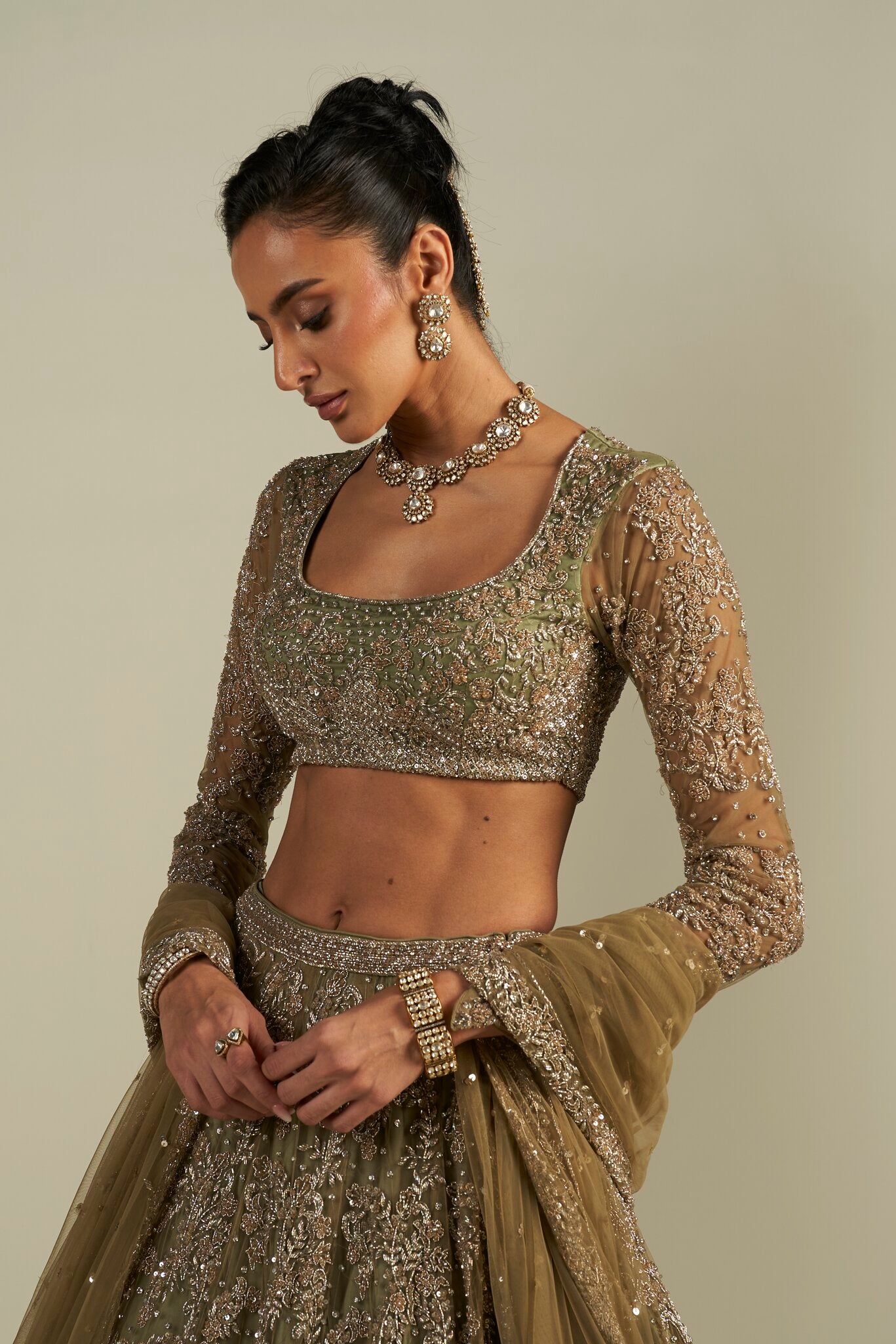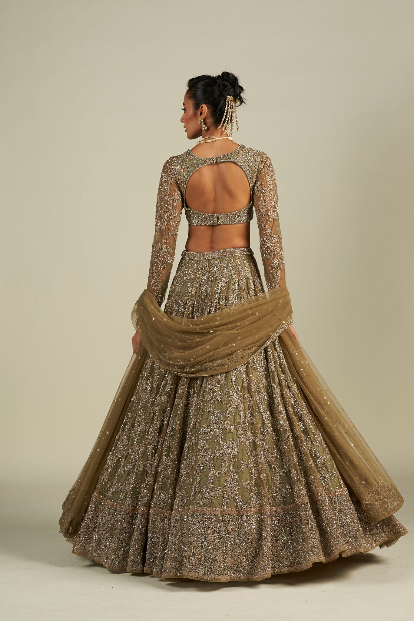 Featuring an olive green hand embroidered lehenga, meticulously hand-embroidered on tulle fabric with sequin, swarovski and cutdana detailing. Paired with a cutdana and sequin detailed matching dupatta with embroidery on all four sides.