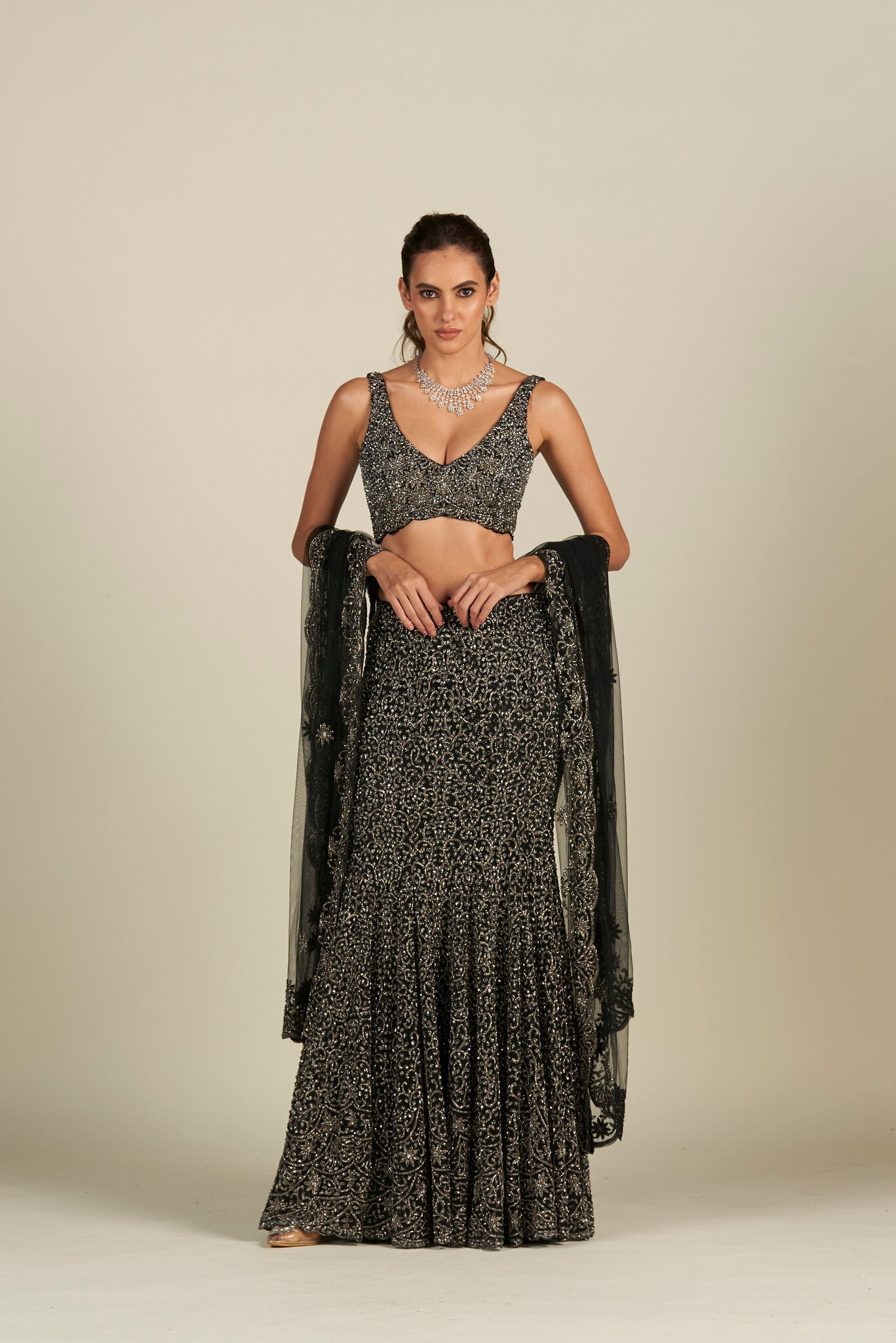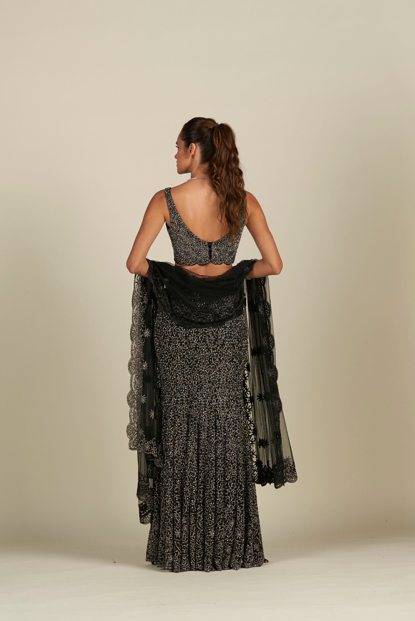 Featuring a black hand embroidered skirt done on tulle fabric with cutdana and crystal embroidery work. It is paired with a matching embroidered dupatta.