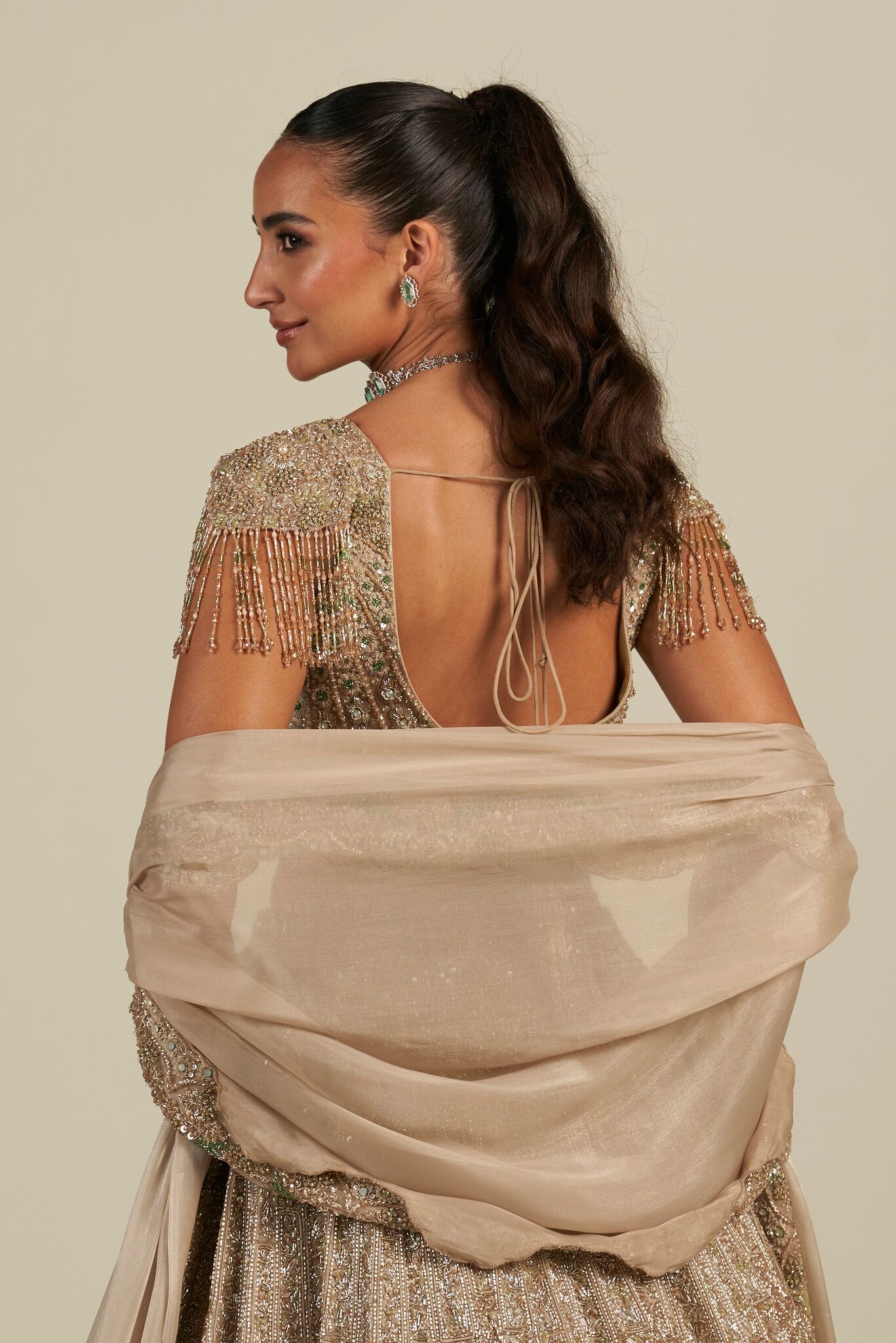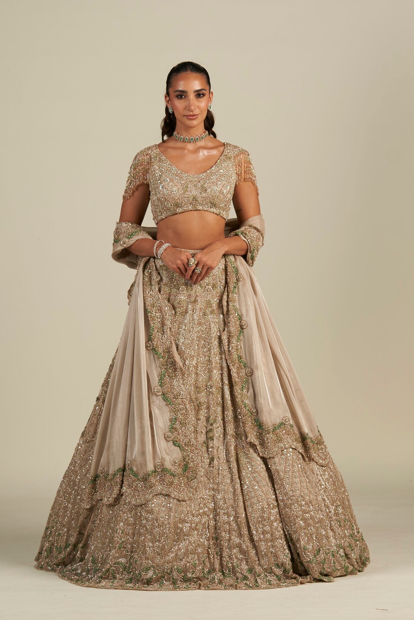 Featuring an ivory hand embroidered lehenga, meticulously hand-embroidered on tissue organza fabric with sequin, cutdana, crystal and dabka detailing. Paired with a cutdana and crystal detailed matching tissue organza dupatta with embroidery on all four sides.