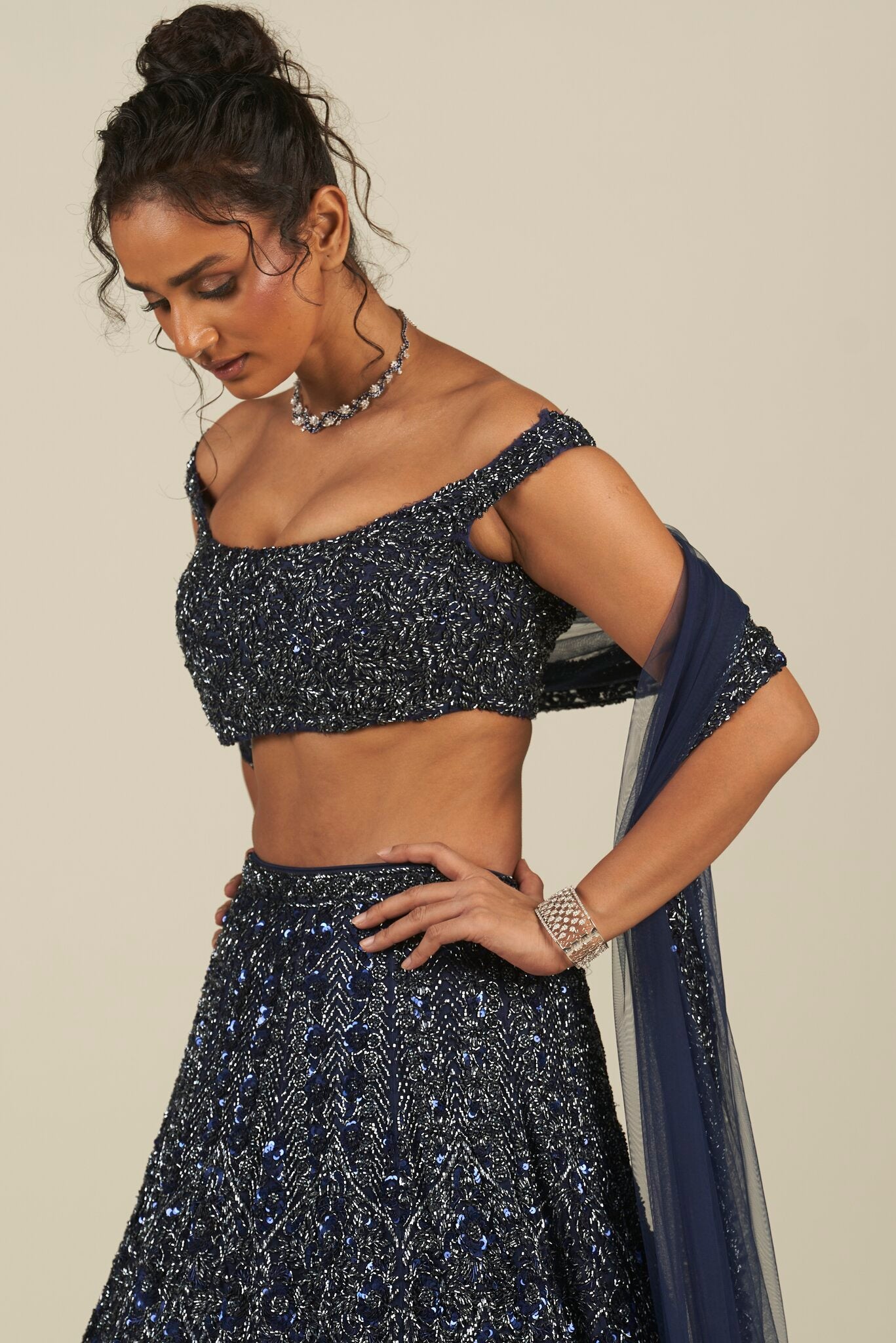 Featuring a navy blue hand embroidered lehenga, meticulously hand-embroidered on tulle fabric with sequin, crystals and cutdana detailing. Paired with a cutdana and crystal detailed matching dupatta with embroidery on all four sides.