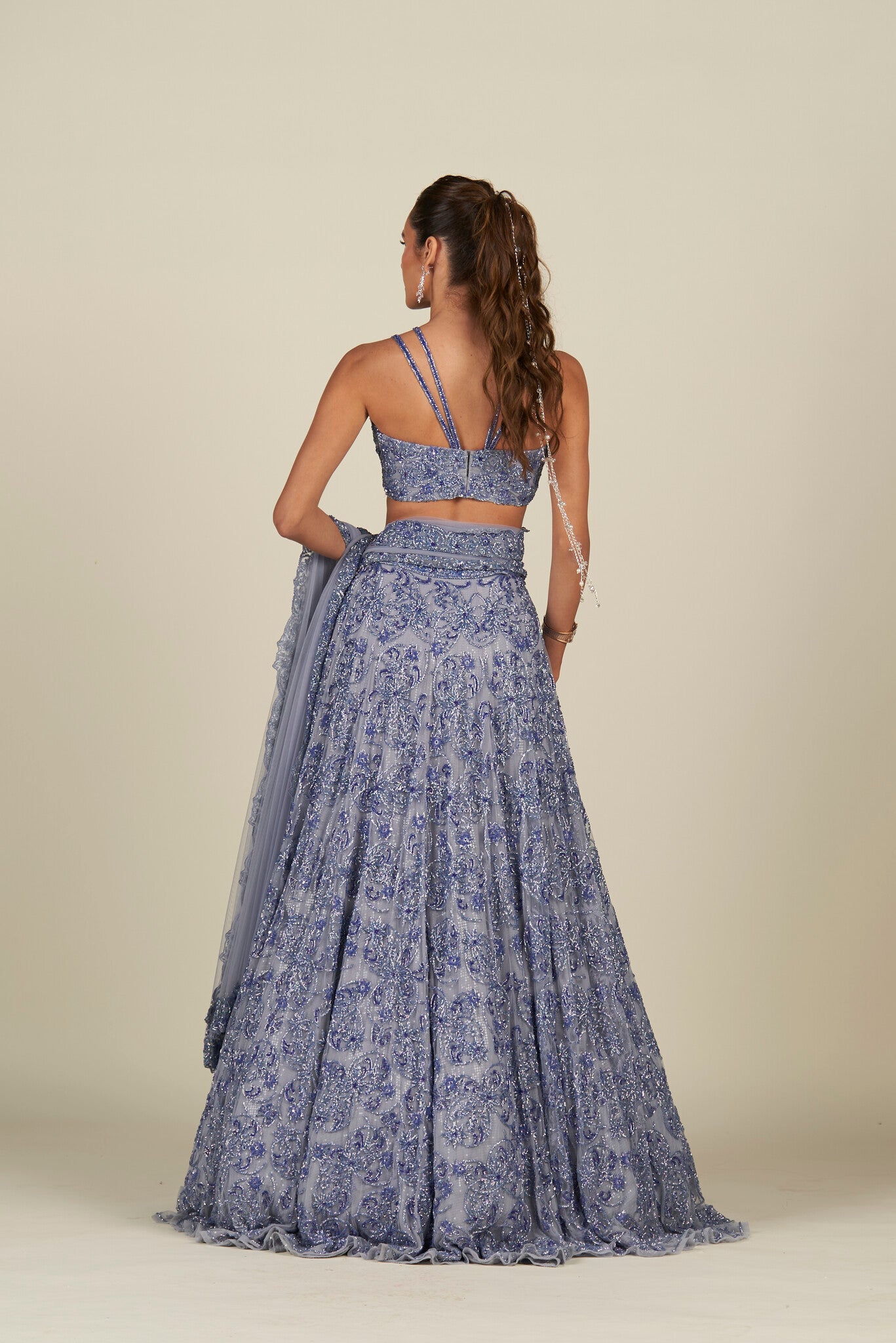 Featuring a blue hand embroidered lehenga, meticulously hand-embroidered on tulle fabric with sequin, cutdana and crystal detailing. Paired with a sequin detailed matching dupatta with embroidery on all four sides.