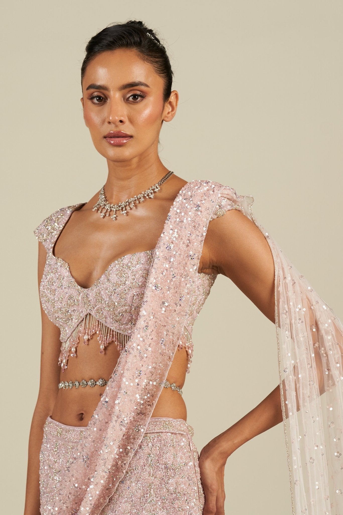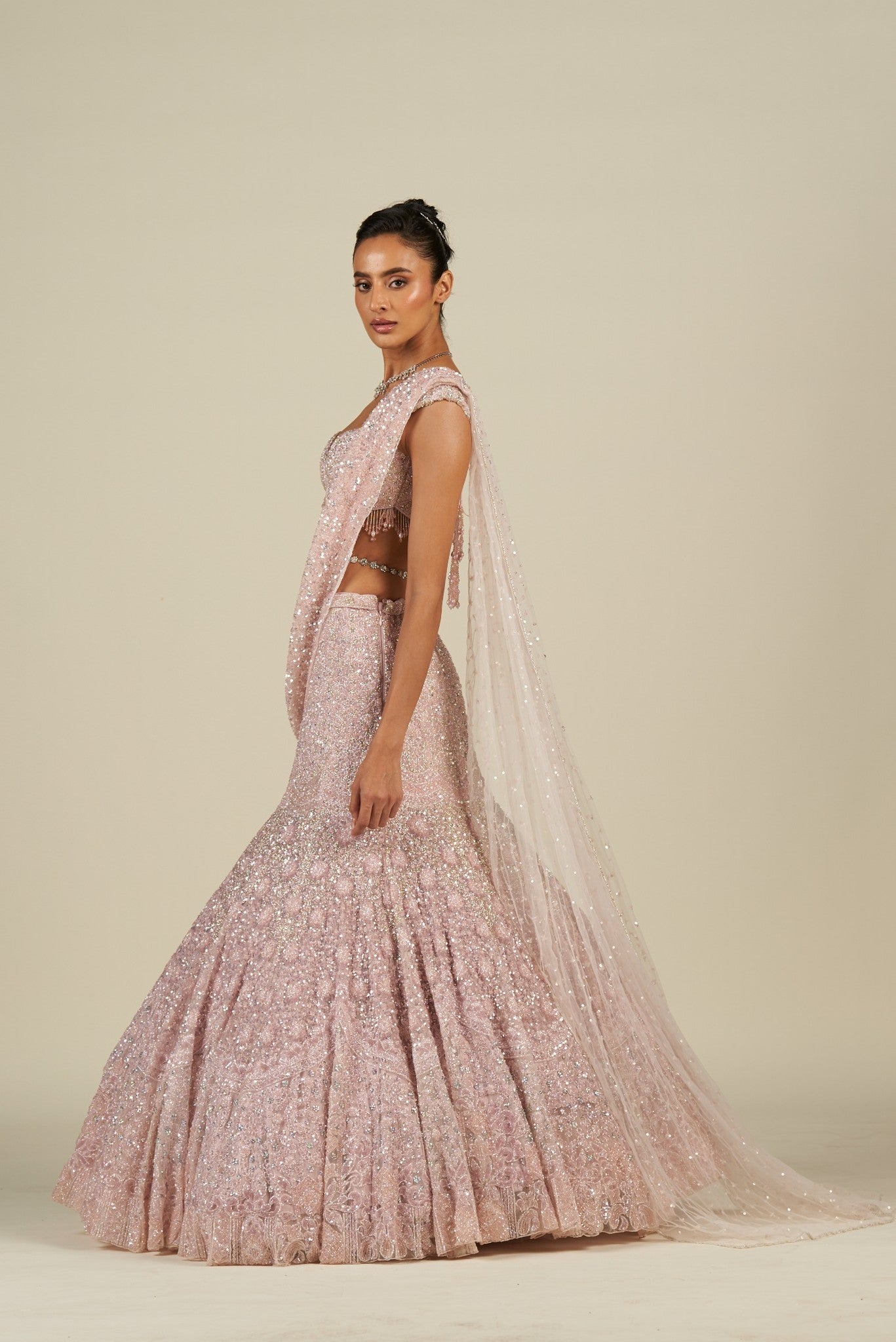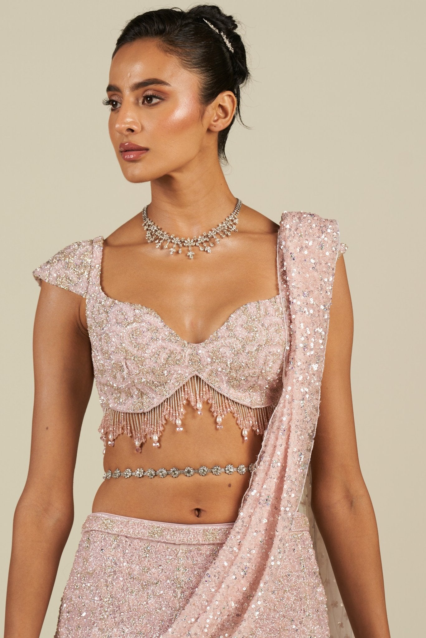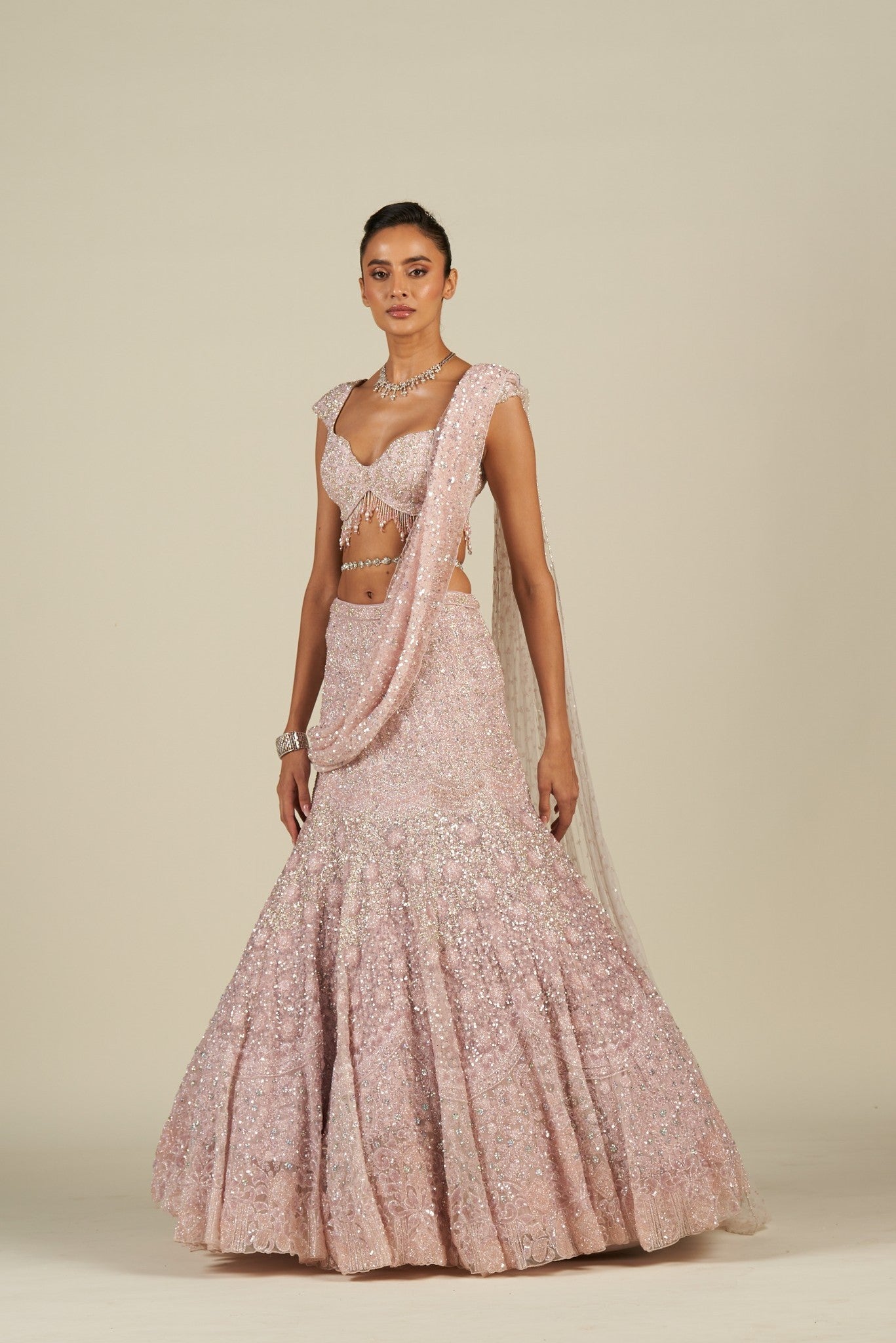 Featuring a blush pink lehenga, meticulously hand-embroidered on tulle fabric with crystals, cutdana and sequin detailing. Paired with a cutdana and crystal detailed matching drape dupatta with beads fashioned tassel detailing on blouse.