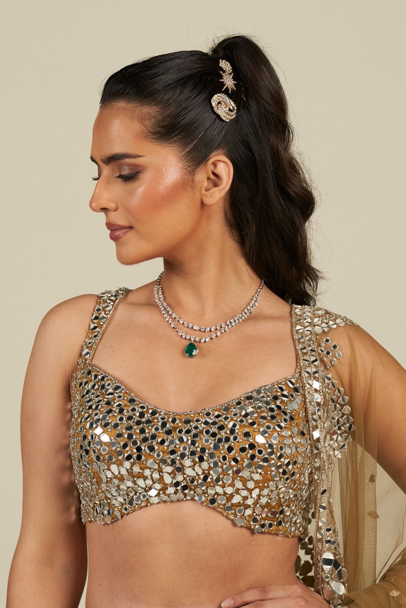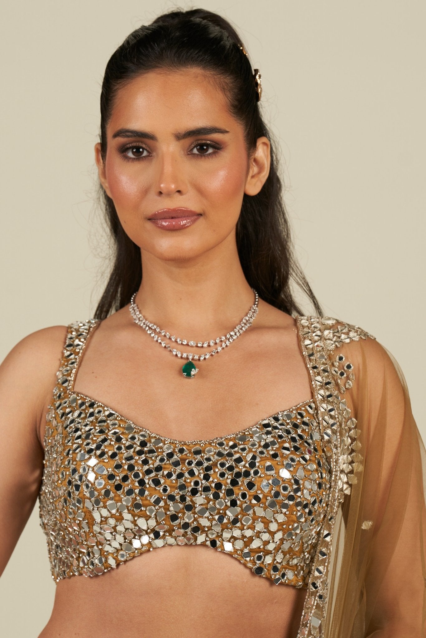 Featuring an olive green mirror work lehenga, meticulously hand-embroidered on tulle fabric with mirror and zari detailing. Paired with a mirror work detailed tulle dupatta with embroidery on all four sides.