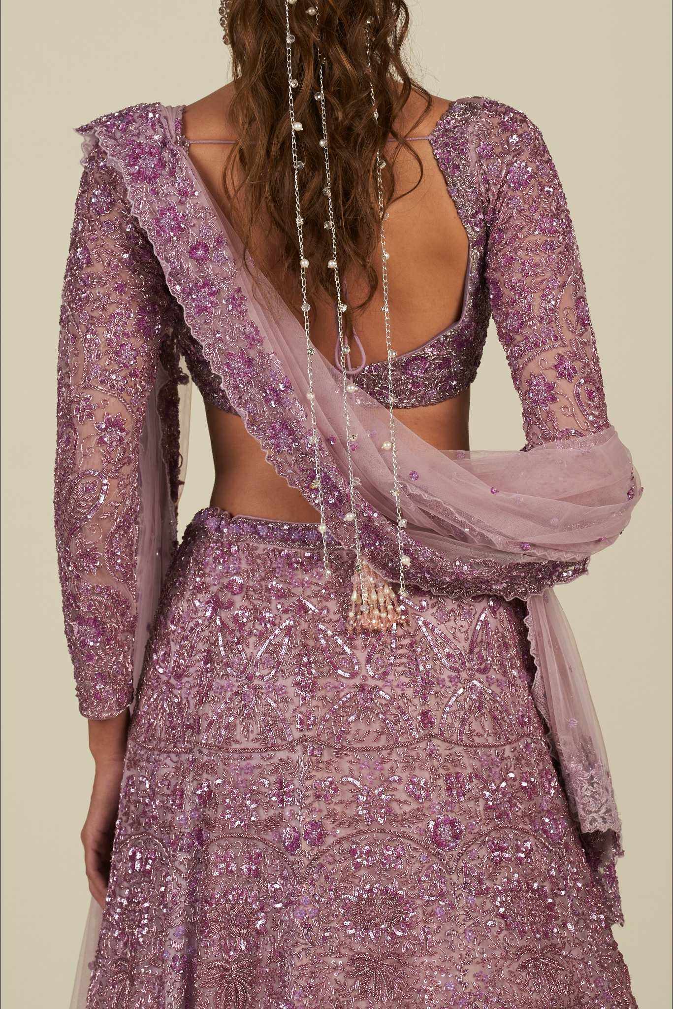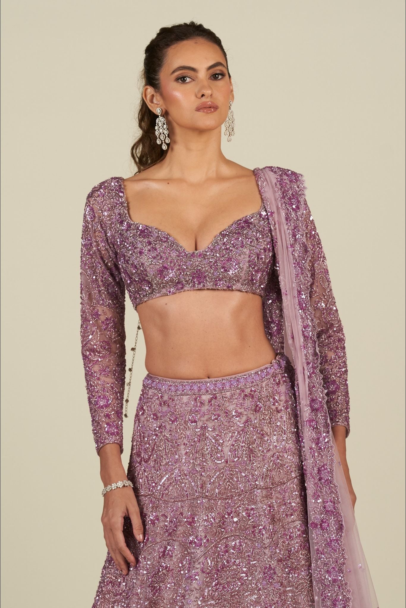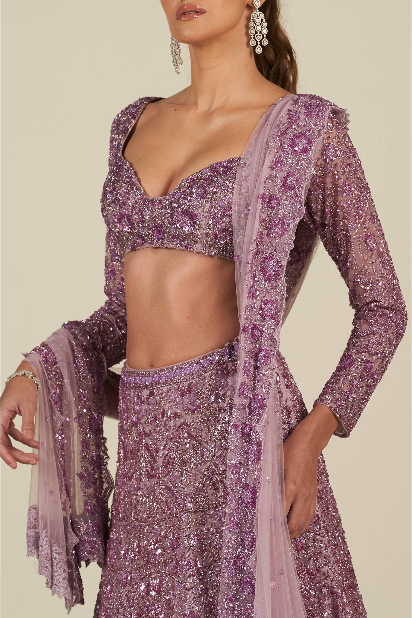 Featuring a lavender lehenga, meticulously hand-embroidered on organza fabric with crystals, cutdana and sequin detailing. Paired with a cutdana and crystal detailed matching dupatta with embroidery on all four sides.