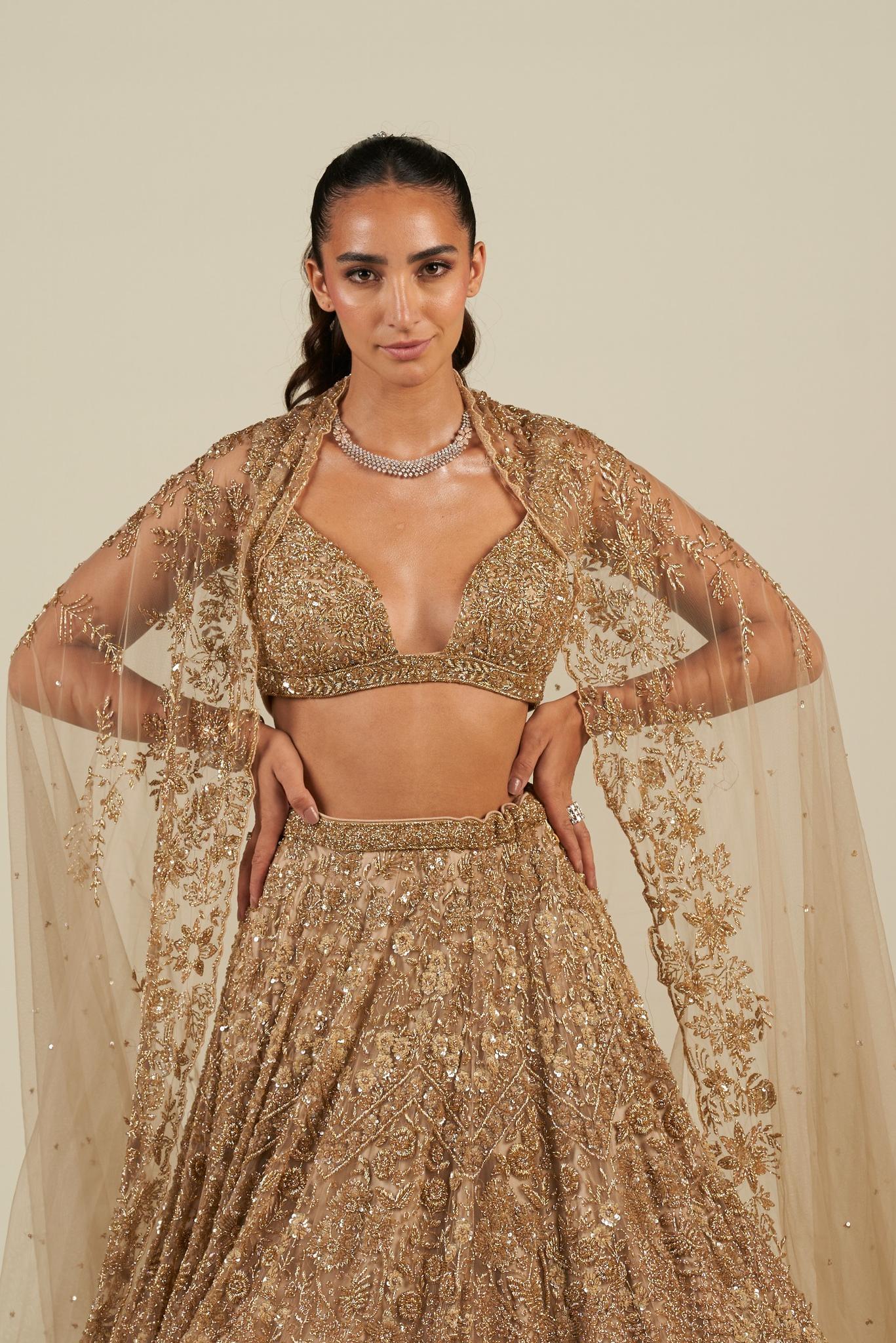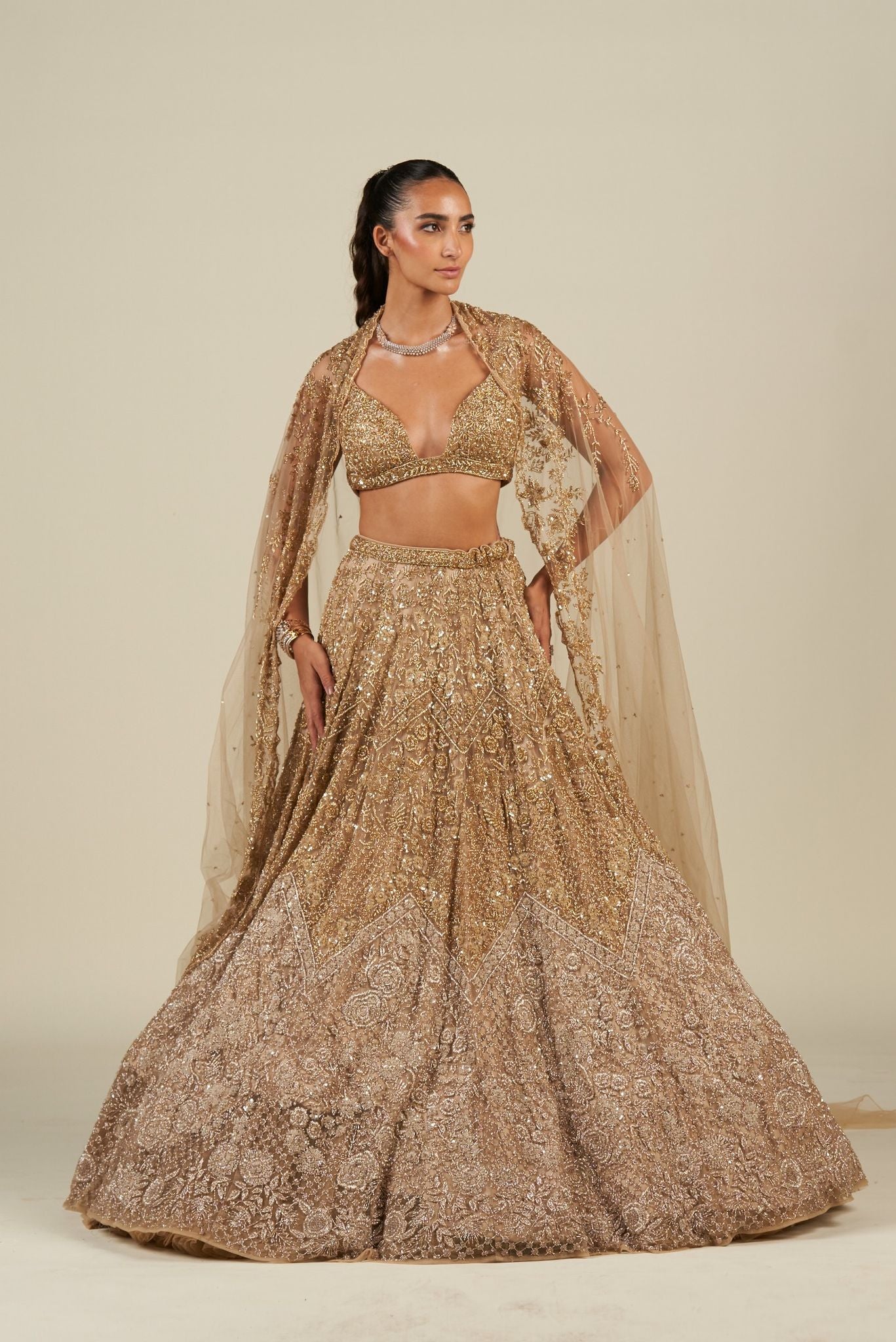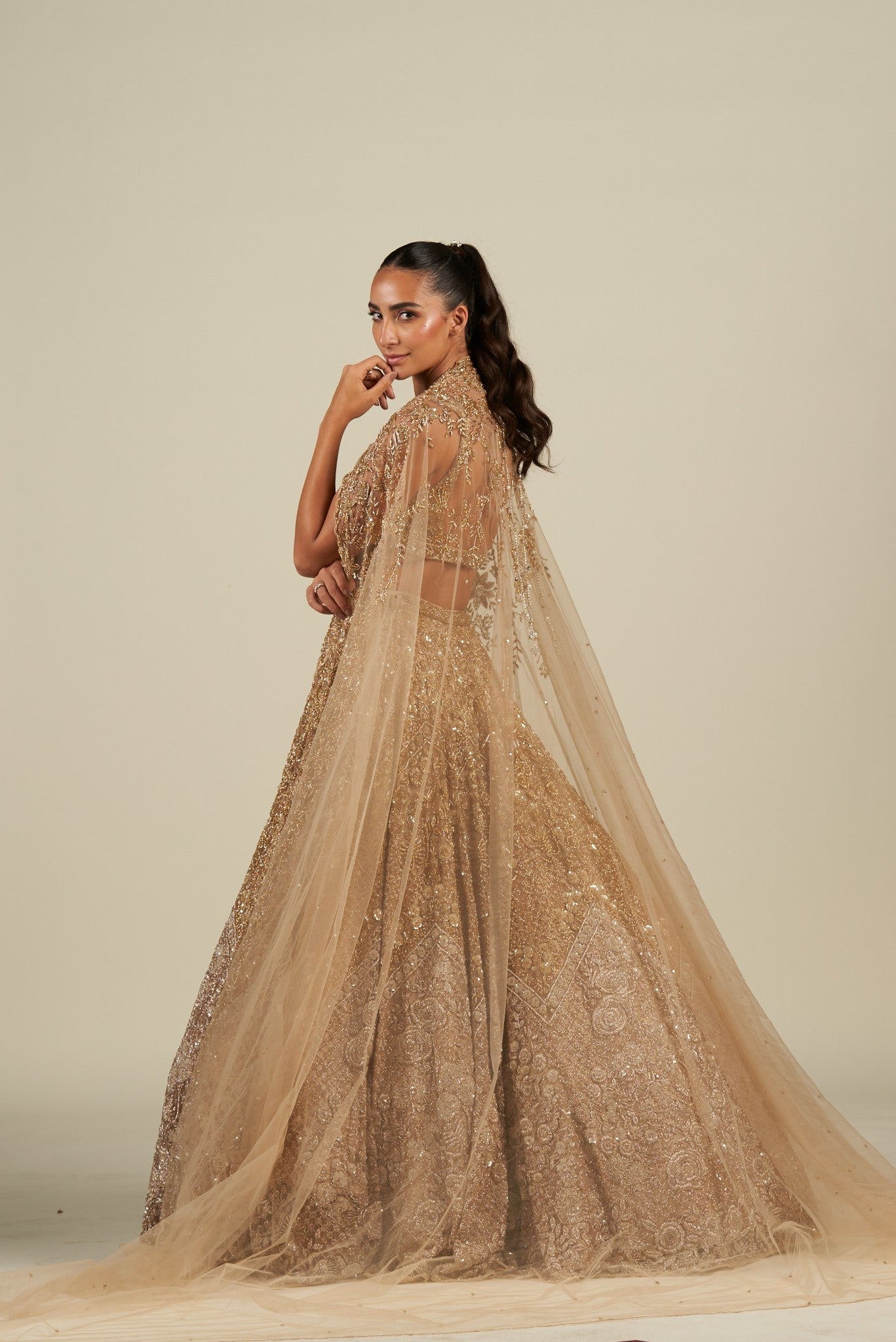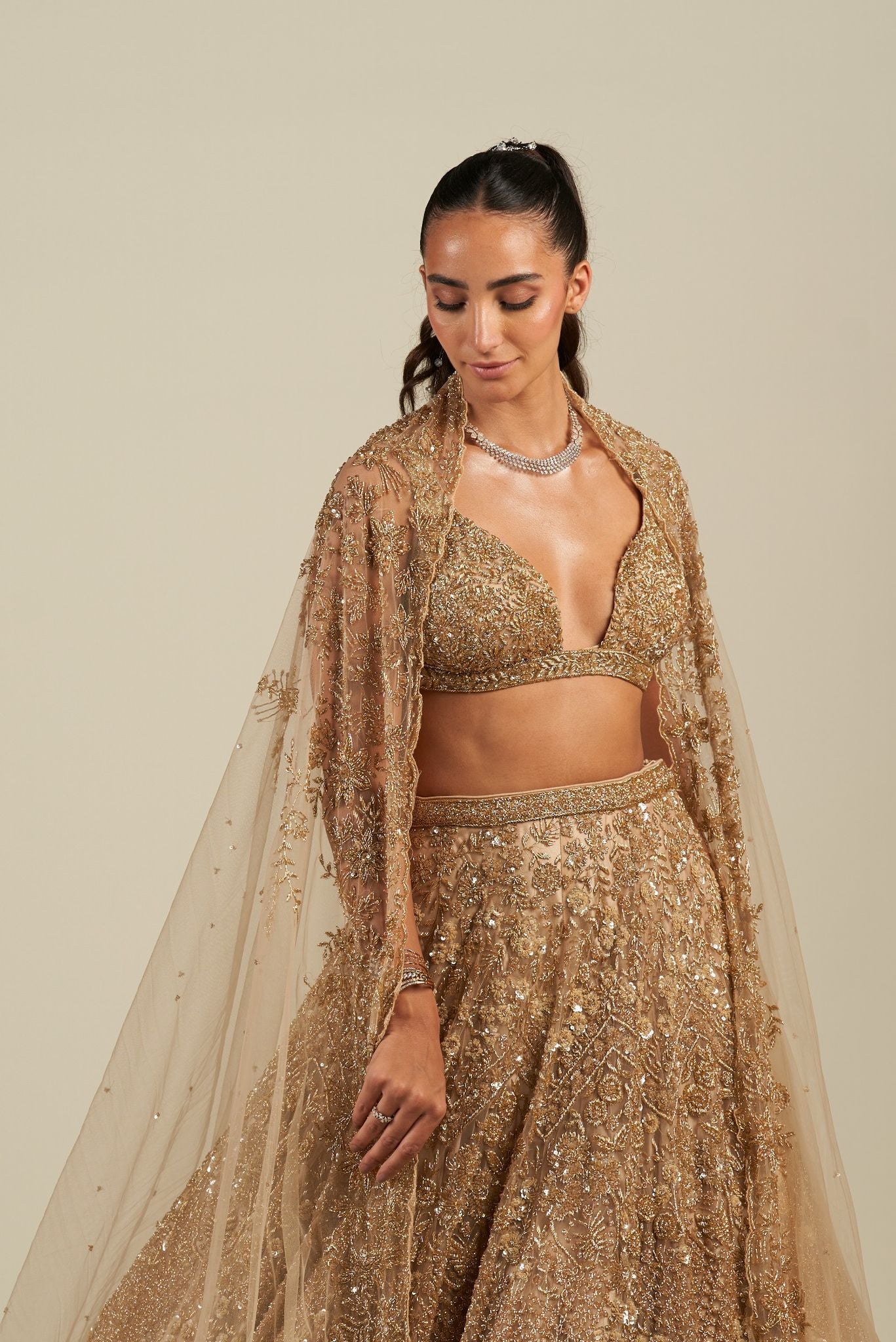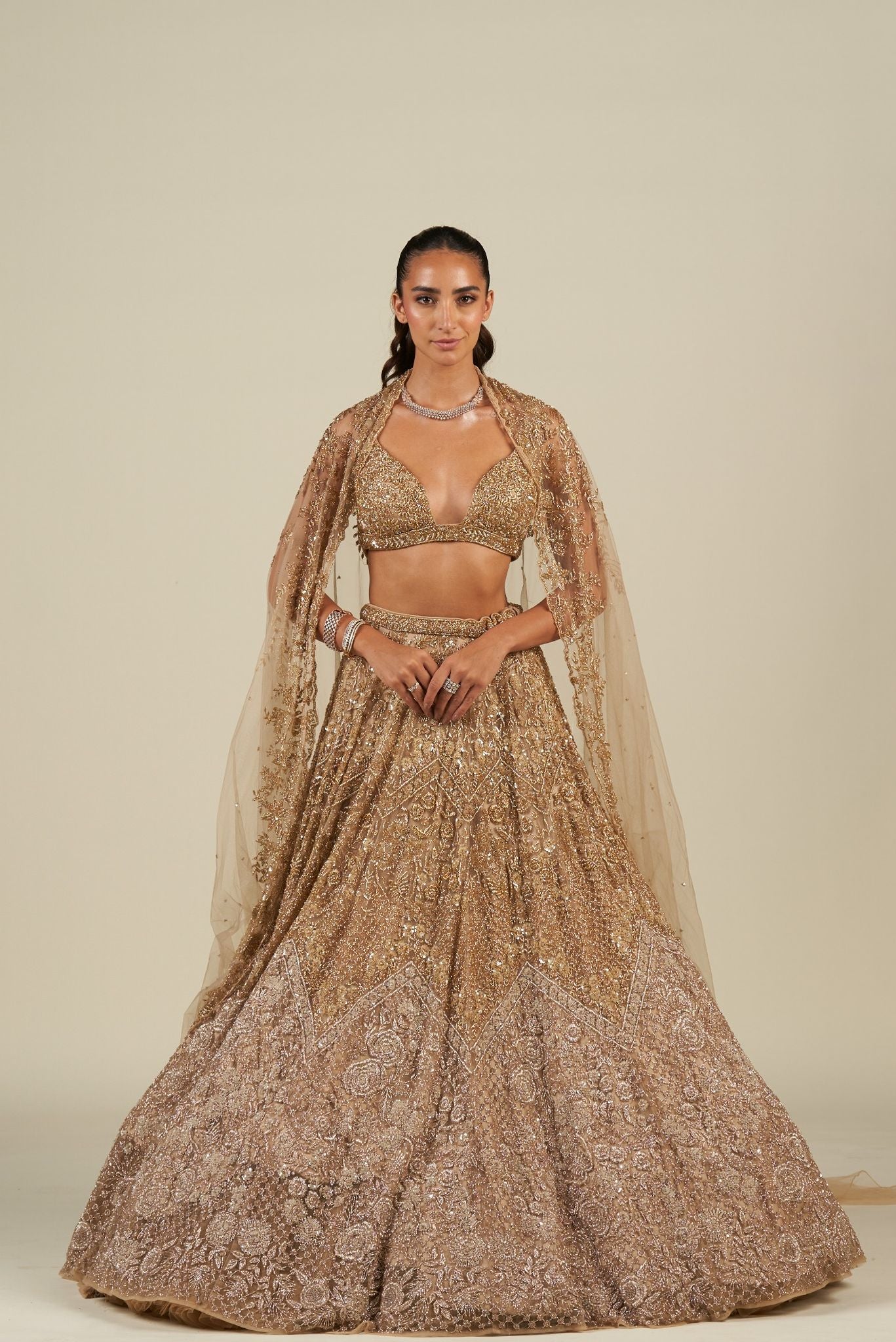 Featuring an ombre lehenga, meticulously hand-embroidered on tulle fabric with crystals, cutdana, sequin detailing. Paired with a cutdana and crystal detailed matching dupatta on tulle.