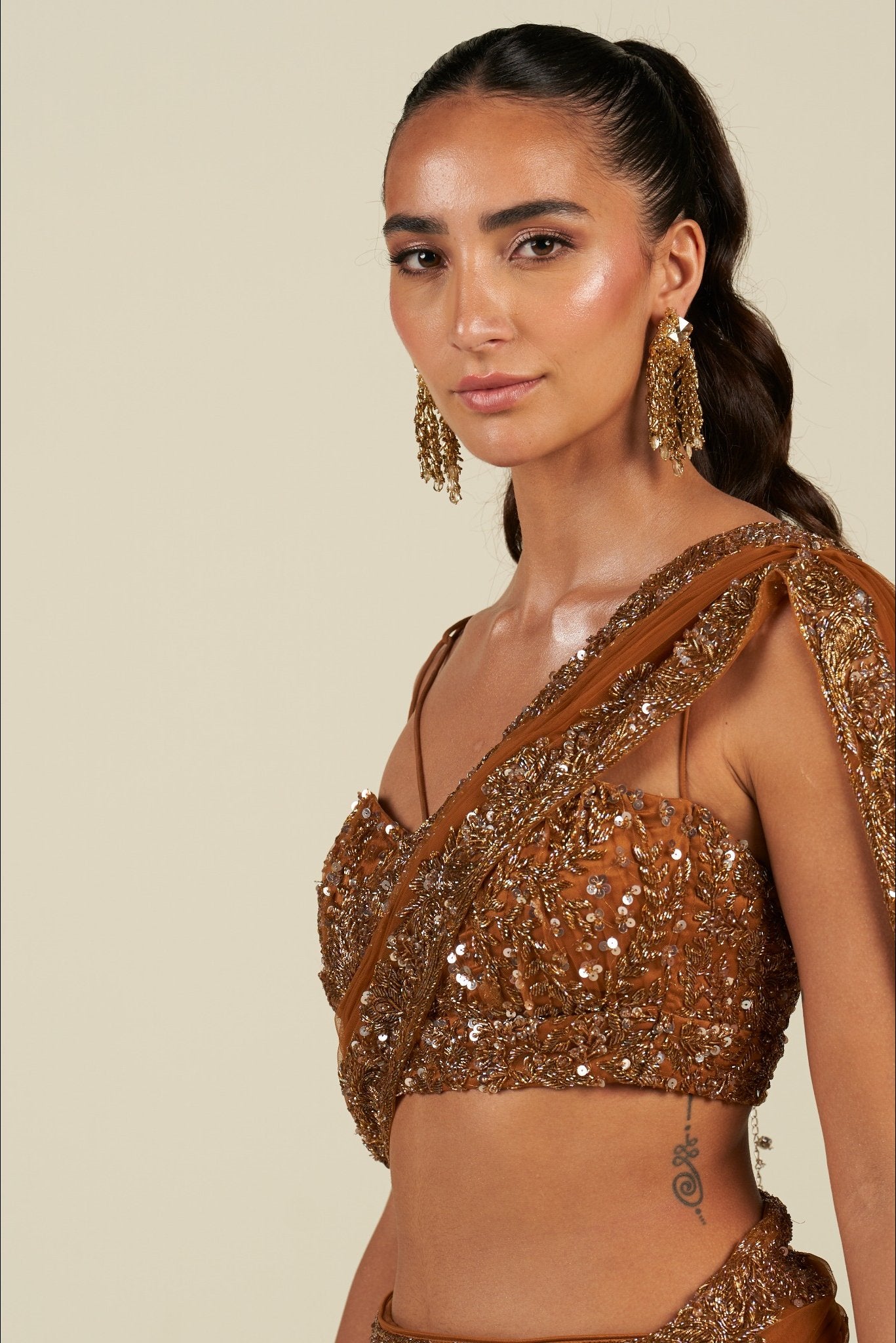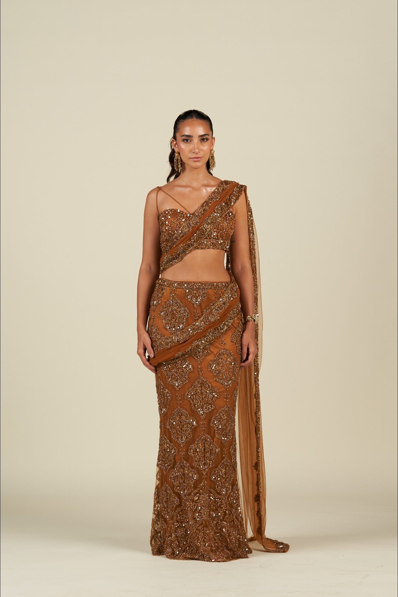 Featuring a mustard saree, meticulously hand-embroidered on tulle fabric with cutdana, sequin and crystal detailing and embroidered blouse .