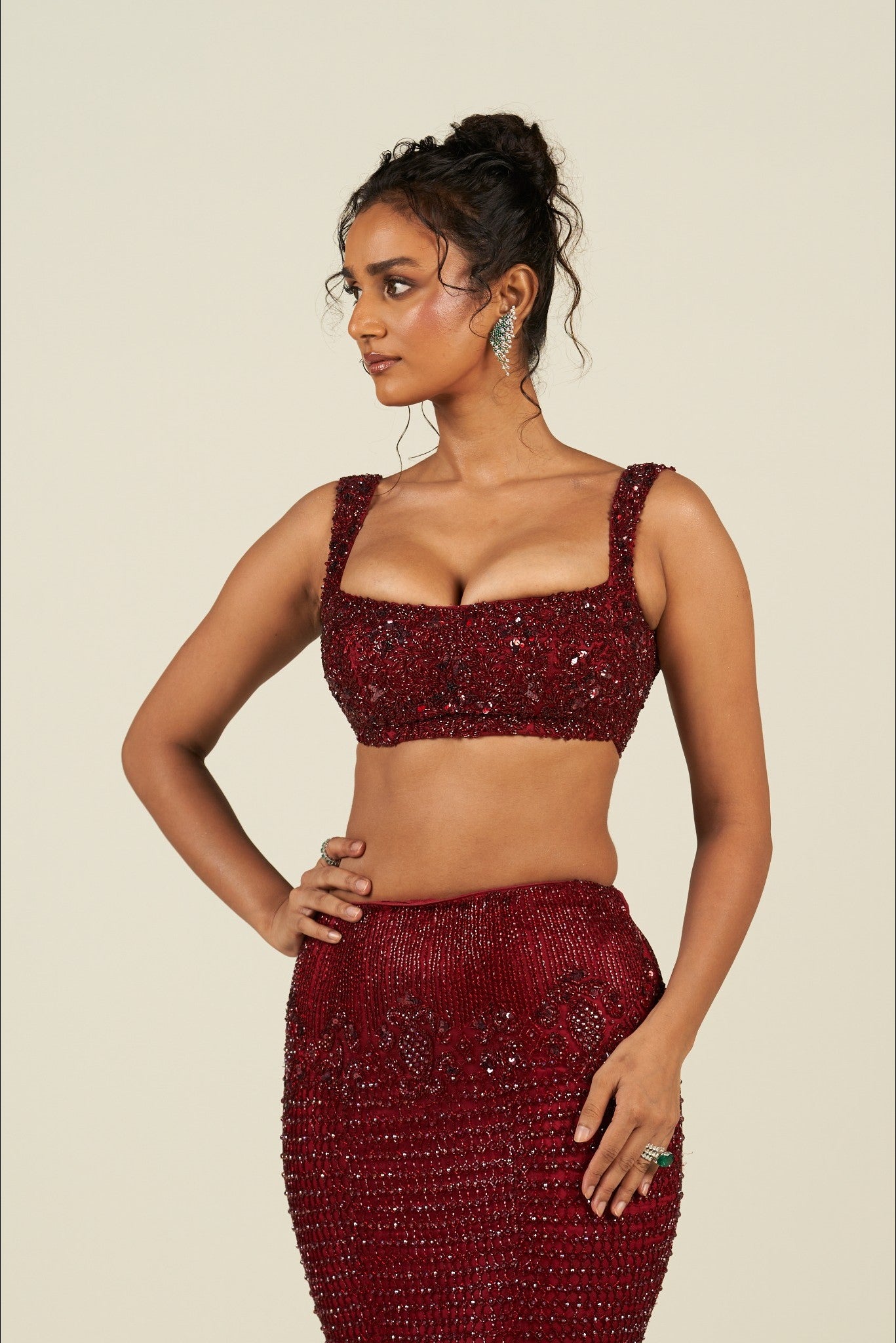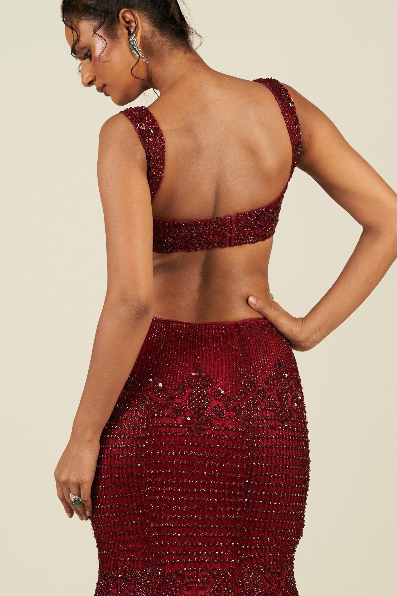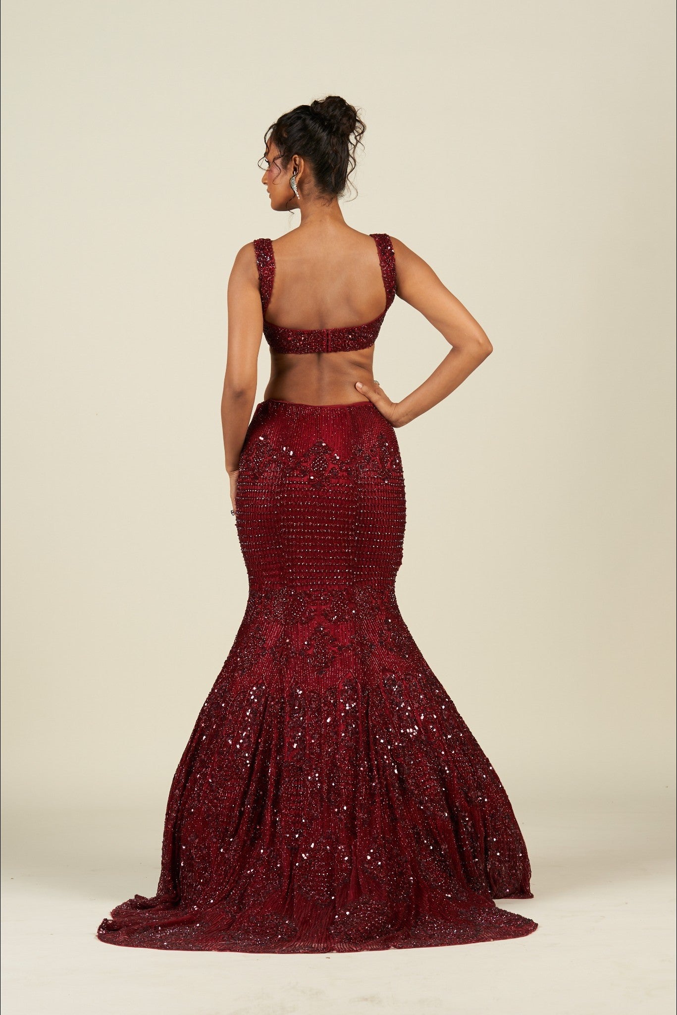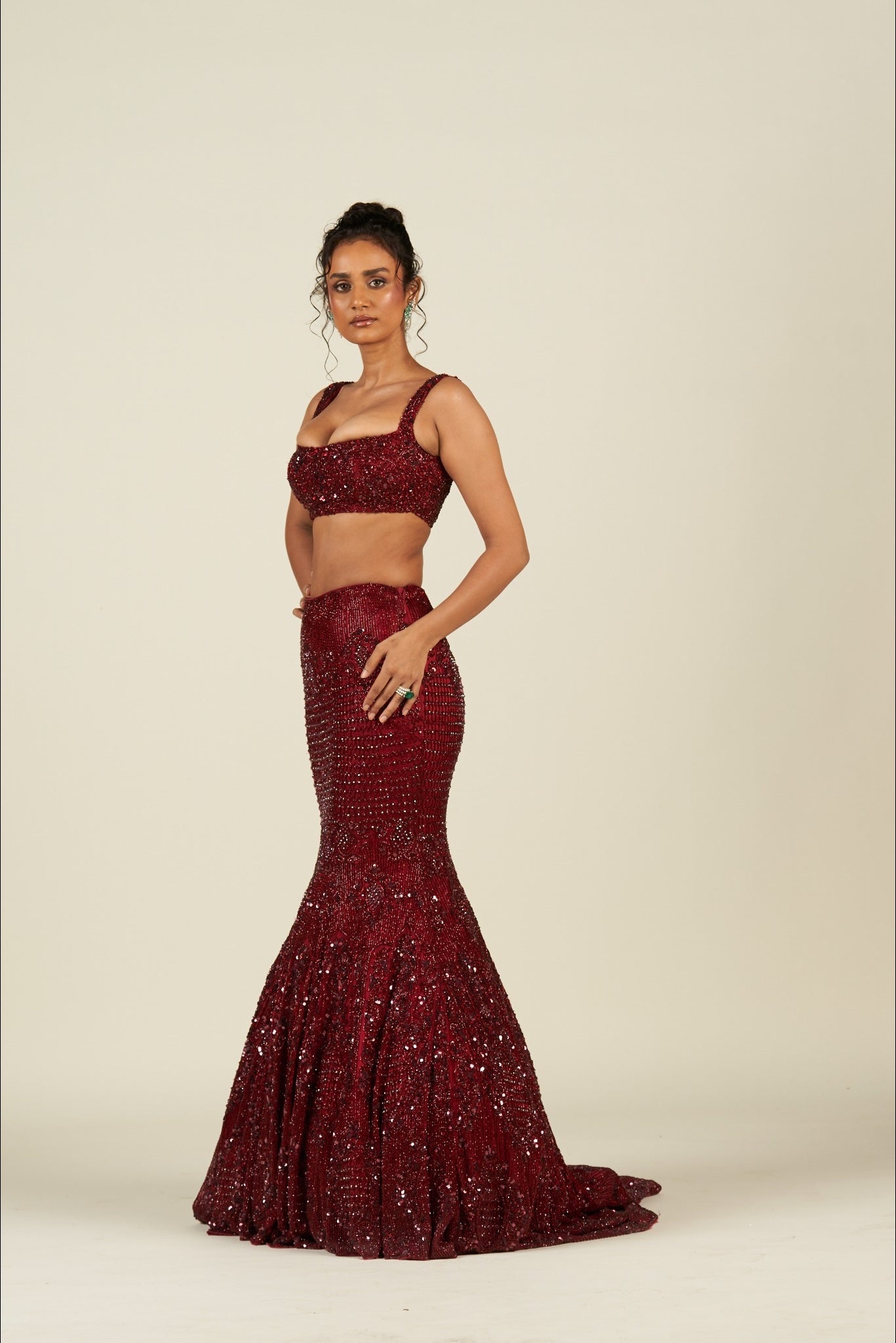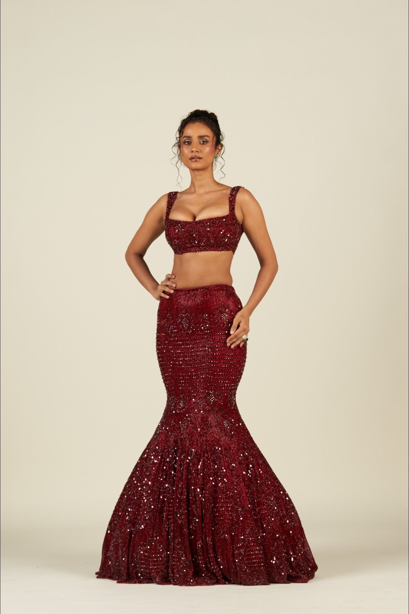 Featuring a red fish cut lehenga, meticulously hand-embroidered on tulle fabric with cutdana ,crystal and sequin detailing.