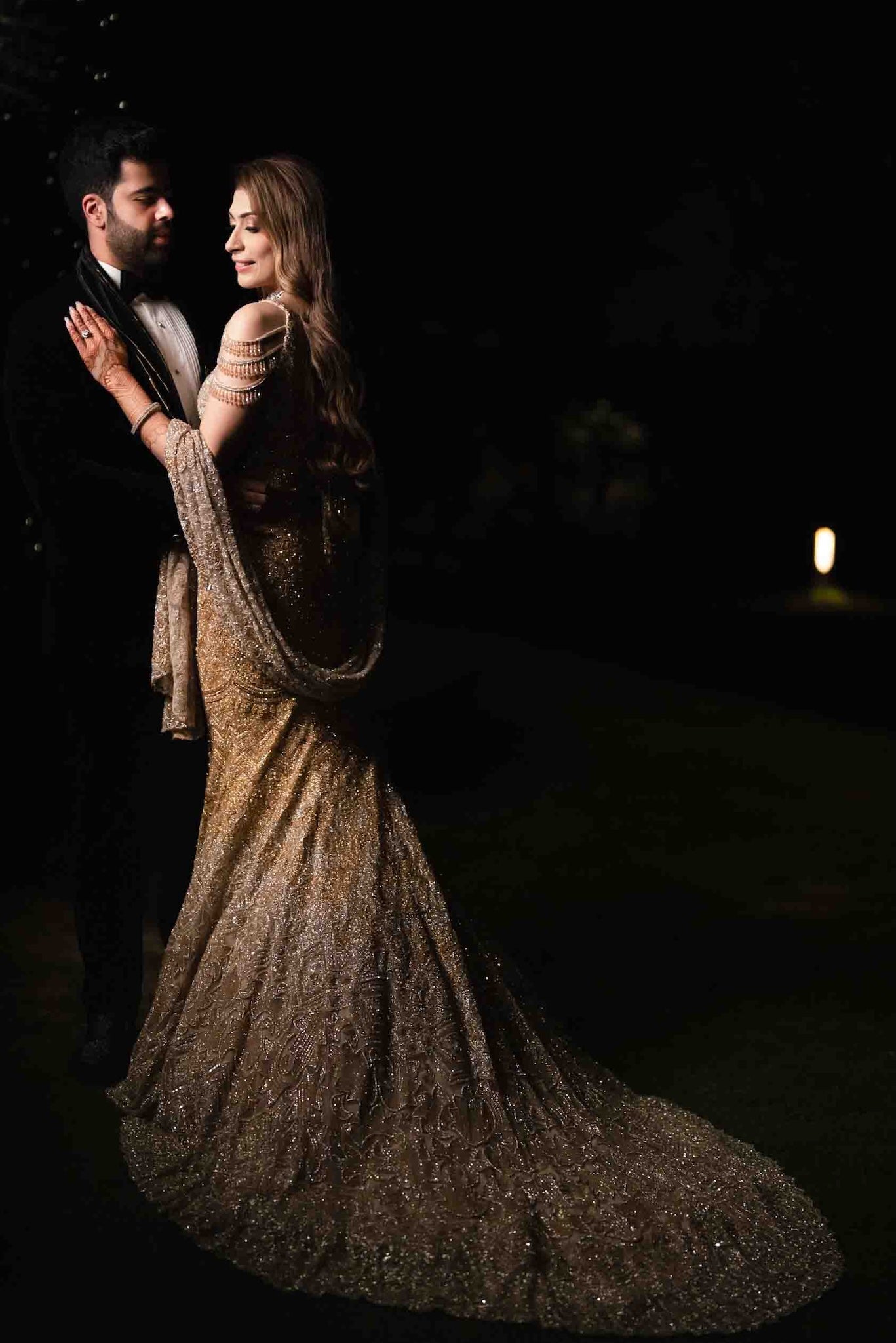 Featuring an ombre fish cut lehenga, meticulously hand-embroidered on tulle fabric with cutdana ,beads and sequin detailing. The blouse shows crystal tassels at the waist. Paired with a cutdana and sequin detailed matching dupatta with embroidery on all four sides.